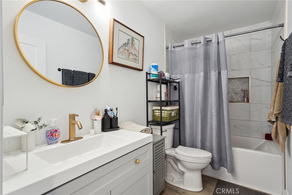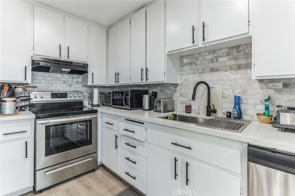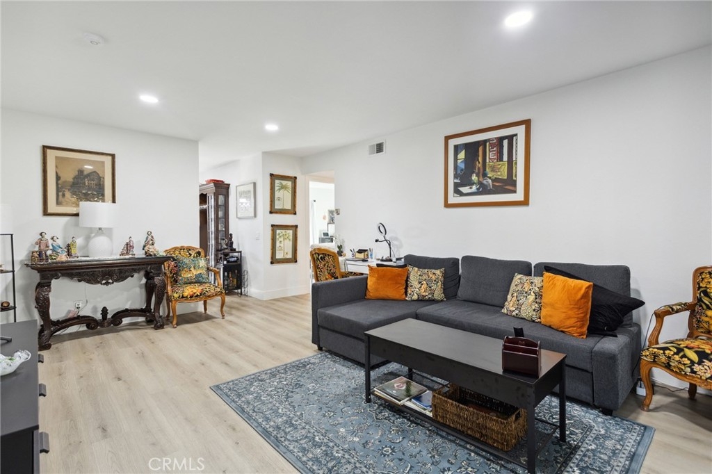Make this recently renovated 2 bedrooms 1 bathroom, lower end unit Condo your New Home. New wood laminate flooring, upgraded bathroom, beautiful kitchen with new appliances and quartz counter top. Kitchen opens up to your own private little court yard in the back. All the bedrooms have new closet doors with spacious closet space. Separate full size washer/dryer area. Community includes fully landscaped grounds, 3 swimming pools, enclosed play area. Great starter home or investment property. HOA includes, Water, Sewer, Trash, Landscaping Maintenance. No Mello Roos! Centrally located to 5 and 405 Freeways, close to many shopping centers, restaurants and entertainment... Come take a look today.