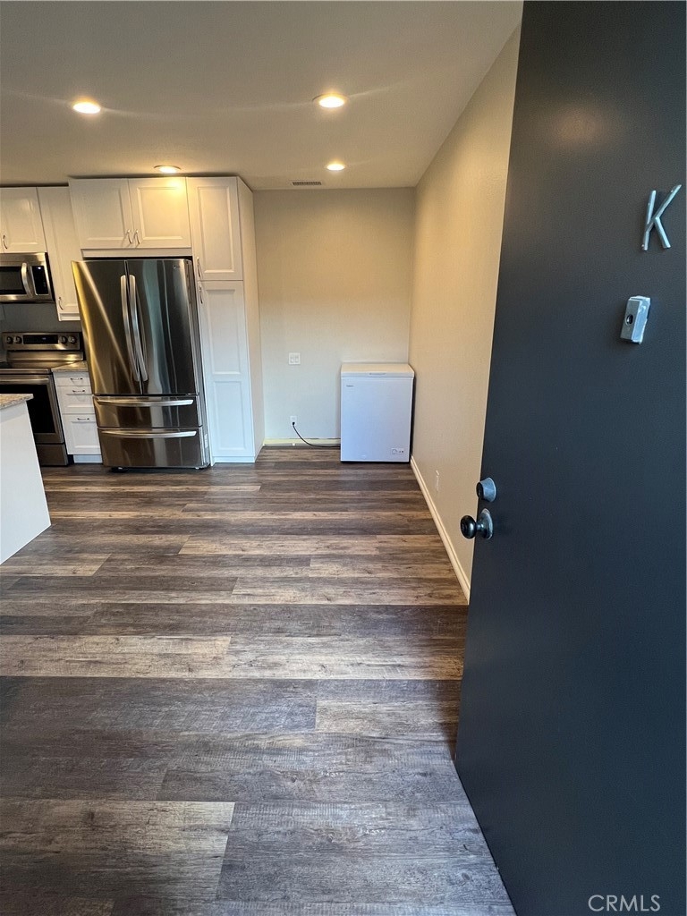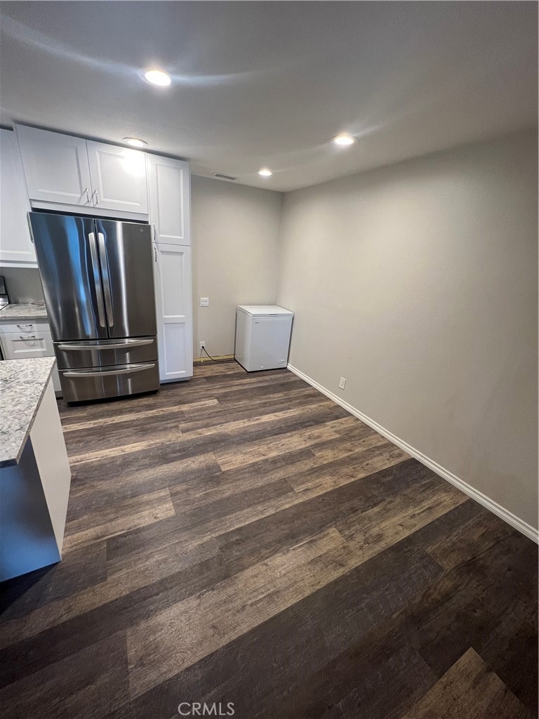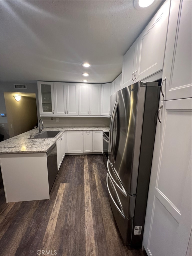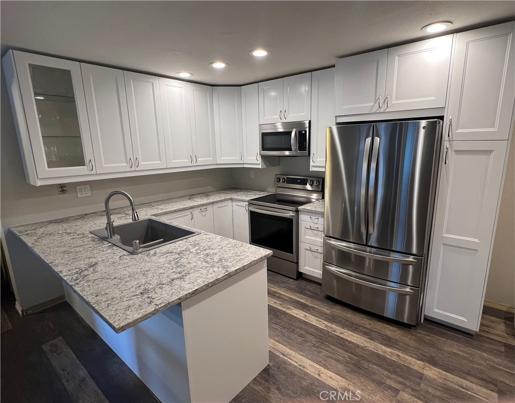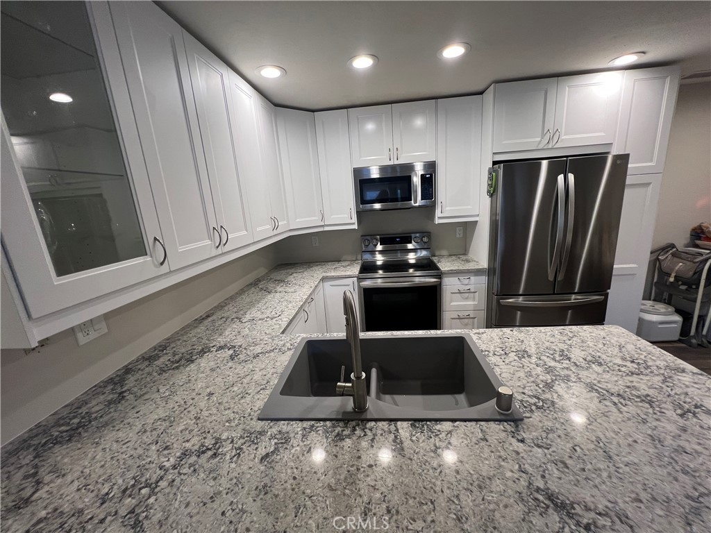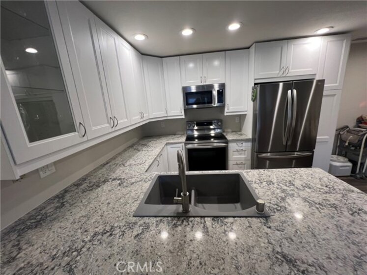 Priced reduced to $482,500. Beautifully updated 2 bedroom 1 bath condo located in popular Benchmark Villas in the heart of Lake Forest! Open floorplan with Newly remodeled kitchen -gorgeous countertops, stainless steel appliances. Refrigerator, washer and dryer included. Private balcony with storage closet and separate upgraded AC unit. All utilities except electric are paid as part of the HOA fee. Adjacent to the beautiful Rimgate Neighborhood Park. Located conveniently near shopping, schools and freeway access. Great Opportunity. A must see!. This unit may require special financing or cash. Washer, Dryer, Refrigerator included.