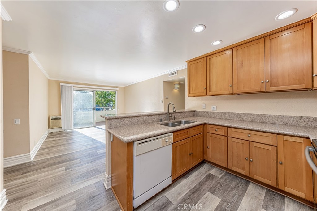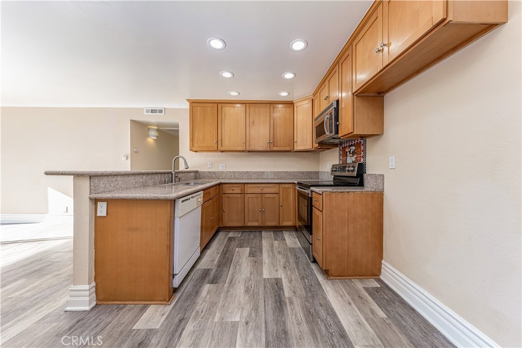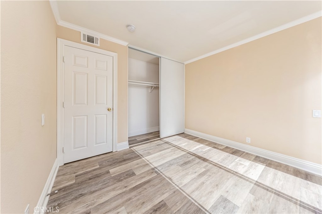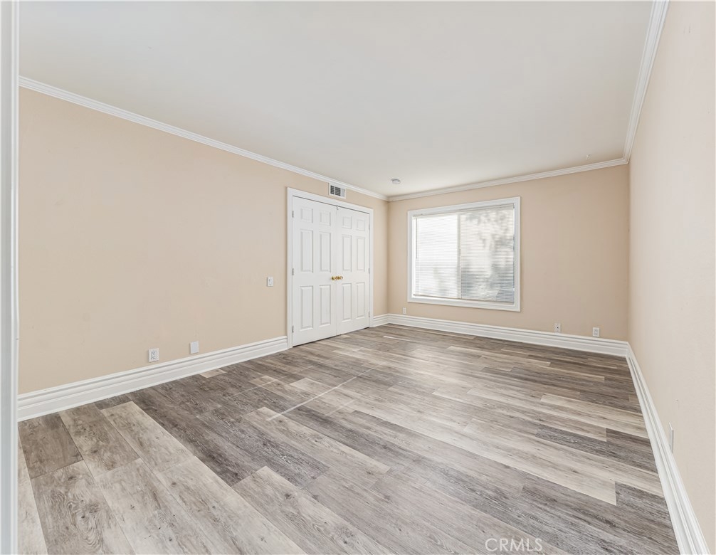 Beautiful two bedroom, one bathroom condo within the Bench Mark Villas Community in Lake Forest. Upon entering you are met to vinyl plank flooring, a bright living room, and open kitchen. The living room is sizable, offering a wall unit a/c, central furnace, and a patio slider opening up to the private balcony. In the kitchen you will find recessed lighting, a ceiling fan, granite counters, a breakfast bar, and adjoined dining area. Appliances include an electric range/oven, microwave, and dishwasher. Nestled in the hall is a laundry closet with gas/electric dryer hookups and a full bathroom. French doors open up to a spacious master bedroom featuring a large sliding door closet with organizers. The guest bedroom is also roomy with a standard closet and balcony access via an additional patio slider. Two permit parking passes are assigned to the unit. The community boasts a tot-lot and paid water, sewer, and trash. Only minutes away from Rimgate Park, El Toro Memorial Park, El Toro & Trabuco Mall, Sycamore Plaza, and many more shopping centers and eateries!