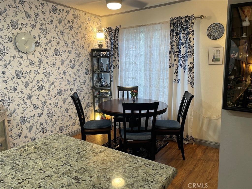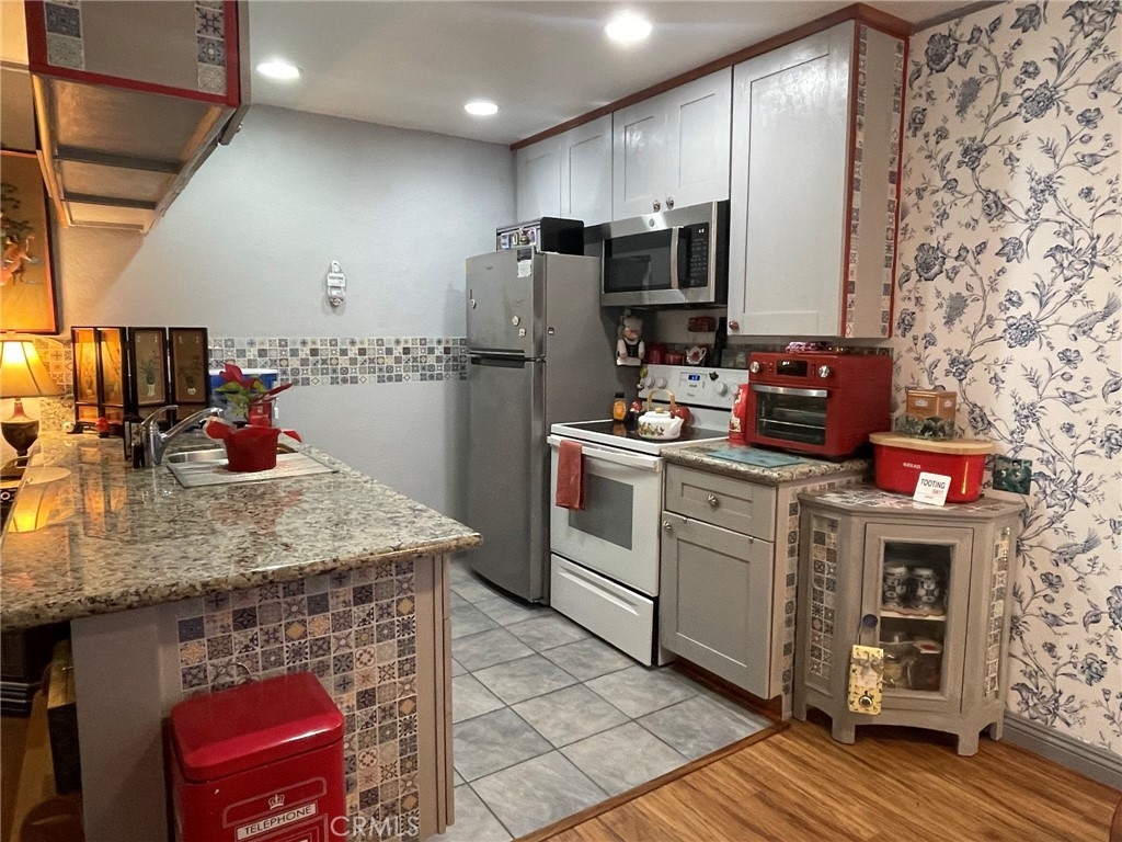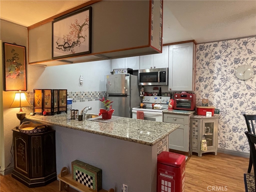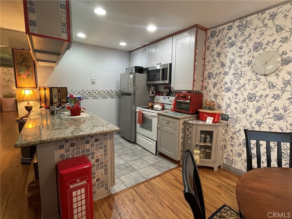Welcome home to this turn-key, beautiful Condo located in the most prime location in the Bench Mark Villas community just 15 mins drive from the World famous Laguna Beach!This is a pleasant green area corner unit looking out to Rimhurst Drive. Entering through the front door you are greeted by an open and spacious living room, dining area, and kitchen. There is continuous luxury vinyl plank flooring throughout this condo, kitchen and a new bathroom unit with beautiful Stone Tiles. The kitchen is updated with granite countertops, custom porcelain cabinet pulls, and ample cabinet storage. The dining room has a large dual pane window overlooking the community greenery and park. Walking down the hallway to your left is the guest bedroom, with a large sliding glass door for ample natural light and a beautiful chrome and crystal fan, with retractable blades. The main bedroom is huge, with a beautiful, crystal chandelier and a wall of floor to ceiling closets. The beautifully updated bathroom has a custom built, new shower stall with non-slip flooring and bars for safety. This home has 2 Split Type Air Conditioner units … A must in the 100-degree temperatures due to Climate change! The same units provide ample heat in the winter. The patio is oversized, with a huge storage closet. Water & trash included in HOA dues. Buyer To Verify Square Footage on Their Own. Newer Dishwasher & Microwave. 2 permitted parking spaces. Welcome home! Please submit a complete offer with POF's, scores for all borrowers & lender approval.