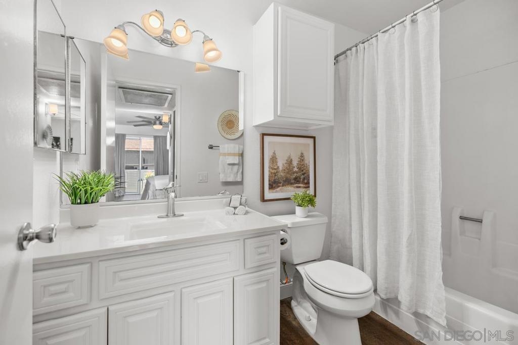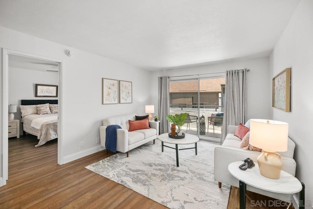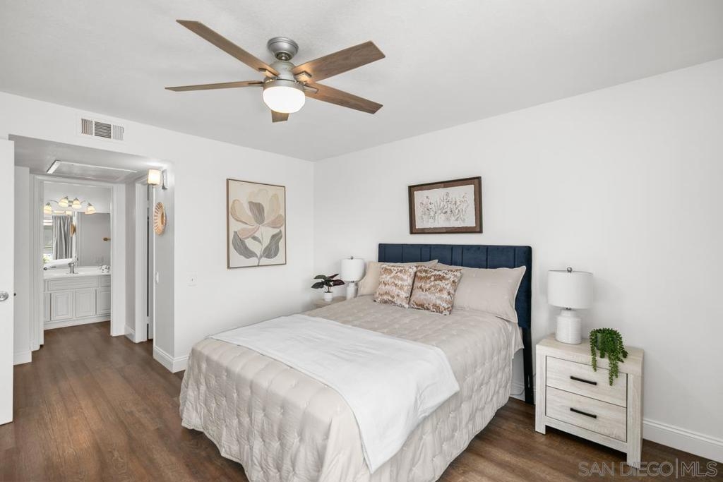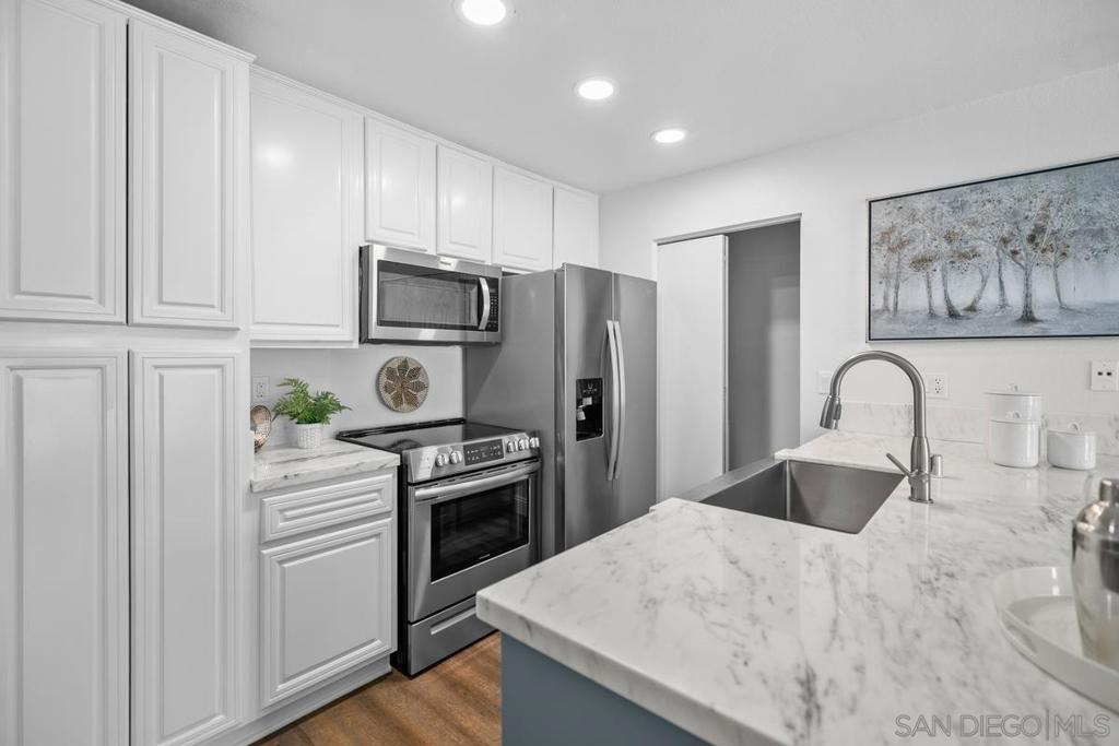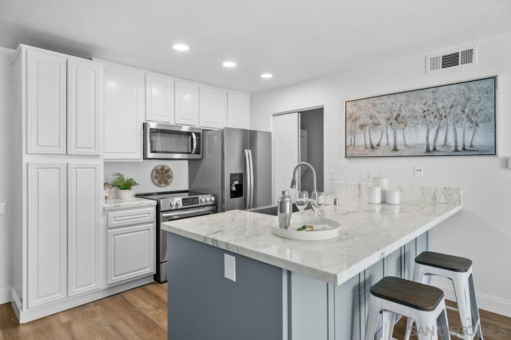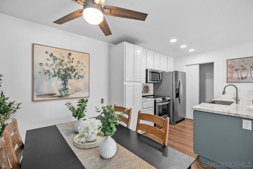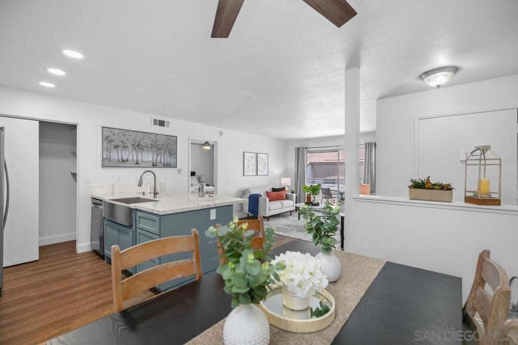 Stylish single level upstairs unit offers the perfect blend of comfort and sophistication. Beautifully designed upgraded kitchen complete with large pennisula island & wrap around custom cabinetry, contemporary counters, large stainless sink and appliances, recessed lighting. Two toned cabinetry offers a chic vibe. Walk-in pantry with stacked washer/dryer. Open concept floor plan is bright & airy with beautiful updated flooring throughout. Elegant dining space & large contemporary living area flow seamlessly for entertaining. Beautifully designed top floor unit with upgraded kitchen complete with large pennisula island and two toned cabinetry elevate the everyday cooking experience. Elegant dining space and large contemporary living area flow seamlessly for easy entertaining and open to a large outdoor deck balcony. Perfect for BBQing. The primary bedroom is spacious and elegant and features a walk-in closet, a seperate hall closet and modern ceiling fan. Ensuite bath with modern fixtures. The bedroom also opens to the private outdoor deck area with walk in storage closet. A great space for enjoying the California outdoor lifestyle. Water and Trash included in HOA dues. Close to Rimgate Park, hiking trails and wonderful shopping and restaurants.