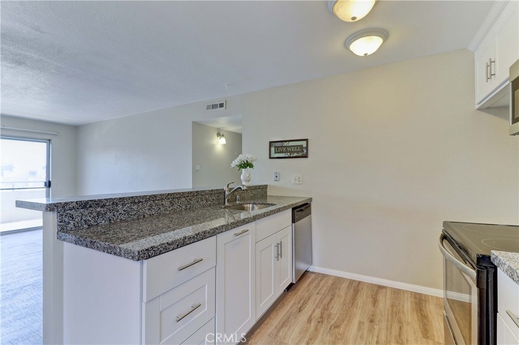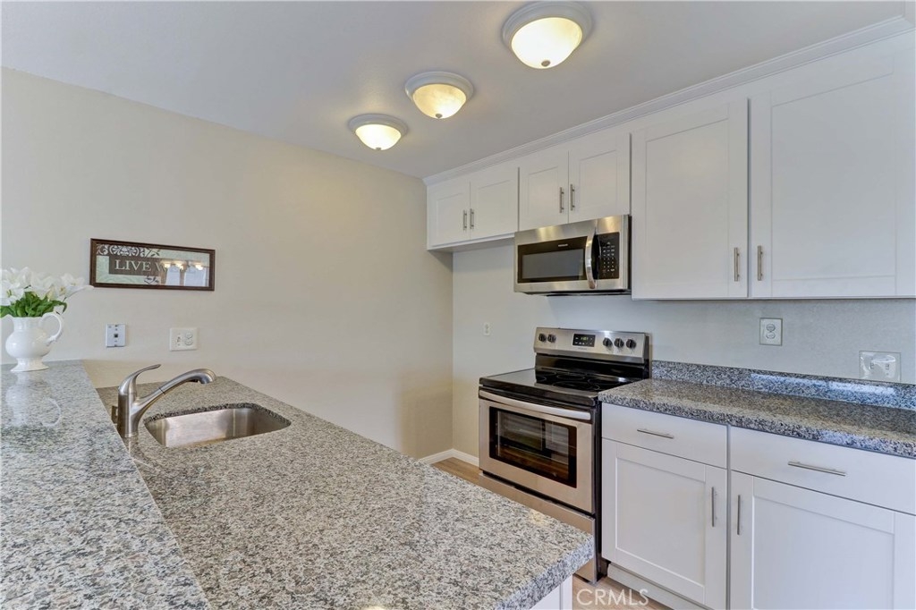 Newly remodeled! Gorgeous two bedroom condo in the Bench Mark Villas Community in the heart of Lake Forest. This upstairs end unit offers a bright, spacious floor plan with lots of natural light. Living room opens to balcony with view of trees. Newly remodeled beautiful kitchen with granite counters, new cabinets and stainless steel appliances. New designer paint color and flooring. Beautiful custom tile bath. The balcony has just been updated with new decking. Indoor laundry with washer and dryer included. Additional storage closet on the balcony. Resident parking and plenty of guest parking. Water and Trash paid by home owner's association. Minutes to the Orange County Great Park with sports, arts, farmers market and so much more recreation and entertainment! Close to shopping and dining. Walk to nearby Rimgate Park for playground, picnics, tennis, basketball and hiking trails.
