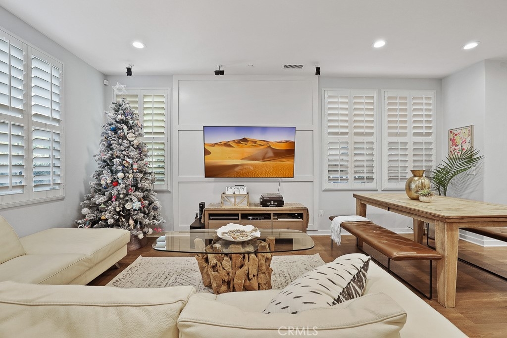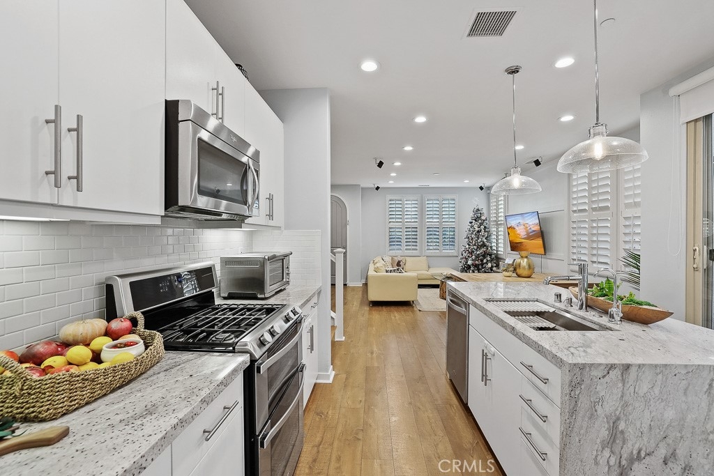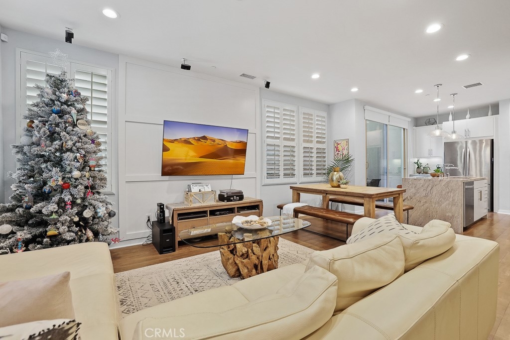 Welcome to 112 Wild Rose, a 3-bedroom 3-bathroom townhome located in the charming Brookland neighborhood of desirable Baker Ranch. This exceptionally maintained community is sure to please and full of amenities. Just inside the charming blue door entry set amongst mature trees, a light and bright open concept great room is revealed. The dining area & kitchen are set adjacent, and all are set with seamless luxury vinyl plank flooring throughout. The on-trend kitchen includes white shaker-style cabinetry with modern hardware, granite counter tops, a large waterfall island with upgraded Kohler prolific sink and breakfast bar, and stainless-steel appliances. Just outside the kitchen lies a private patio, accessible through a large sliding glass door, ideal for entertaining or relaxing. Plantation shutters, recessed LED lighting, tall dual pane windows, additional storage space and cabinets are included throughout this home. Each bedroom enjoys abundant natural light through plantation shutters and blinds. A generous main bedroom ensuite bath includes a fully upgraded master shower with frameless shower glass and a Kohler Hydrorail with 10" rain head and shower wand. The generously sized 2 car garage conveniently includes an outlet for EV Charging. Additional upgrades include a Tankless water heater and whole house water softener. Passage Park is located just steps away from this home and offers a tot lot, sand volleyball, BBQ pavilion, and large grass area to enjoy the outdoors. Community amenities include access to The Grove clubhouse with pool and spa, hiking & biking trails, and parks throughout the community. Commuting is a breeze as this home is ideally located close to the 241-toll road and 5 freeway. Welcome Home!
