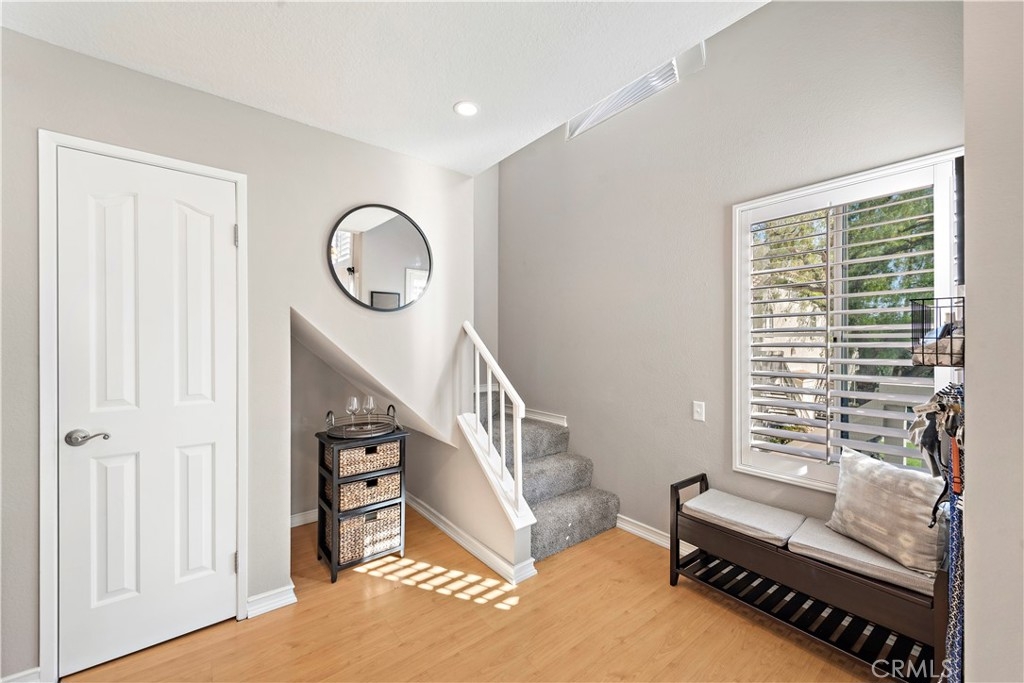 2 BED + LOFT carriage unit with 1 car detached garage in the fabulous Canyon View tract of Portola Hills. The loft provides endless possibilities as a home office, home schooling space, hobby room, or could easily be converted to a third bedroom! Carriage style configuration (garages below living space) with no neighbor above or below. Features and improvements include 1.25 Bathrooms, New AC & Furnace, New Interior Paint, New Carpet in loft, Custom Kitchen Cabinetry & Stainless Steel Appliances, dual pane windows and plantation shutters, abundant recessed lighting, vaulted ceilings, outdoor terrace, inside laundry closet.