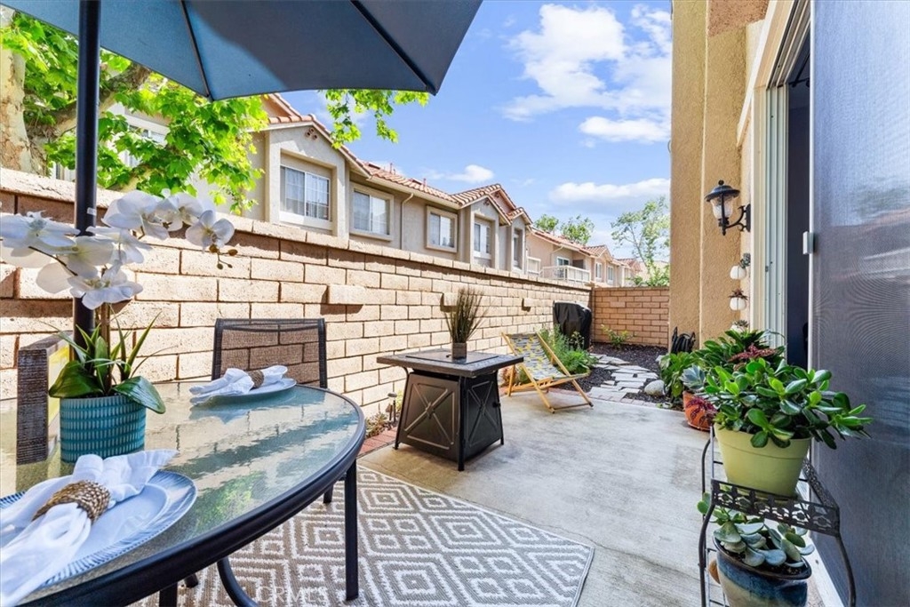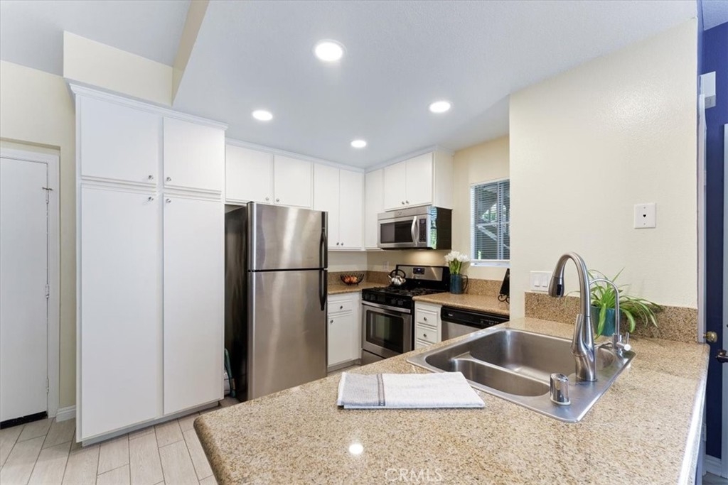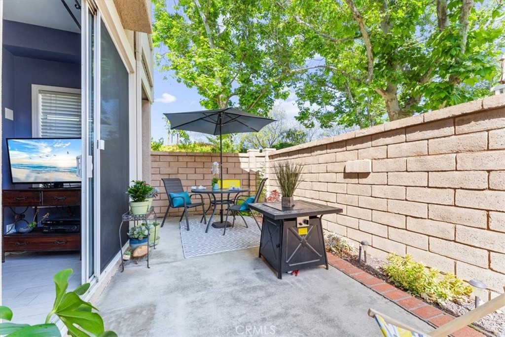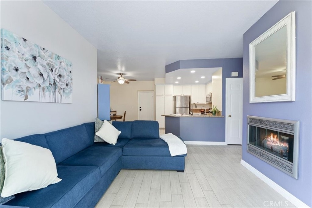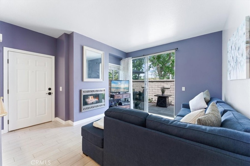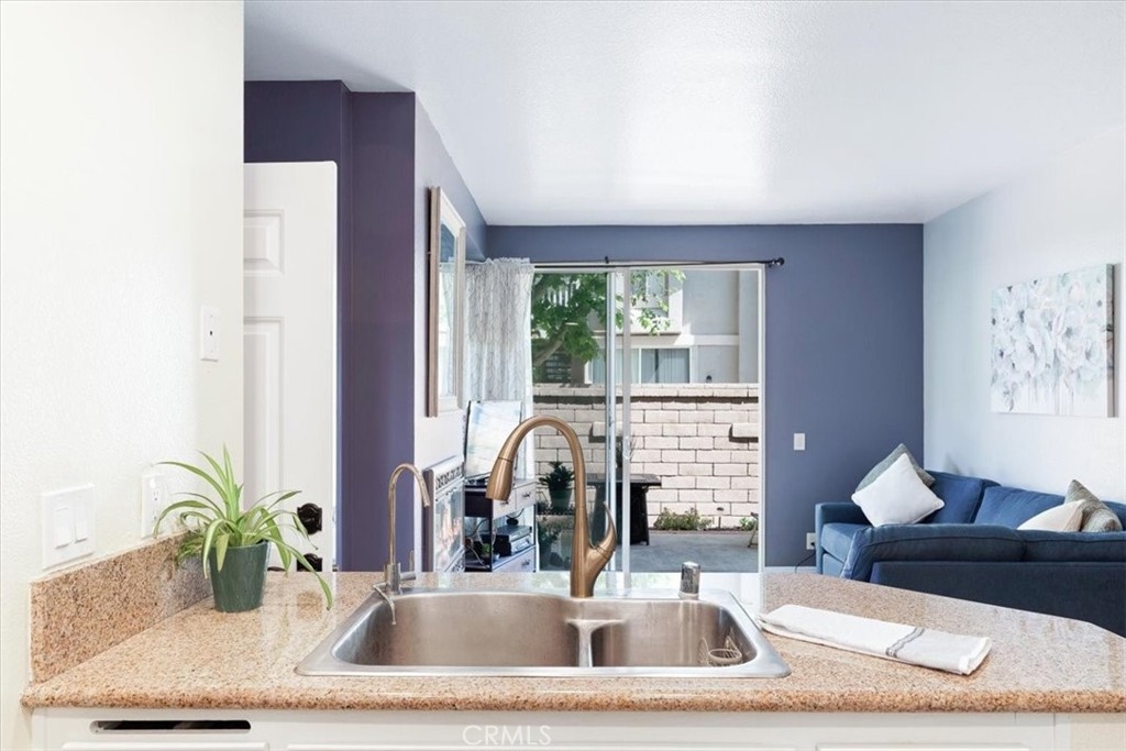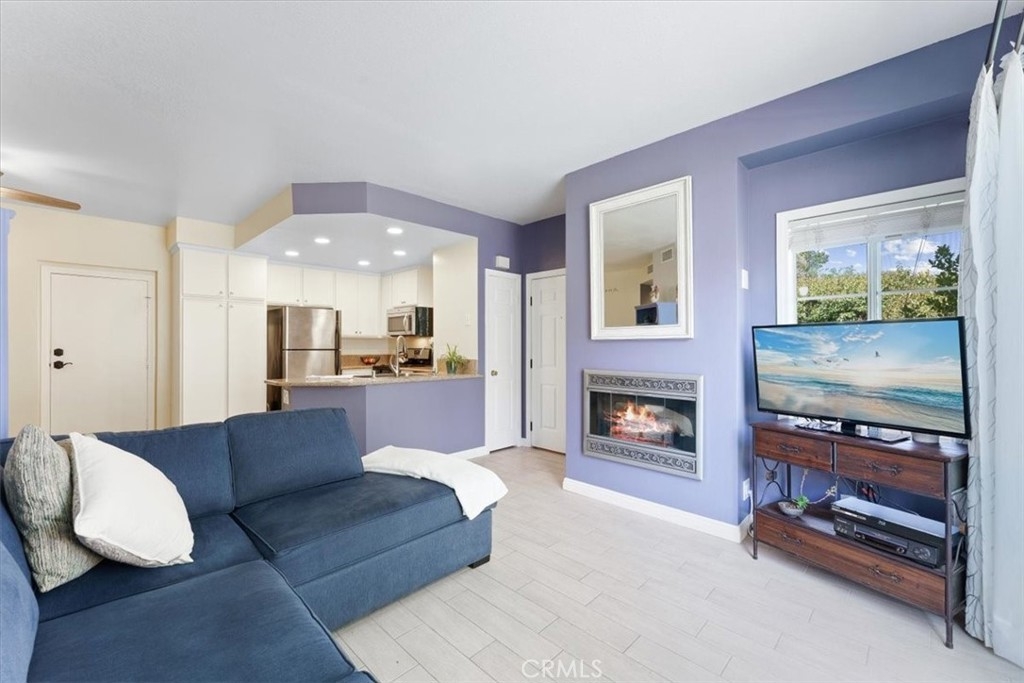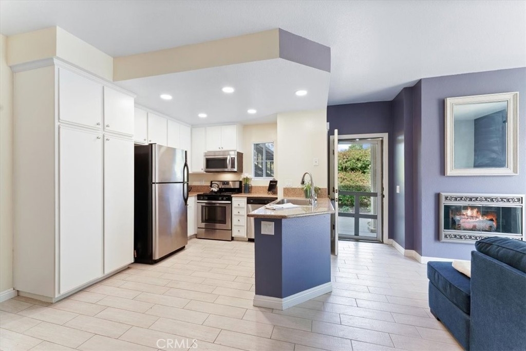 Exceptional location! End unit, 2 bedroom , 2 bath located on ground unit and direct access garage. Open family room /kitchen and sliding glass door leading to your own patio. Stainless steel appliances in kitchen with granite countertops , can and recessed lights and fireplace in Family room. Laundry in unit.