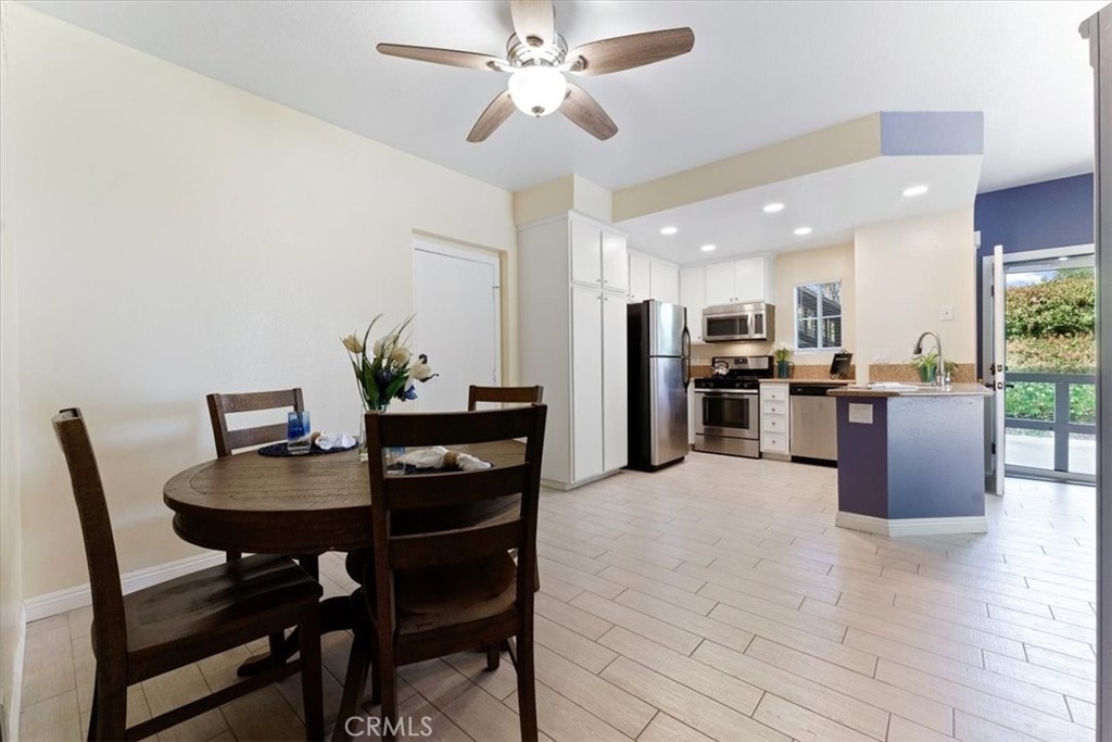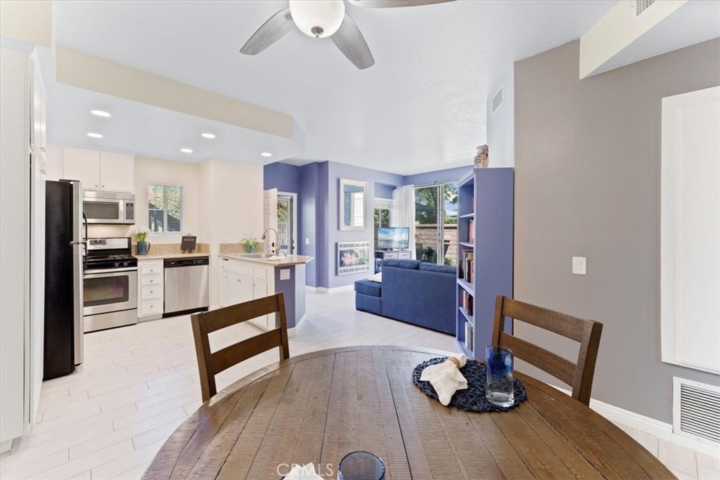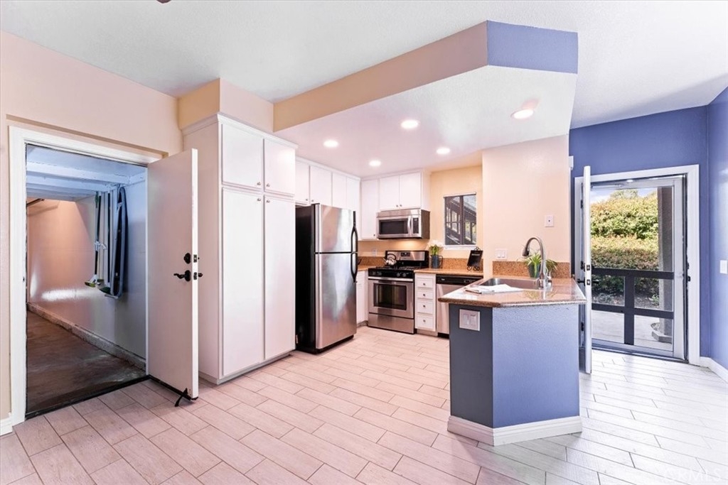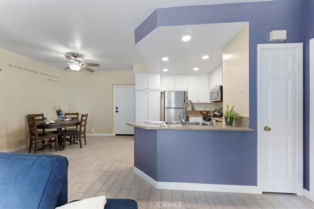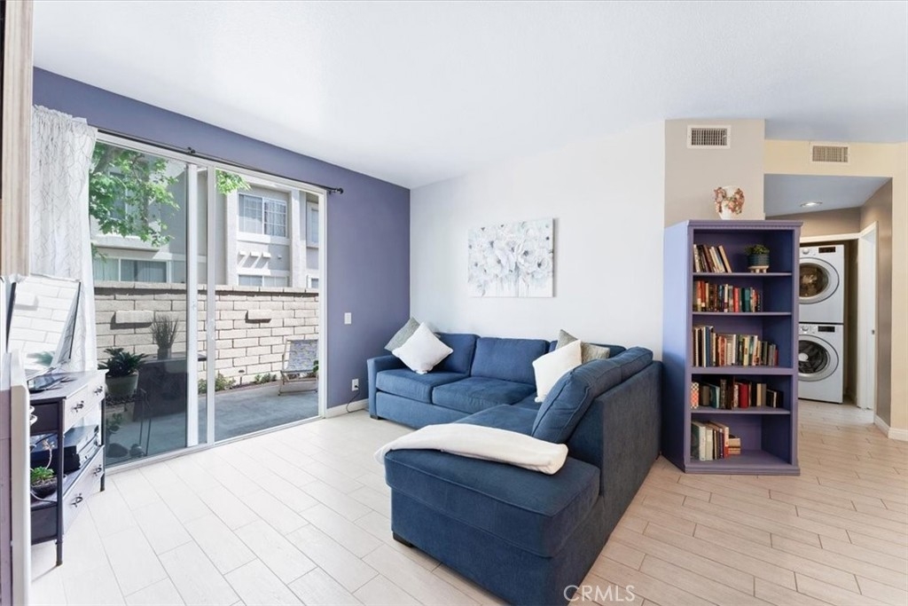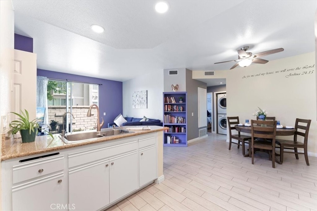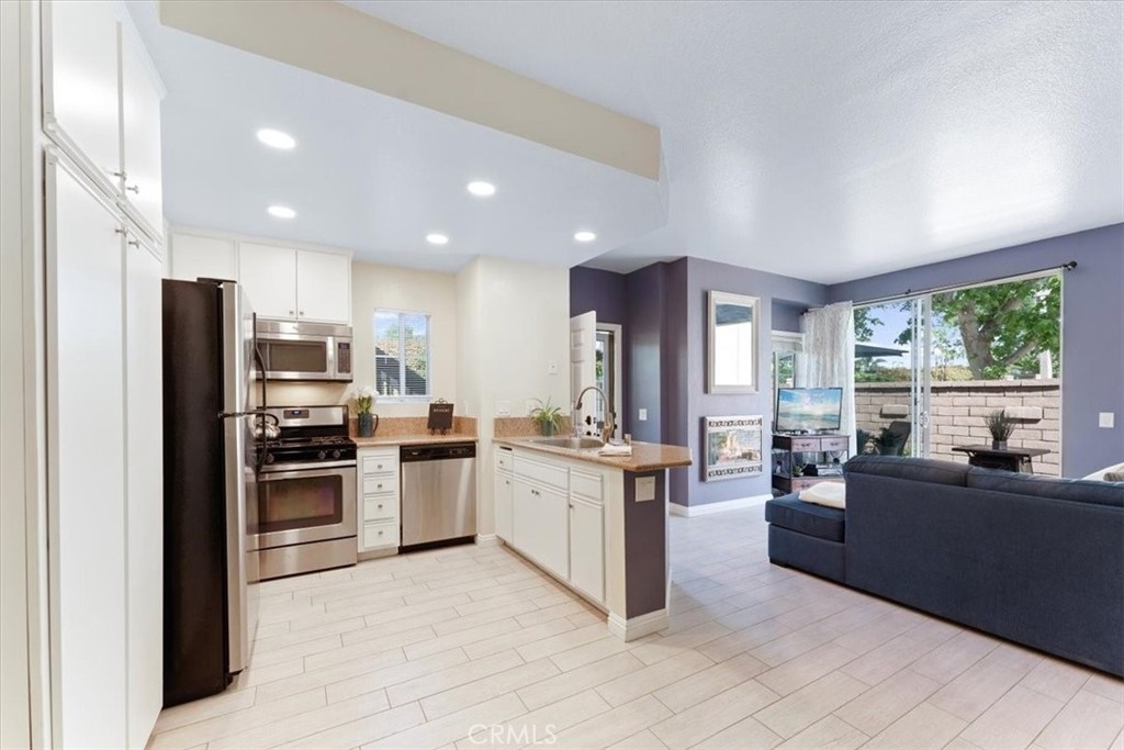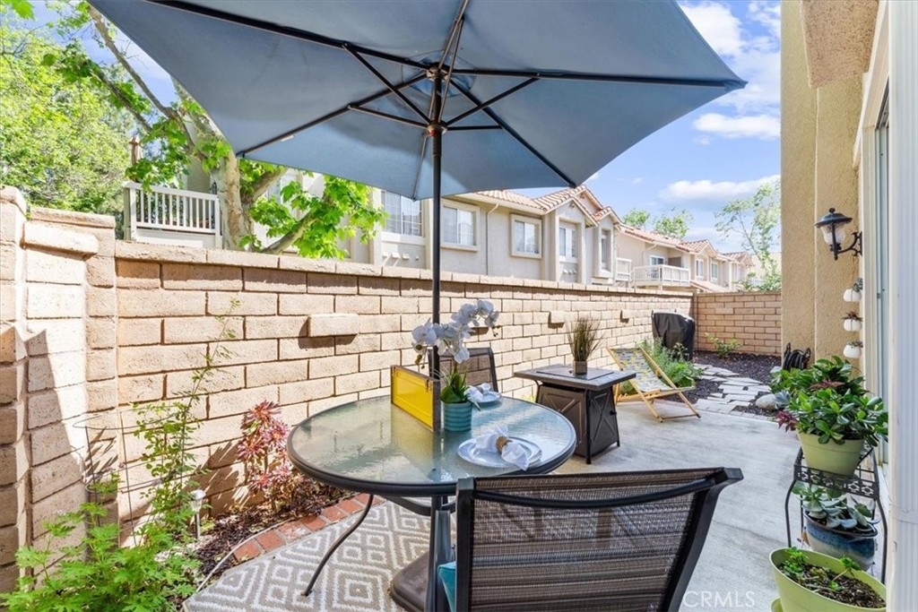 Exceptional location! End unit, 2 bedroom , 2 bath located on ground unit and direct access garage. Open family room /kitchen and sliding glass door leading to your own patio. Stainless steel appliances in kitchen with granite countertops , can and recessed lights and fireplace in Family room. Laundry in unit.