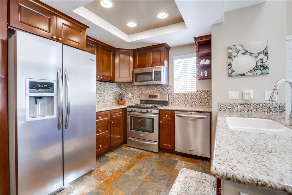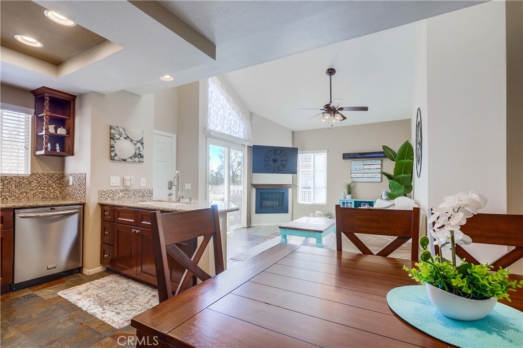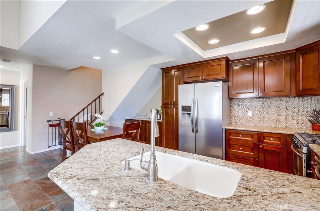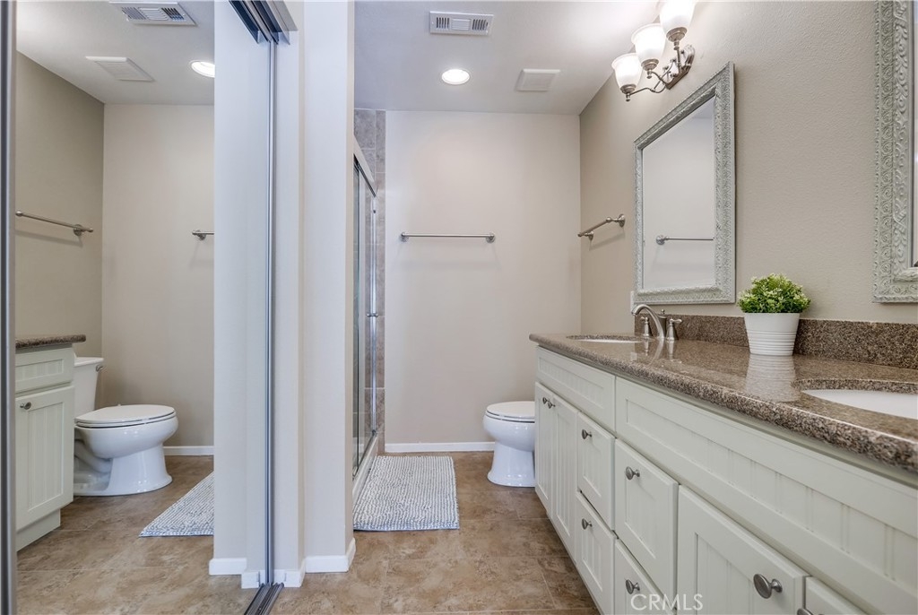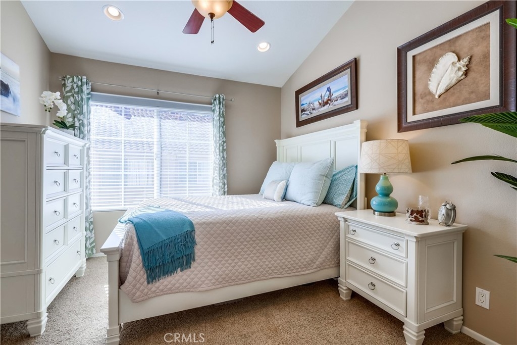 Gorgeous carriage end unit located in the desirable Canyon View West community nestled up to the foothills of Santiago Peak at the entrance of iconic Modjeska Canyon and Santiago Canyon, surrounded by the picturesque rolling hills of Whiting Ranch, providing a beautifully serene wildlife setting. The sunny front balcony entrance looking out towards the gorgeous hillsides creates an awesome first impression. Step inside and soak in the light filled living space with soaring vaulted ceilings and an open concept floor plan. The living room is filled with natural light and is blessed with a cozy fireplace and direct access to the front balcony through sliding doors, creating an ideal indoor-outdoor living space with scenic views. The handsome kitchen has been beautifully updated with exquisite cabinetry, granite countertops, a full glass tile backsplash, recessed lighting, updated faucet and fixtures, Stainless Steel appliances, extra storage cabinets with a coffee bar, and a highly prized breakfast bar, all open to the living room and dining room, perfect for entertaining friends and family. This well-designed floor plan includes 2 bedrooms and 2 bathrooms on the main level including a primary bedroom suite with vaulted ceilings, mirrored closet doors, an elegant private bathroom with updated granite topped dual vanity with custom cabinetry, framed vanity mirrors, updated fixtures and faucets, custom lighting, and a spacious step in shower. The main floor also includes a convenient inside laundry closet. Travel up the stairs to the bonus loft “Mezzanine” space which is perfect for a media room, den, rec room, gym, or home office, and also boasts additional storage areas. Fine features and recent improvements include a new front door, top of the line Tankless Water Heater, new A/C and new Furnace, and a new garbage disposal. This home also includes a 1 car detached garage. This well-maintained community has 2 community pools, a clubhouse, 2 spas, and a tot-lot playground. Endless outdoor activities located just steps away, including numerous hiking and biking trails throughout Whiting Ranch Wilderness, Concourse Park just a short stroll away, Santiago Equestrian center, Portola Park, and Portola Dog Park nearby. Close to Foothill Ranch Town Center with an abundance of shopping and dining and easy Toll Road access.