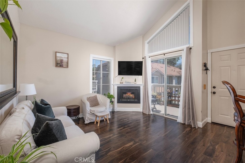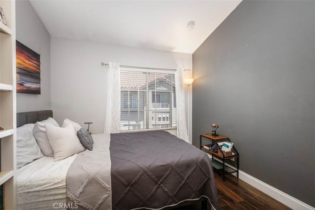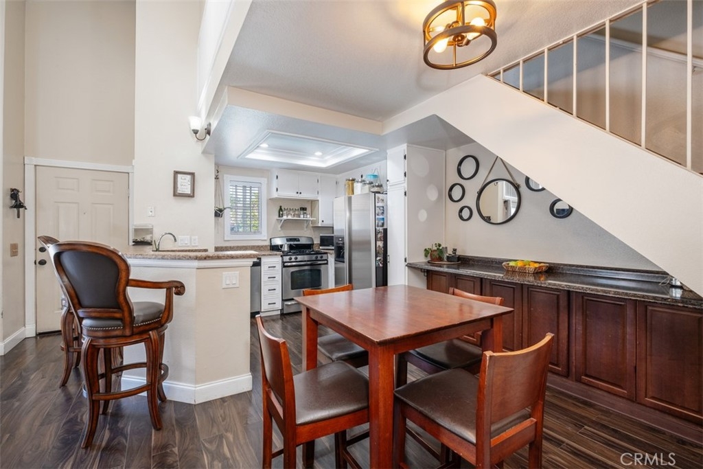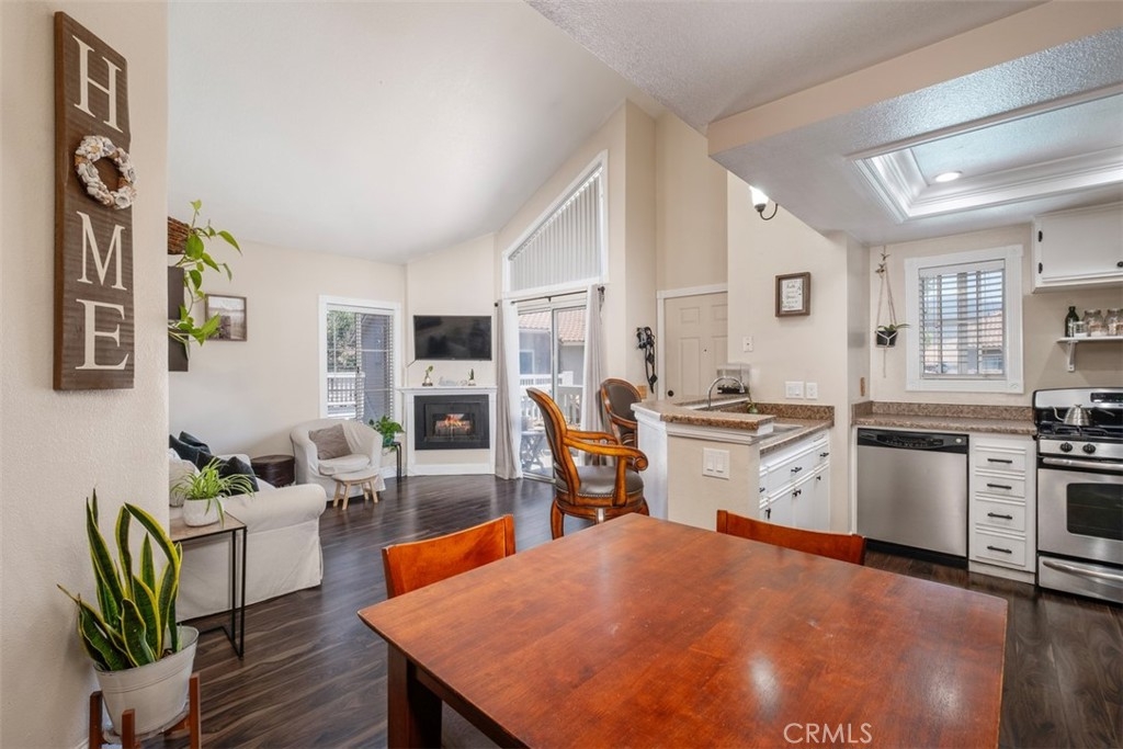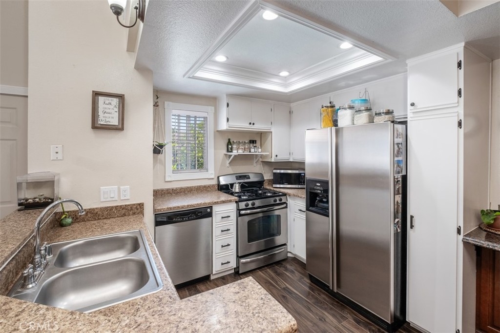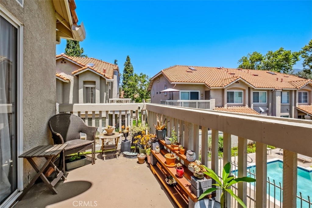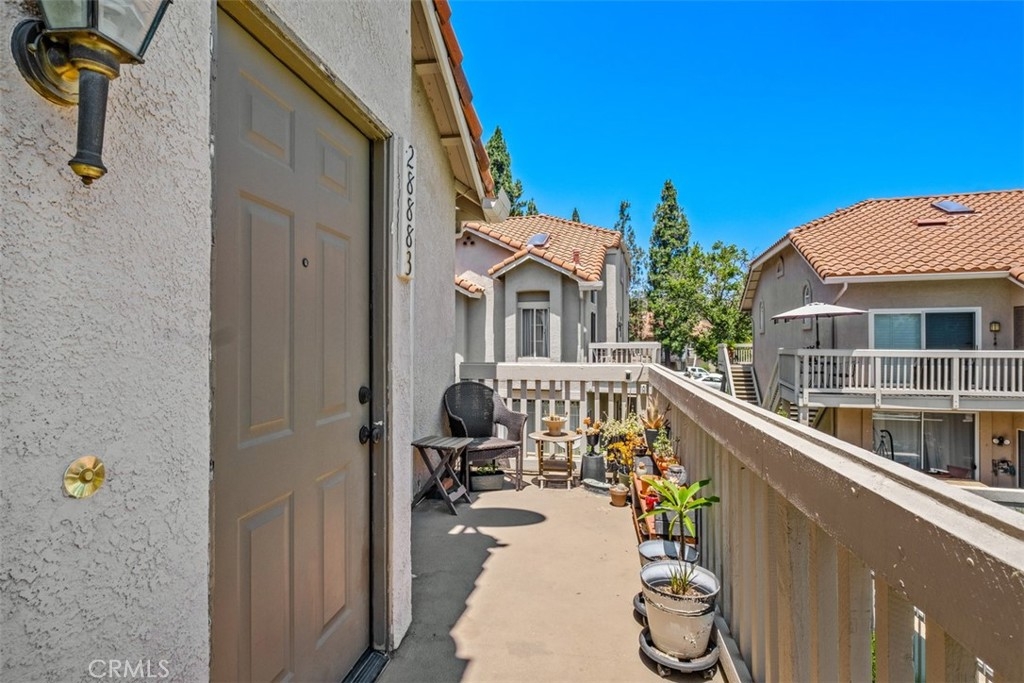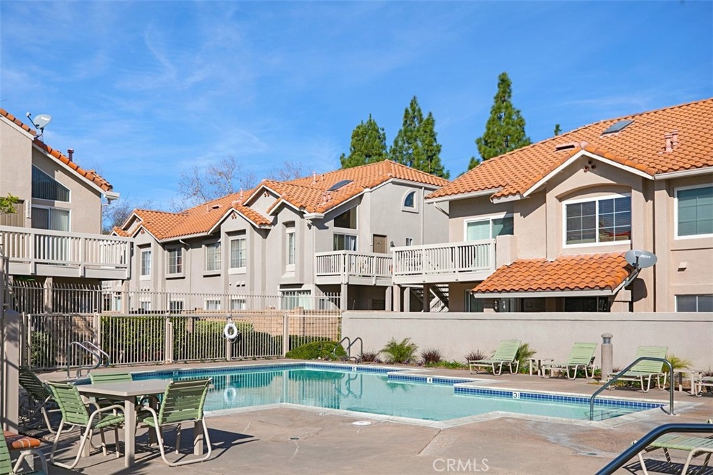 The charming 2-bedroom upstairs unit, featuring a large loft, which can be used as an office or third bedroom, boasts a beautiful open floor plan with laminate flooring throughout. Being an upstairs end unit, it offers stunning views of the pool area and mountains. The kitchen is equipped with upgraded stainless steel appliances, and the home has an abundance of natural light with neutral colors throughout. Additional amenities include a stacked oversized interior washer and dryer, and a one-car garage with a side door entry for easy access. The property is located within the boundaries of award-winning schools, Portola Elementary, Serrano Middle School, and El Toro High School. It is also conveniently situated near a beautiful park with workout stations and offers access to great trails for hiking and biking. This home is perfect for a first-time home buyer or a great rental investment property. The location provides easy access to the 241 toll road, Cooks Corner, Whiting Ranch Wilderness Park, and shopping in Foothill Ranch, which includes several restaurants, and a movie theater.