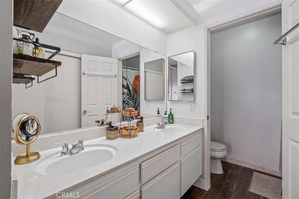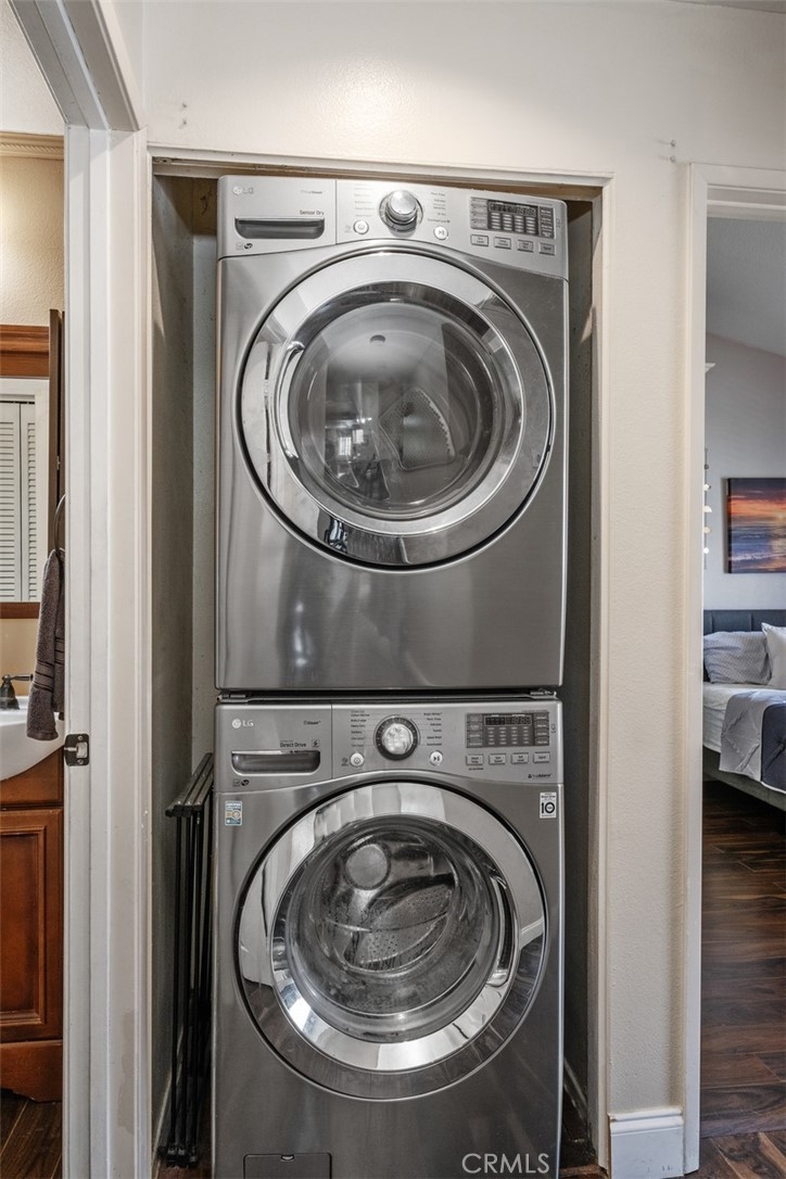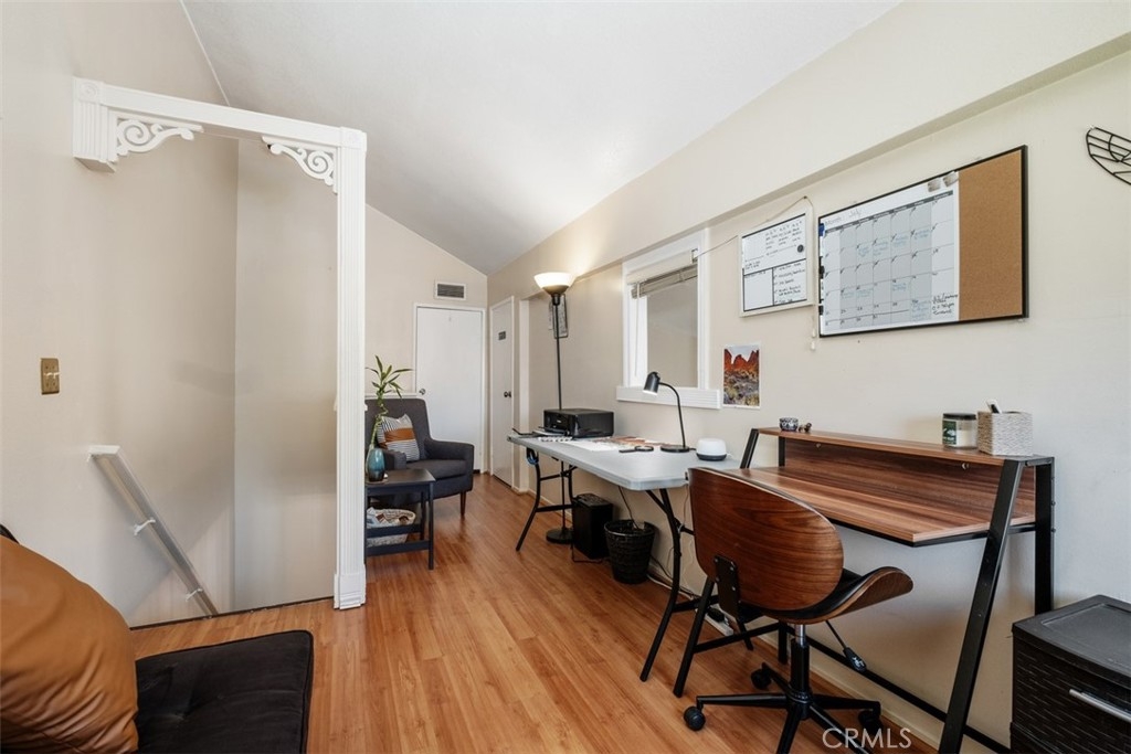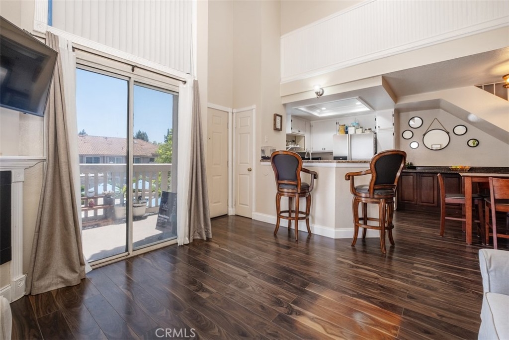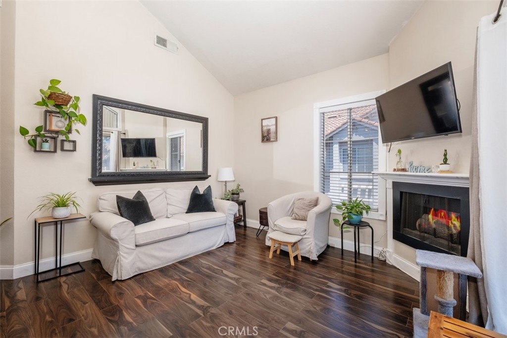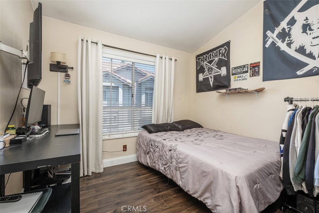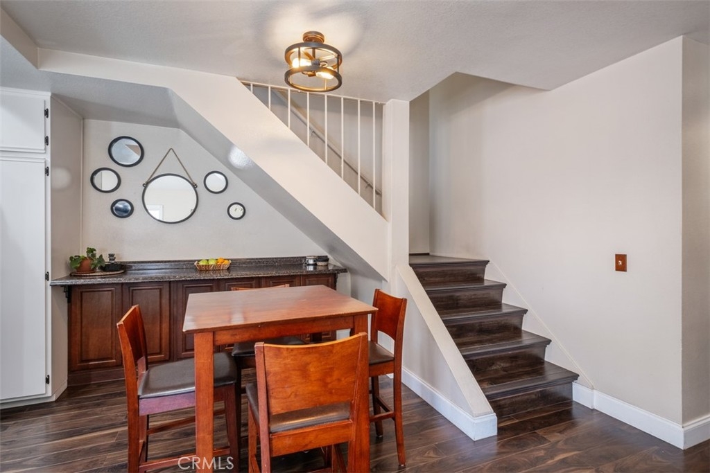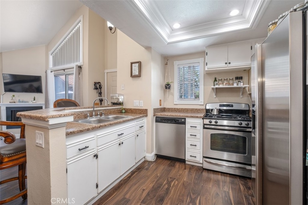 The charming 2-bedroom upstairs unit, featuring a large loft, which can be used as an office or third bedroom, boasts a beautiful open floor plan with laminate flooring throughout. Being an upstairs end unit, it offers stunning views of the pool area and mountains. The kitchen is equipped with upgraded stainless steel appliances, and the home has an abundance of natural light with neutral colors throughout. Additional amenities include a stacked oversized interior washer and dryer, and a one-car garage with a side door entry for easy access. The property is located within the boundaries of award-winning schools, Portola Elementary, Serrano Middle School, and El Toro High School. It is also conveniently situated near a beautiful park with workout stations and offers access to great trails for hiking and biking. This home is perfect for a first-time home buyer or a great rental investment property. The location provides easy access to the 241 toll road, Cooks Corner, Whiting Ranch Wilderness Park, and shopping in Foothill Ranch, which includes several restaurants, and a movie theater.