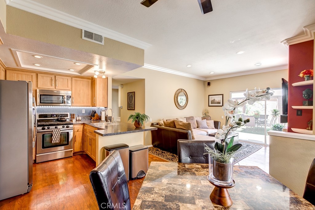 Awesome private Saddleback mountain views! Unbelievable huge stunning view backyard that you have to see to believe! This is your own resort, nothing like it for the price, that's for sure! Inside is gorgeous with wood flooring throughout, remodeled kitchen with stainless appliances, crown moulding, custom window coverings, custom designer paint, custom light fixtures, upgraded baths with quartz counters, upgraded HVAC and A/C, etc. etc.! Open concept bright and airy end unit floorplan with loads of windows! No Mello Roos! This is your dream home waiting for you!!!!!!