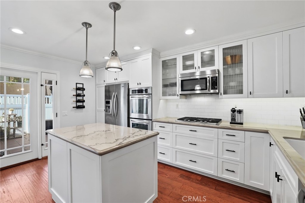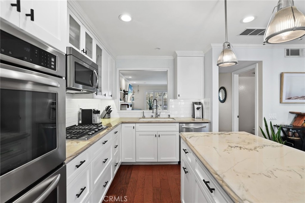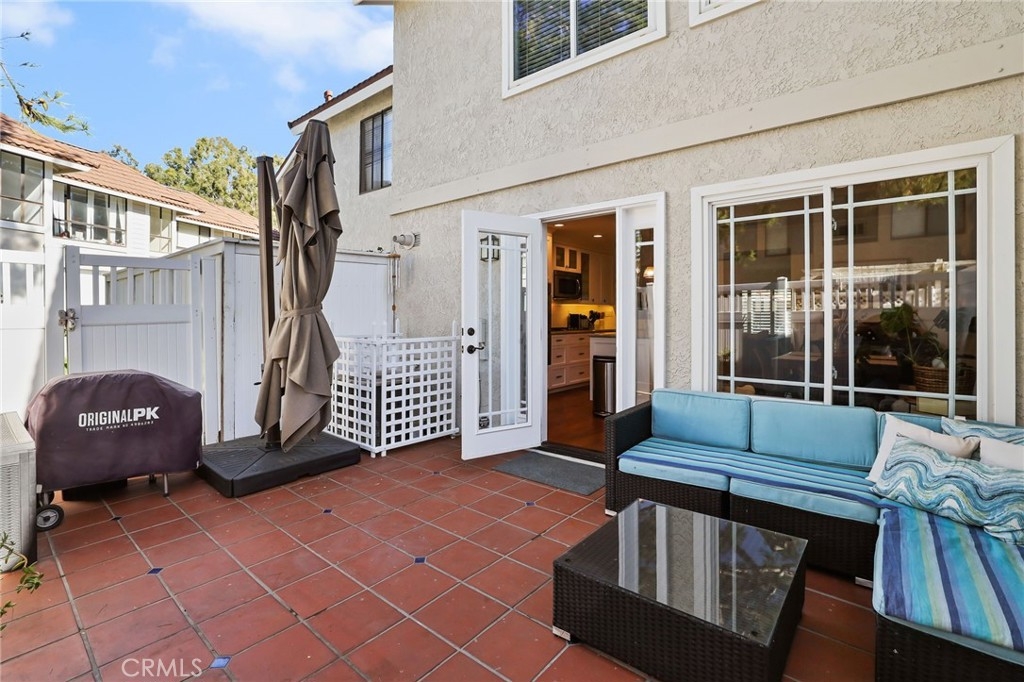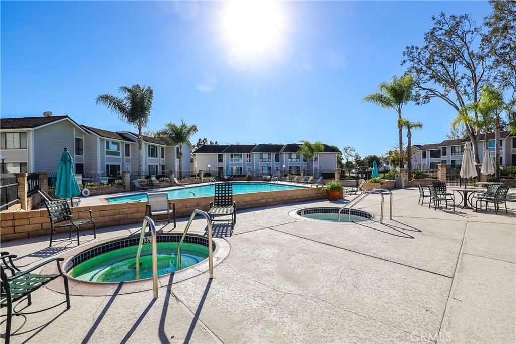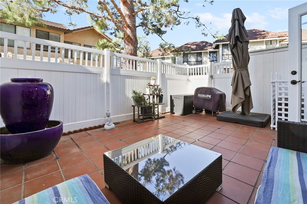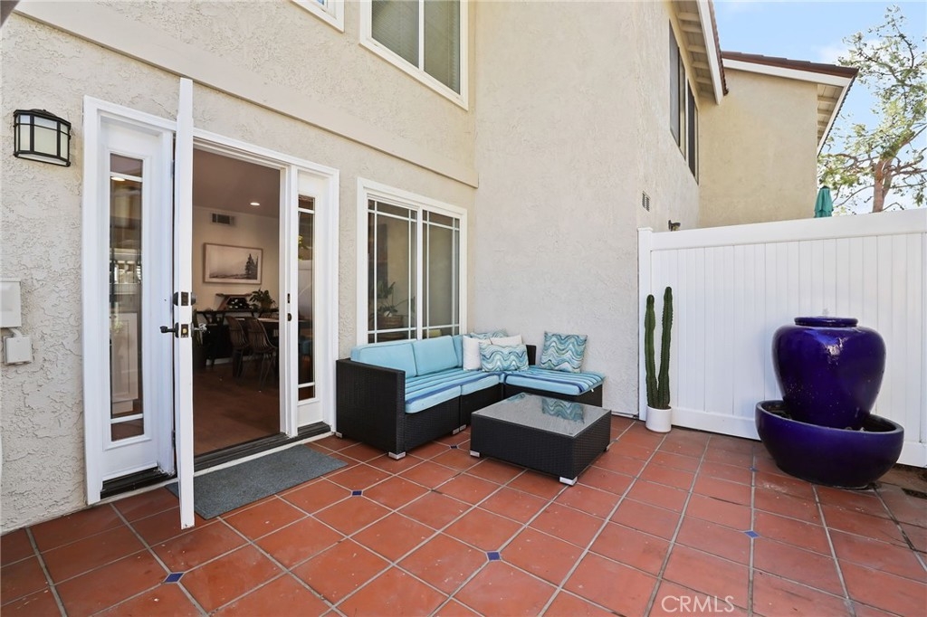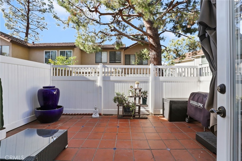 Charming Family Home with over $85,000 in Modern Upgrades! This beautifully remodeled townhome boasts an impressive array of features that blend style and comfort. It will be easy to relax and unwind as you enter the spacious family room, complete with a decorative faux fireplace and a charming wood mantel. Enjoy surround sound for movie nights and warm hardwood floors throughout. The oversized kitchen is sure to delight with a custom island illuminated by pendant lighting. The kitchen features sleek white self-closing cabinets with underlighting and decorative glass inserts, complemented by matte black hardware. Cook with ease using top-of-the-line KitchenAid stainless steel appliances, including a double oven and gas range, all set against a stylish subway tile backsplash and granite countertops. The eat-in nook offers a cozy space for casual meals, while an open niche seamlessly connects to the family room. The Primary bedroom features a built-out walk-in closet and a ceiling fan for added comfort. The wood laminate flooring adds a touch of elegance, making this space a perfect sanctuary. The versatile secondary bedroom offers an extra-deep closet for ample storage, a ceiling fan, and cozy shutters, all enhanced by wood laminate flooring. A full bathroom nearby features a tiled shower with a tub, a shaker design vanity, and a granite countertop with an undermount sink. Step outside your private outdoor oasis patio surrounded by a stylish vinyl fence and featuring beautiful tile work. Relax by the soothing water fountain or take advantage of the plumbed gas line for outdoor cooking and entertaining. This home is packed with thoughtful upgrades, including a stunning stained glass insert in the front door, crown molding, recessed LED lighting, and a tankless water heater. Enjoy the convenience of an inside laundry setup with storage, and a carpeted staircase adorned with decorative wrought iron rails. With a carport that includes storage and an additional parking space, this home is perfectly positioned across from the beautifully redone Darrin Park and close to the popular Lake Forest Sports Park and Recreation Center. Centrally located near Irvine Spectrum, The Great Park, Toll Roads, freeways, shopping centers and more. Hurry to see, this one won't last!