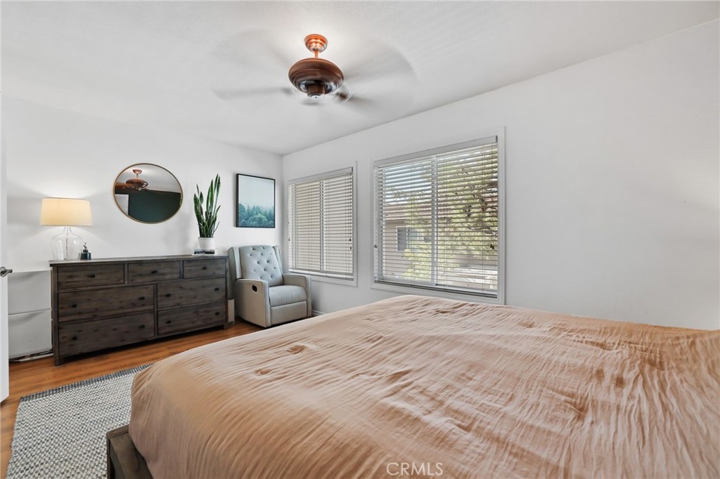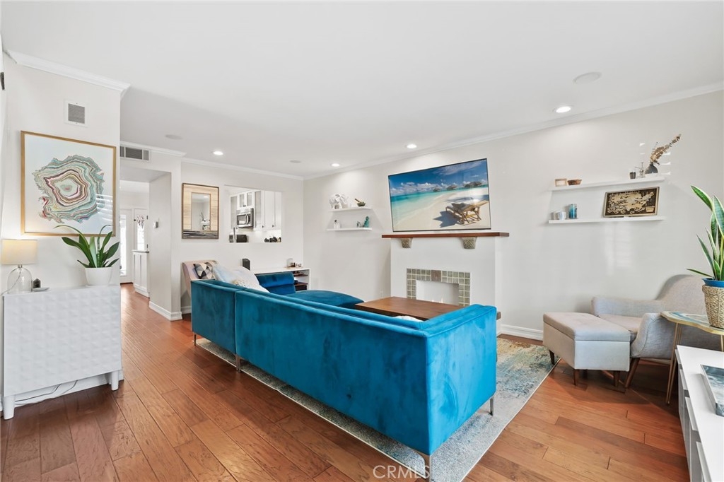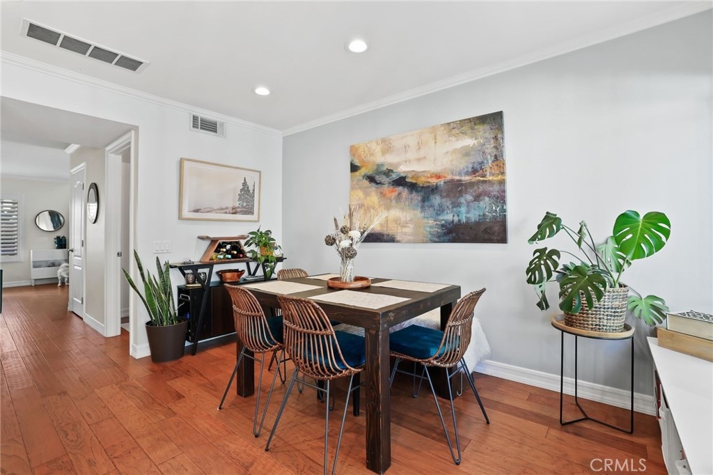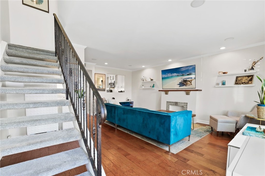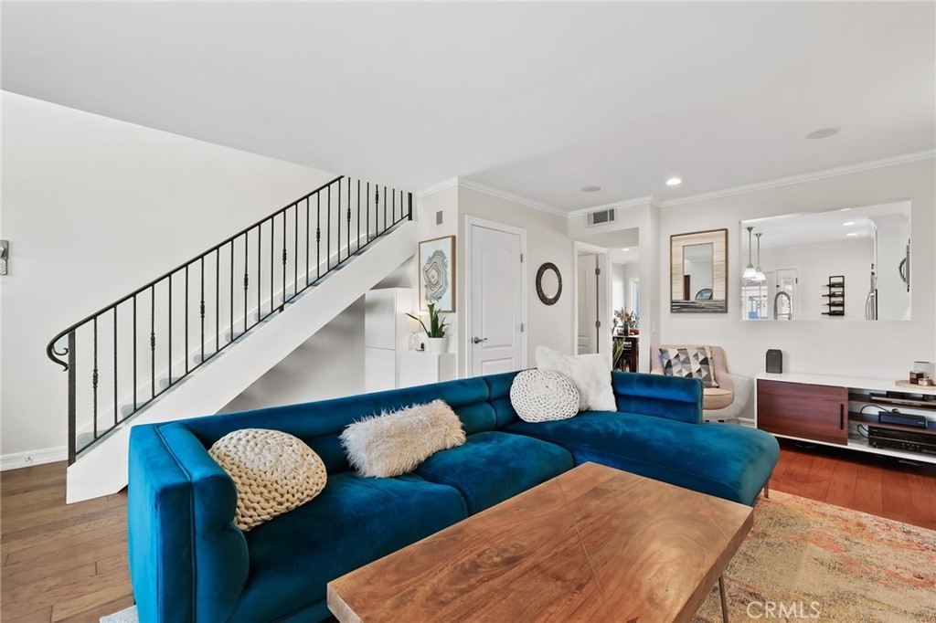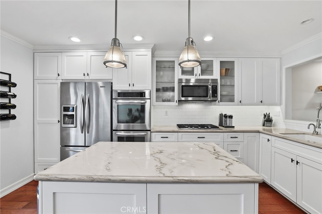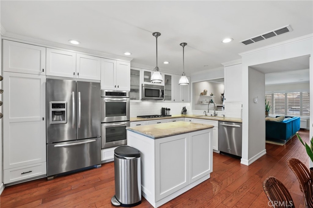 Charming Family Home with over $85,000 in Modern Upgrades! This beautifully remodeled townhome boasts an impressive array of features that blend style and comfort. It will be easy to relax and unwind as you enter the spacious family room, complete with a decorative faux fireplace and a charming wood mantel. Enjoy surround sound for movie nights and warm hardwood floors throughout. The oversized kitchen is sure to delight with a custom island illuminated by pendant lighting. The kitchen features sleek white self-closing cabinets with underlighting and decorative glass inserts, complemented by matte black hardware. Cook with ease using top-of-the-line KitchenAid stainless steel appliances, including a double oven and gas range, all set against a stylish subway tile backsplash and granite countertops. The eat-in nook offers a cozy space for casual meals, while an open niche seamlessly connects to the family room. The Primary bedroom features a built-out walk-in closet and a ceiling fan for added comfort. The wood laminate flooring adds a touch of elegance, making this space a perfect sanctuary. The versatile secondary bedroom offers an extra-deep closet for ample storage, a ceiling fan, and cozy shutters, all enhanced by wood laminate flooring. A full bathroom nearby features a tiled shower with a tub, a shaker design vanity, and a granite countertop with an undermount sink. Step outside your private outdoor oasis patio surrounded by a stylish vinyl fence and featuring beautiful tile work. Relax by the soothing water fountain or take advantage of the plumbed gas line for outdoor cooking and entertaining. This home is packed with thoughtful upgrades, including a stunning stained glass insert in the front door, crown molding, recessed LED lighting, and a tankless water heater. Enjoy the convenience of an inside laundry setup with storage, and a carpeted staircase adorned with decorative wrought iron rails. With a carport that includes storage and an additional parking space, this home is perfectly positioned across from the beautifully redone Darrin Park and close to the popular Lake Forest Sports Park and Recreation Center. Centrally located near Irvine Spectrum, The Great Park, Toll Roads, freeways, shopping centers and more. Hurry to see, this one won't last!