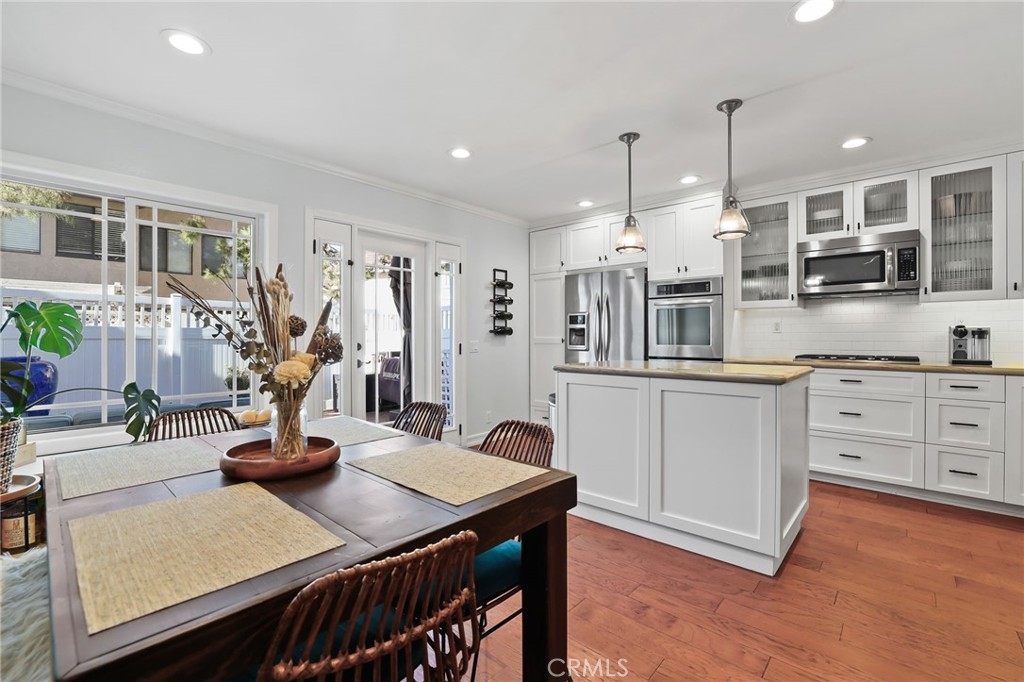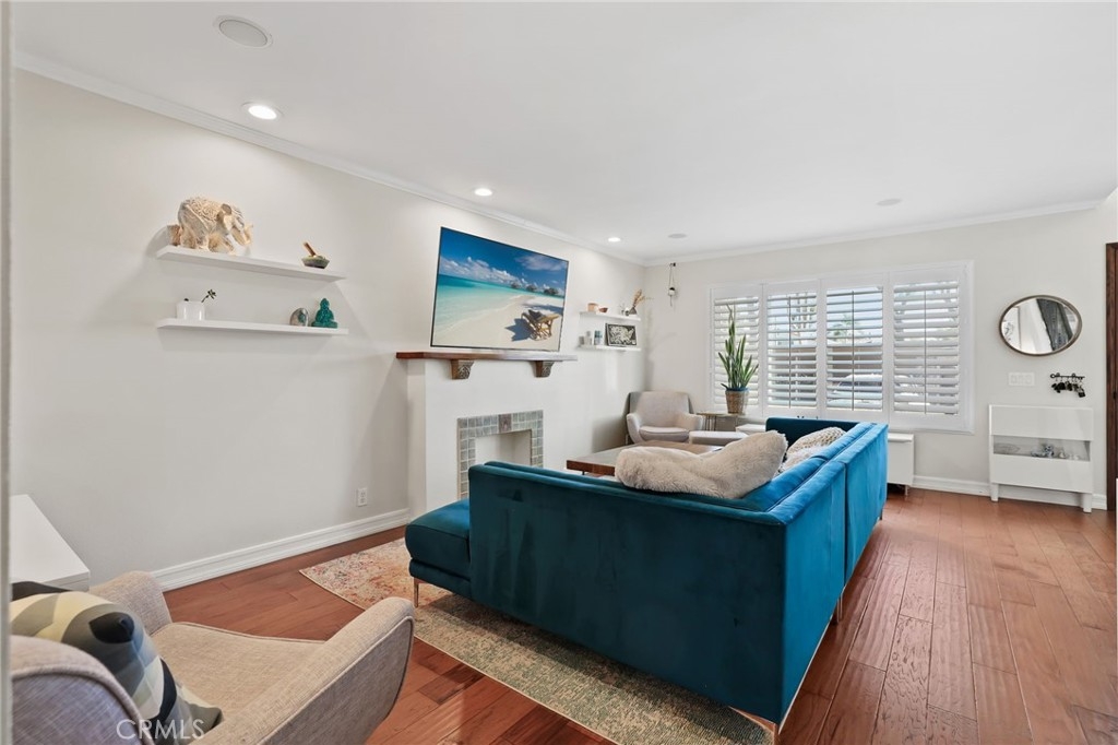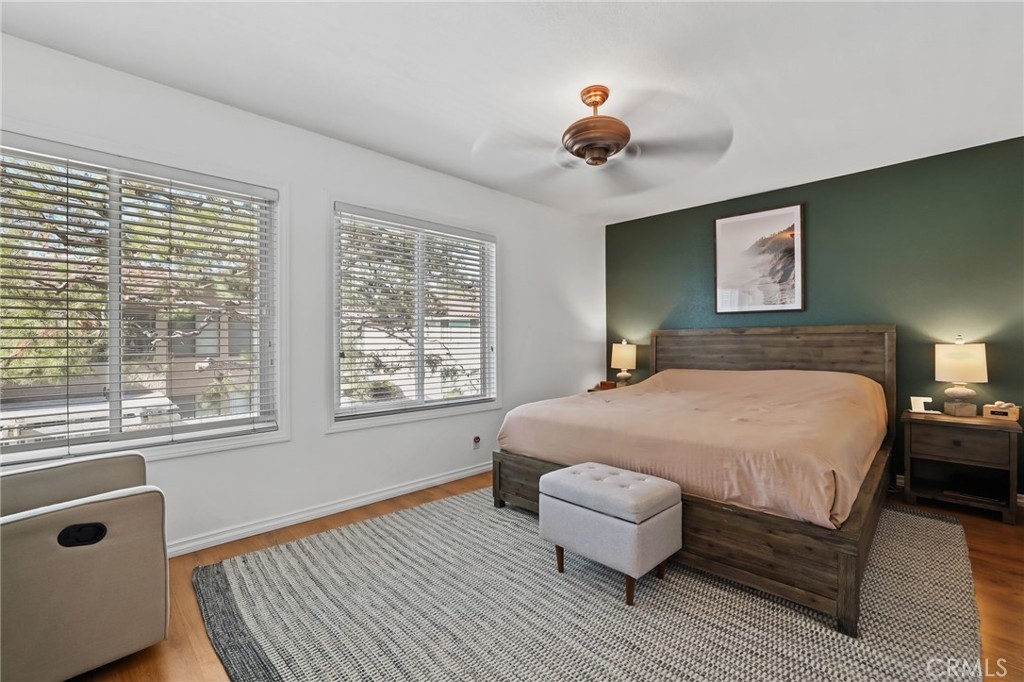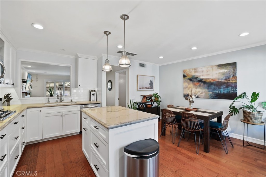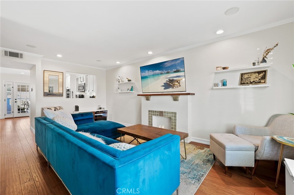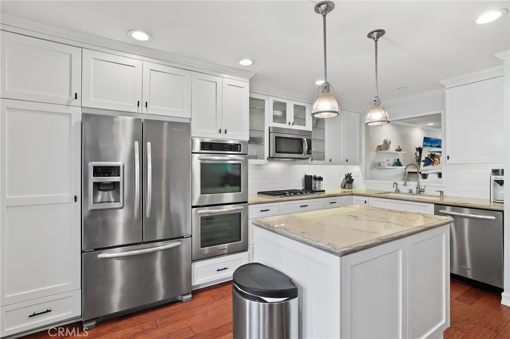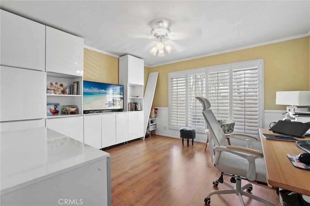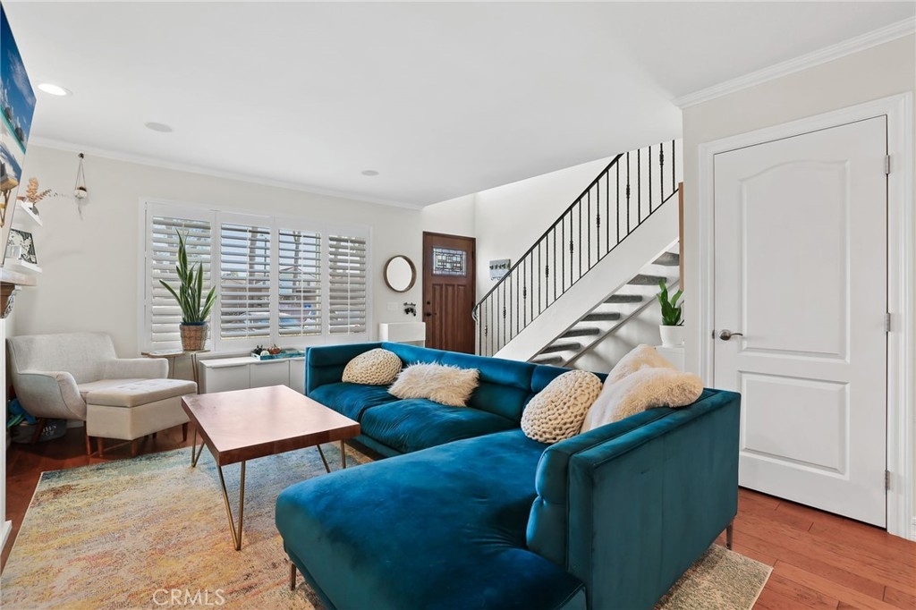 Charming Family Home with over $85,000 in Modern Upgrades! This beautifully remodeled townhome boasts an impressive array of features that blend style and comfort. It will be easy to relax and unwind as you enter the spacious family room, complete with a decorative faux fireplace and a charming wood mantel. Enjoy surround sound for movie nights and warm hardwood floors throughout. The oversized kitchen is sure to delight with a custom island illuminated by pendant lighting. The kitchen features sleek white self-closing cabinets with underlighting and decorative glass inserts, complemented by matte black hardware. Cook with ease using top-of-the-line KitchenAid stainless steel appliances, including a double oven and gas range, all set against a stylish subway tile backsplash and granite countertops. The eat-in nook offers a cozy space for casual meals, while an open niche seamlessly connects to the family room. The Primary bedroom features a built-out walk-in closet and a ceiling fan for added comfort. The wood laminate flooring adds a touch of elegance, making this space a perfect sanctuary. The versatile secondary bedroom offers an extra-deep closet for ample storage, a ceiling fan, and cozy shutters, all enhanced by wood laminate flooring. A full bathroom nearby features a tiled shower with a tub, a shaker design vanity, and a granite countertop with an undermount sink. Step outside your private outdoor oasis patio surrounded by a stylish vinyl fence and featuring beautiful tile work. Relax by the soothing water fountain or take advantage of the plumbed gas line for outdoor cooking and entertaining. This home is packed with thoughtful upgrades, including a stunning stained glass insert in the front door, crown molding, recessed LED lighting, and a tankless water heater. Enjoy the convenience of an inside laundry setup with storage, and a carpeted staircase adorned with decorative wrought iron rails. With a carport that includes storage and an additional parking space, this home is perfectly positioned across from the beautifully redone Darrin Park and close to the popular Lake Forest Sports Park and Recreation Center. Centrally located near Irvine Spectrum, The Great Park, Toll Roads, freeways, shopping centers and more. Hurry to see, this one won't last!