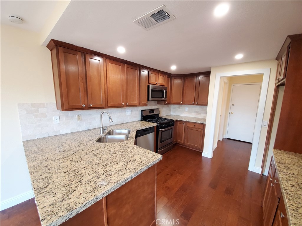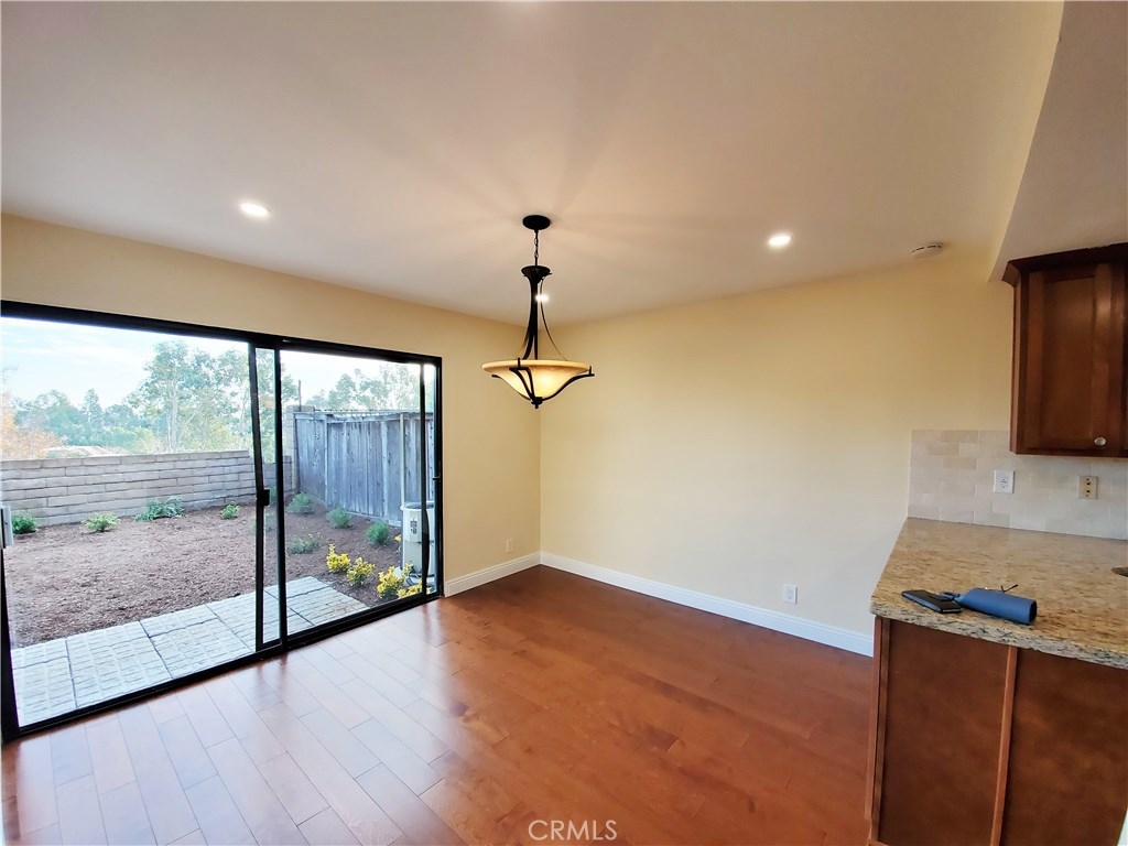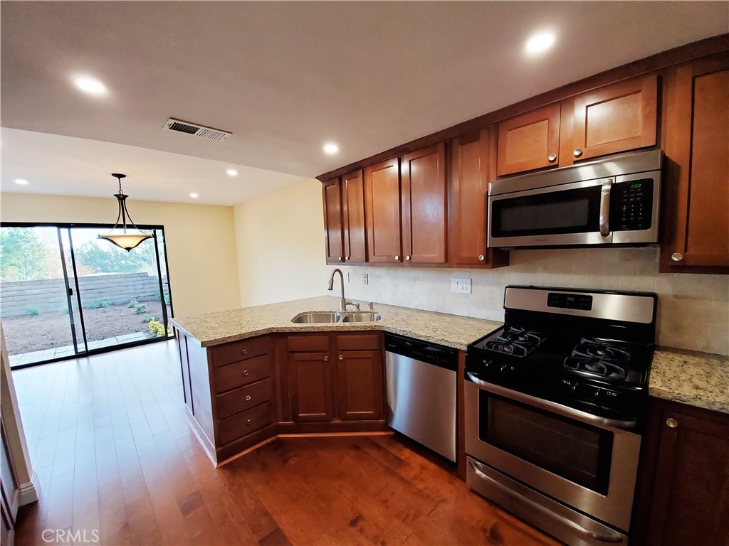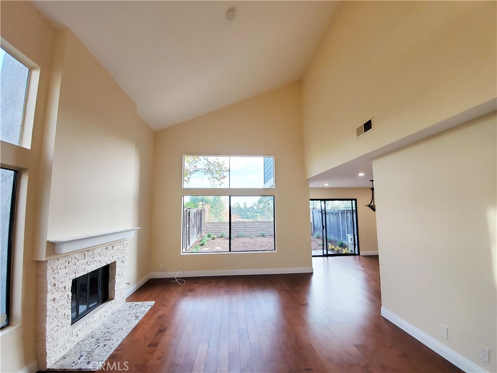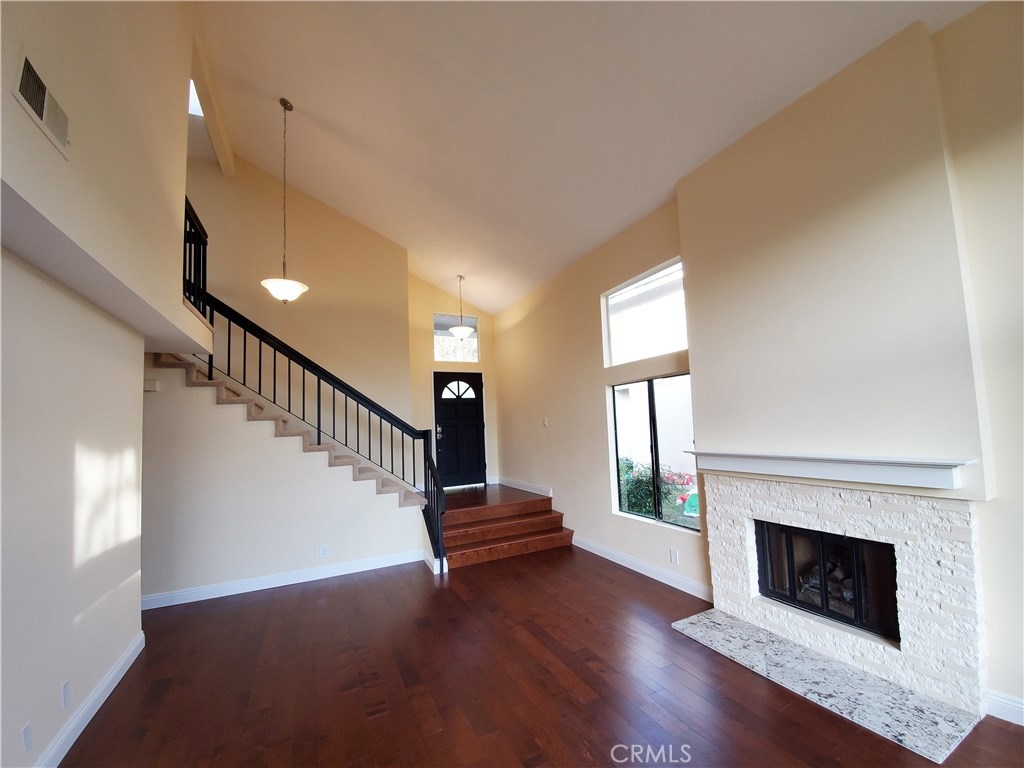 Spacious end unit view property located in the desirable Grandview Crest community. Close proximity to shops, schools, parks and just minutes from interstate 5 and the 241 toll road. Features include an inviting entrance to a great and bright living room, vaulted ceilings and a newly remodeled kitchen with granite counter tops, travertine backsplash and stainless steel appliances. Brand new hardwood flooring connects to a natural stone fire place that is sure to create a welcoming environment. Relax in your new living room complete with recesses LED lighting and new light fixtures throughout the home. Up the stairs you will find brand new carpeting and freshly painted walls. All the bathrooms throughout the home have been remolded as well. The property was recently painted and just completely re-piped by the association. The community is complete with two separate pools, tennis courts, clubhouse, barbecue and playground areas.