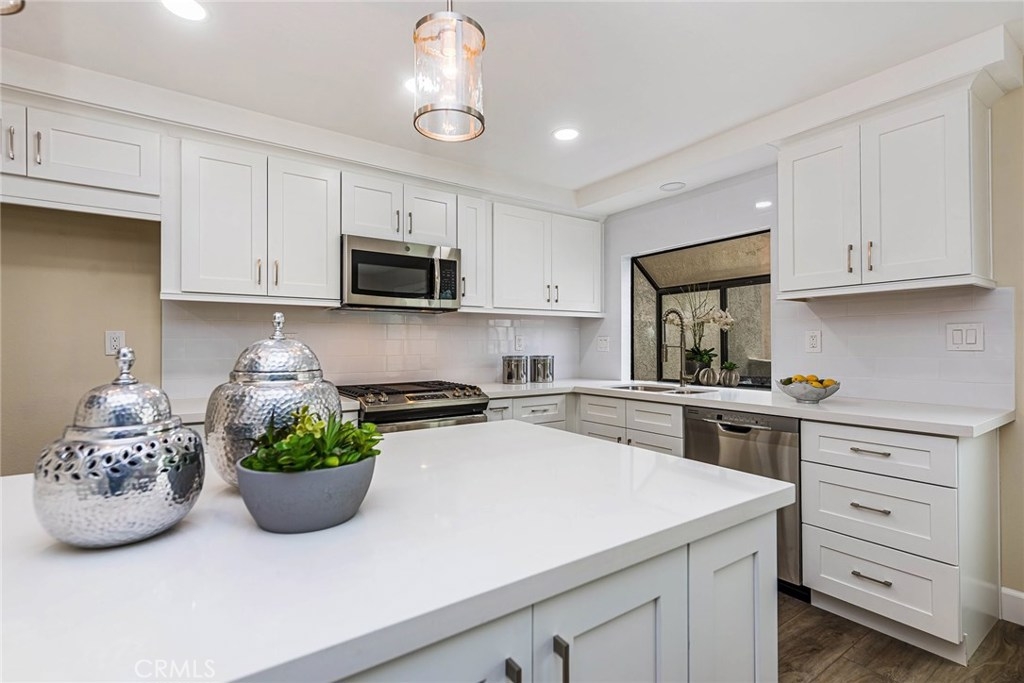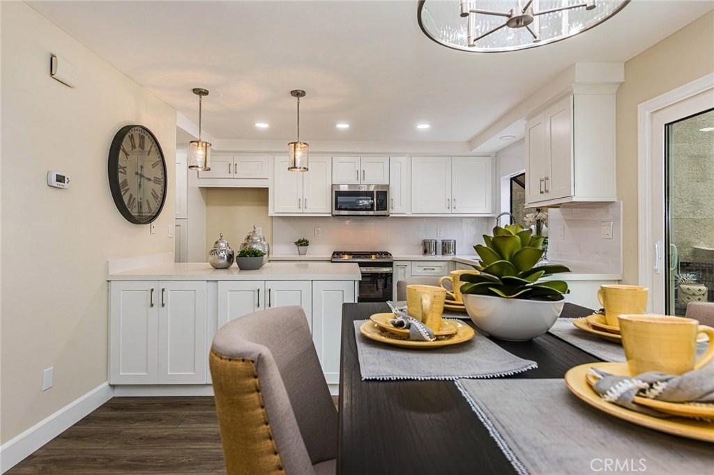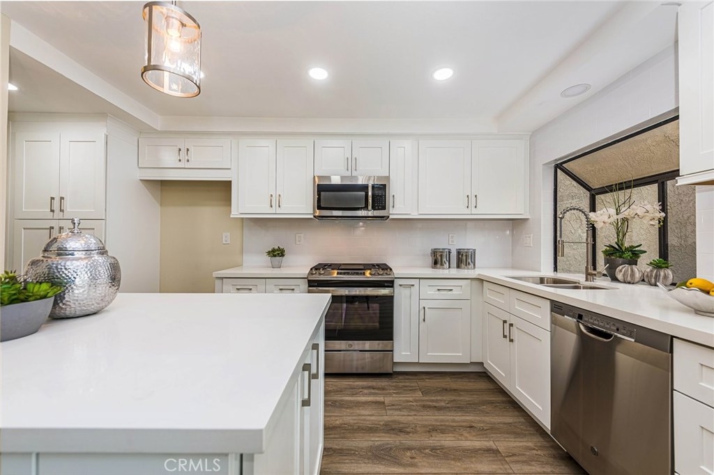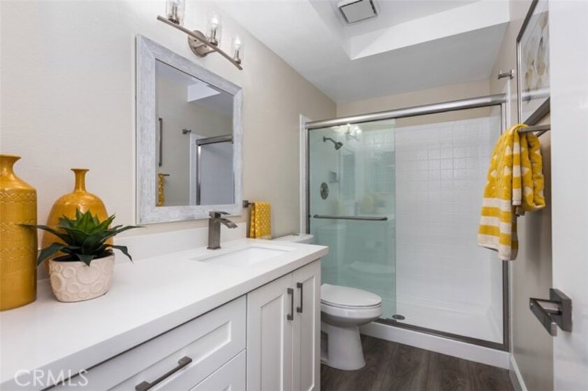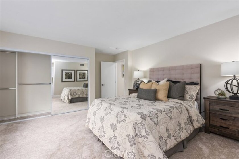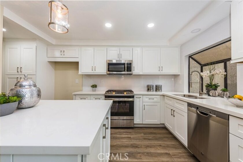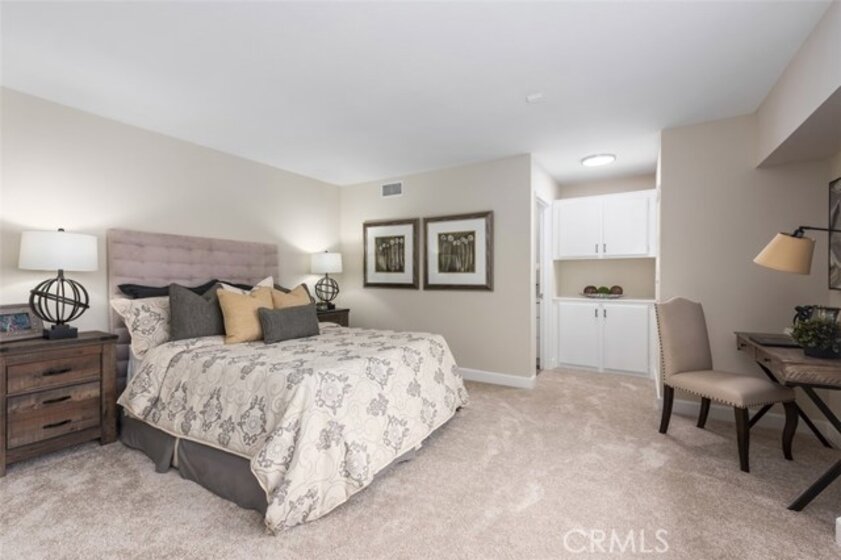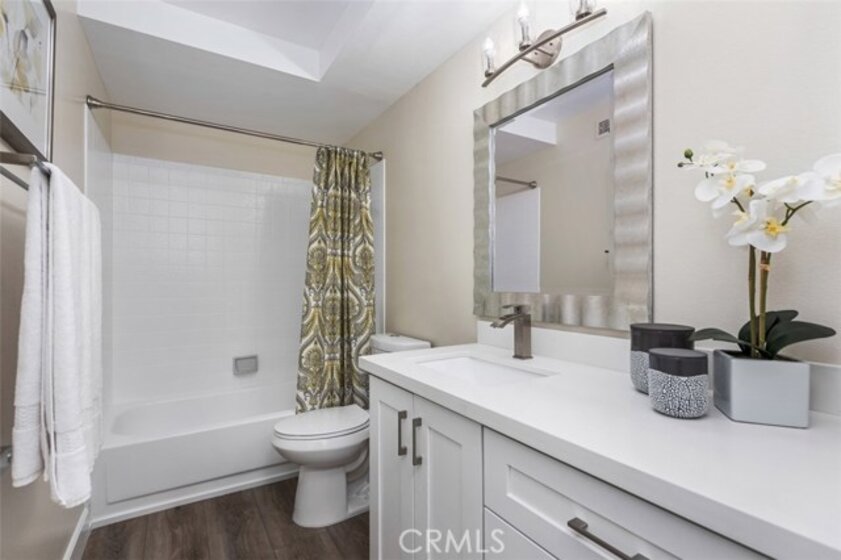 Welcome to Lake Forest with its cool climate, lovely lakes, forests, parks, trails and proximity to Laguna Beach (just 10 miles down the road). THIS PLACE IS TO DIE FOR. Beautifully remodeled from top to bottom, dual owner’s suites, 2.5 bath town home with 2-car over-sized and epoxied garage located in the lovely hillside community of Grandview Crest. Contemporary upgrades include luxury vinyl plank flooring, plush carpet, designer paint, custom blinds, new light fixtures, moldings & hardware. Kitchen remodel: White shaker cabinets w/ soft-close drawers, pantry, quartz counters, white subway-style back-splash, stainless sink & appliances, gas stove, recessed lighting, garden window & huge island (peninsula). Dining room looks out toward spacious patio. Living room with fireplace overlooks greenbelt. Owner’s suites have mirrored wardrobe doors and their own linen closets making this home great for roommates or couples who snore loud! All 3 baths feature white shaker dual vanities w/ quartz counters, new toilets, mirrors, sinks, faucets, lighting. Community amenities include pools, spa, tennis & sports courts & clubhouse. I-5, I-405 and toll roads just a few miles away. Short stroll to L.F. Elementary/shopping/restaurants/parks/trails/bus line/Starbucks. HOA covers landscaping, paint, termite, AND trash! $61,000 remodel just being completed. All neutral and ready for your touches. ***Cut and paste: https://vimeo.com/406671129 to view COMEDY VIRTUAL TOUR***