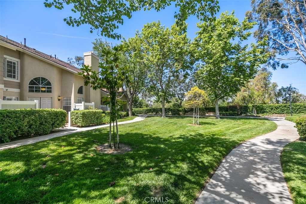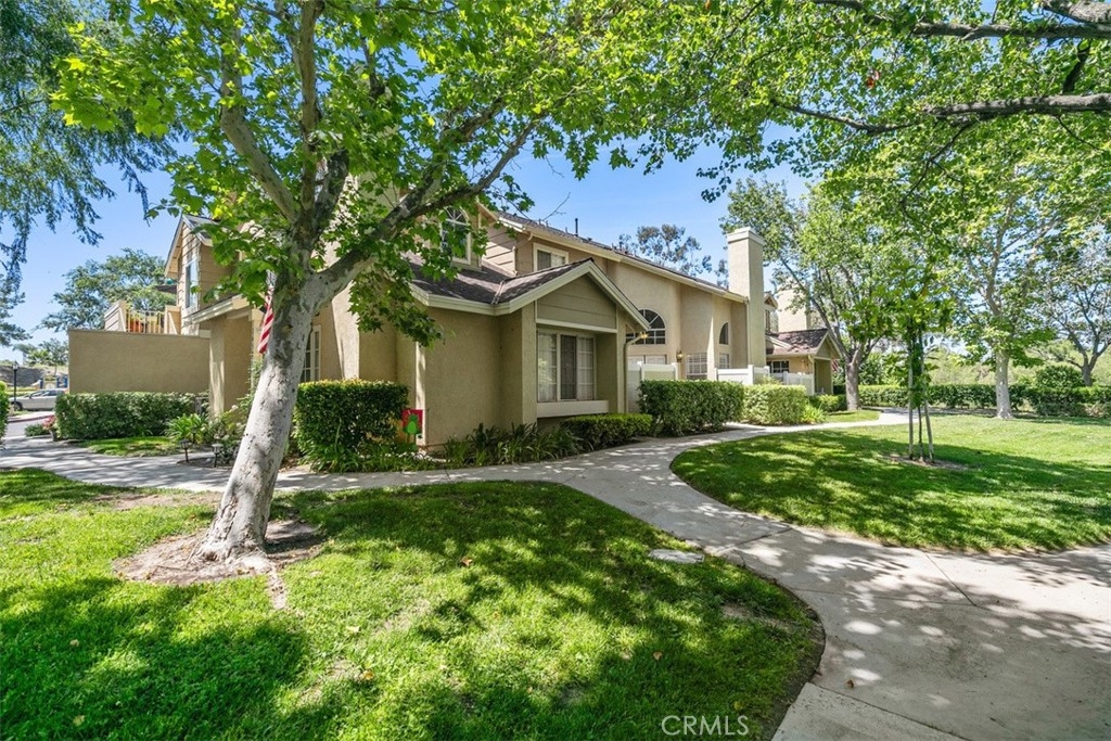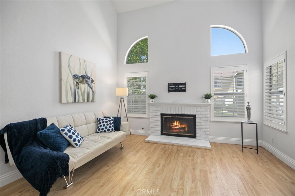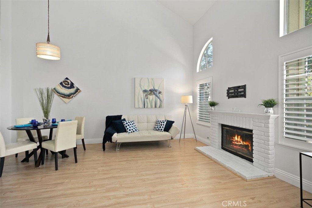 Two story, two bedroom, two bath townhome with attached two-car garage! Cul-de-sac location facing greenbelt. Double door entry leads to living room/dining combo with custom paint, newer light fixture, manufactured wood flooring, soaring cathedral ceilings and gas fireplace. Remodeled kitchen includes quartz counters, shaker cabinets, stainless appliances, recessed lights, pantry, contemporary tile flooring and breakfast bar. Light & bright master has tall ceilings and PAX closet wardrobe. Remodeled master bath with quartz counter dual vanity, shaker cabinet, tiled shower and frameless glass enclosure plus new fixtures. The loft overlooks the living room and makes an ideal den and work station. New carpet on stairway. Main floor bedroom with mirrored closet and main floor bath with shower. Two-car garage with epoxy flooring, storage shelves and hookups for full sized laundry. Community was just repiped with Pex and roofs were replaced in 2020. Community pool & spa located nearby. One of the most desirable neighborhoods of Lake Forest situated amongst rolling green hills and parks!