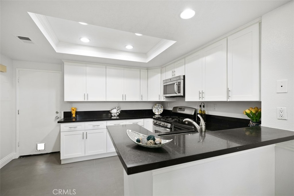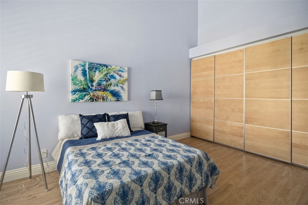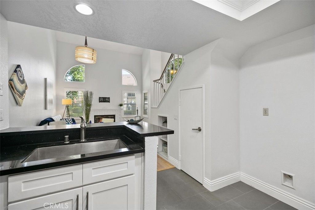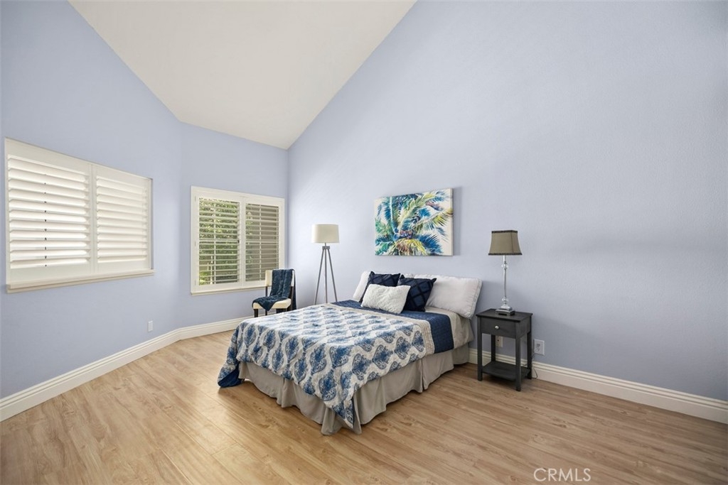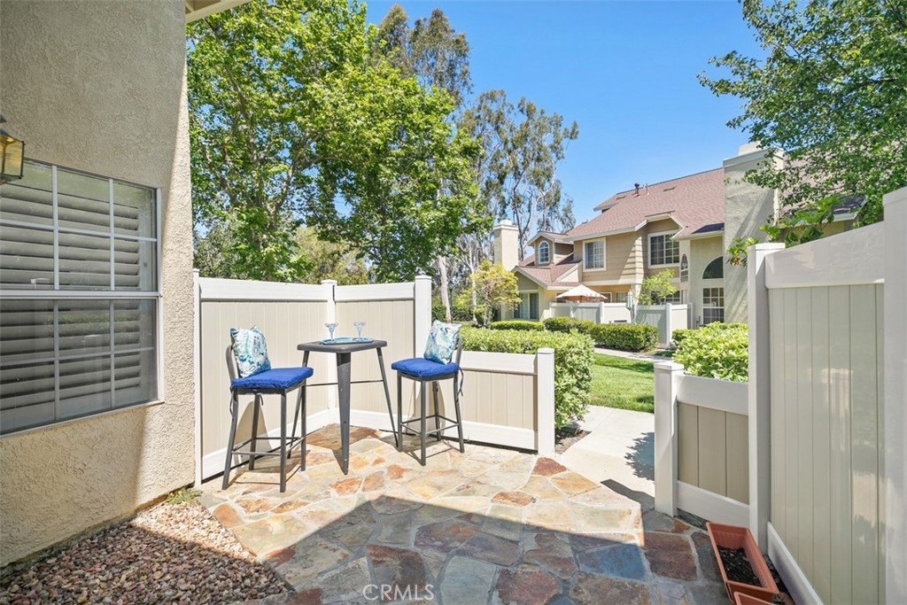Two story, two bedroom, two bath townhome with attached two-car garage! Cul-de-sac location facing greenbelt. Double door entry leads to living room/dining combo with custom paint, newer light fixture, manufactured wood flooring, soaring cathedral ceilings and gas fireplace. Remodeled kitchen includes quartz counters, shaker cabinets, stainless appliances, recessed lights, pantry, contemporary tile flooring and breakfast bar. Light & bright master has tall ceilings and PAX closet wardrobe. Remodeled master bath with quartz counter dual vanity, shaker cabinet, tiled shower and frameless glass enclosure plus new fixtures. The loft overlooks the living room and makes an ideal den and work station. New carpet on stairway. Main floor bedroom with mirrored closet and main floor bath with shower. Two-car garage with epoxy flooring, storage shelves and hookups for full sized laundry. Community was just repiped with Pex and roofs were replaced in 2020. Community pool & spa located nearby. One of the most desirable neighborhoods of Lake Forest situated amongst rolling green hills and parks!