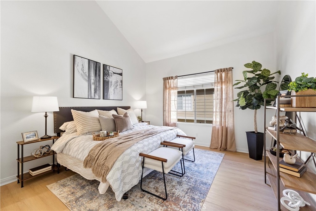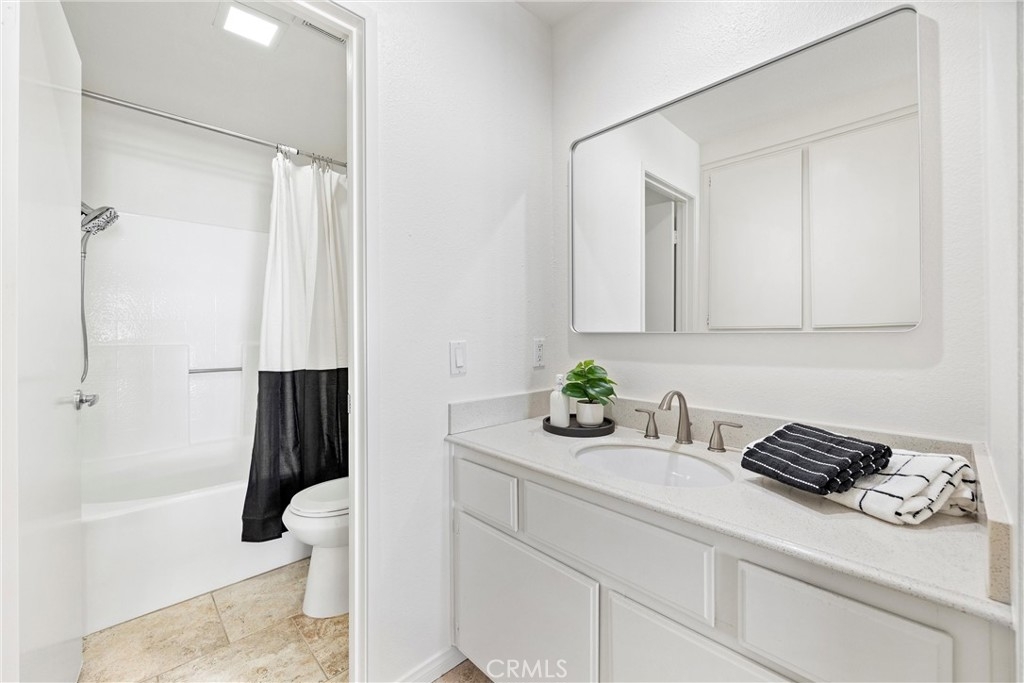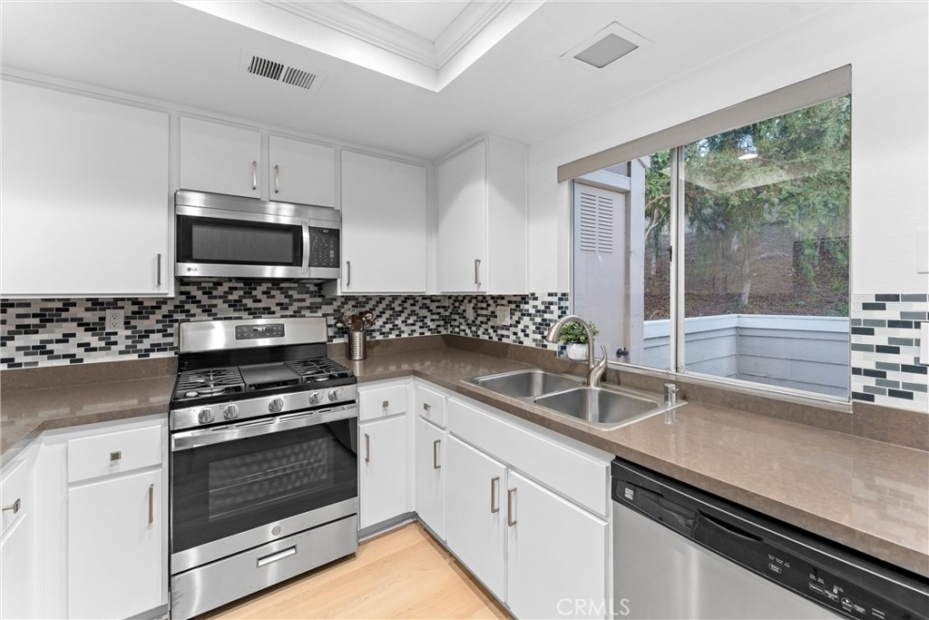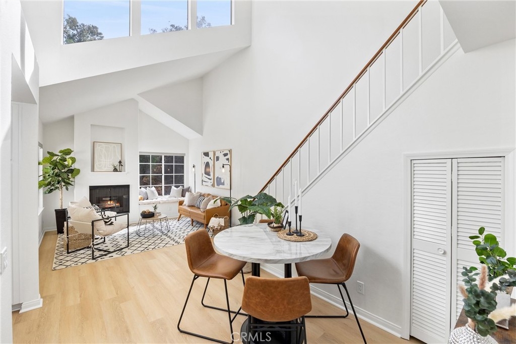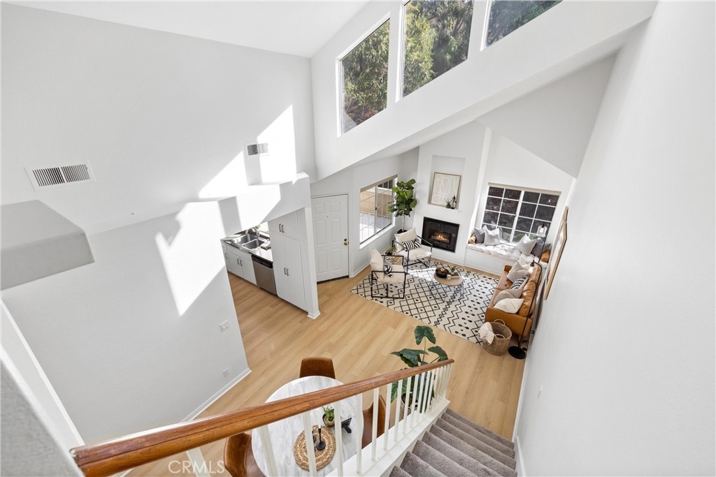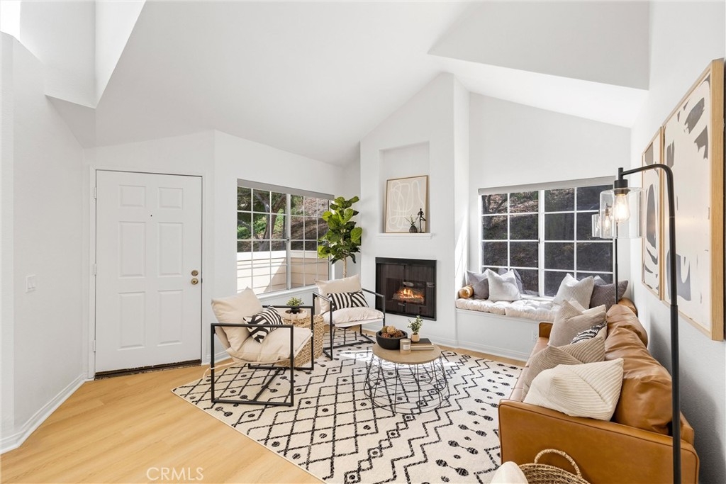 Welcome to 26626 Rosepath, a stunning 2-bedroom, 2-bath + loft end unit condo nestled in the highly sought-after Normandale Heights, Whispering Hill Community of Lake Forest. This modern gem offers a prime location with no neighbors above or below, ensuring peace and privacy. As you step inside, you’ll be greeted by an open floor plan bathed in natural light, highlighted by impressive 2-story vaulted ceilings. The cozy living room features an electric starting gas fireplace and bench seating that overlooks the lush greenbelt, creating a warm and inviting atmosphere. The beautifully refreshed kitchen features refaced cabinets with new doors and drawers, a new GE stainless steel 5 burner stove, stainless steal appliances, quartz countertops, a tile backsplash, new flooring, LED lighting and a large picture window that fills the space with light. The spacious primary bedroom boasts vaulted ceilings, new flooring, an en-suite bathroom, and a large walk-in closet, while the second bedroom is equally generous, showcasing new flooring and plenty of sunlight. A versatile loft area adds extra living space, perfect for a home office or guest room. Recent upgrades include beautiful luxury vinyl plank flooring, textured ceilings, fresh paint, new LED lighting, and a modern ceiling fan. The brand-new AC, furnace, and ducting installed in October 2023, along with a new roof and plumbing (all paid for by the seller), provide peace of mind. The outdoor deck has also been completely redone, making it a perfect spot for relaxation. This tranquil side of the Whispering Hills community consists of only 50 units, ensuring a quiet environment. Residents enjoy access to three swimming pools, spas, playgrounds, and plenty of green belts, along with ample guest parking. The location is surrounded by gorgeous homes, award-winning schools, and lush landscaping, with horse trails nearby and Pittsford Park just down the hill. Convenient access to the 5 and 405 freeways, the 73 toll road, shopping, dining, and beautiful beaches makes this an ideal place to call home. Don’t miss out on this incredible opportunity!