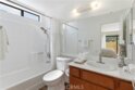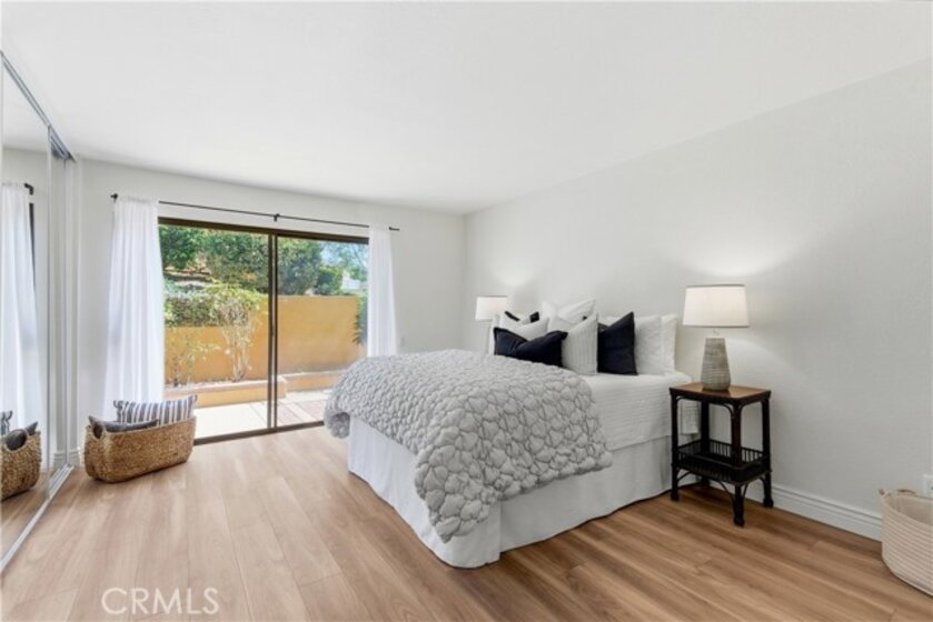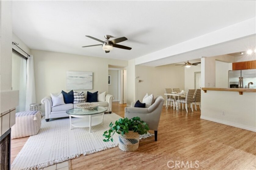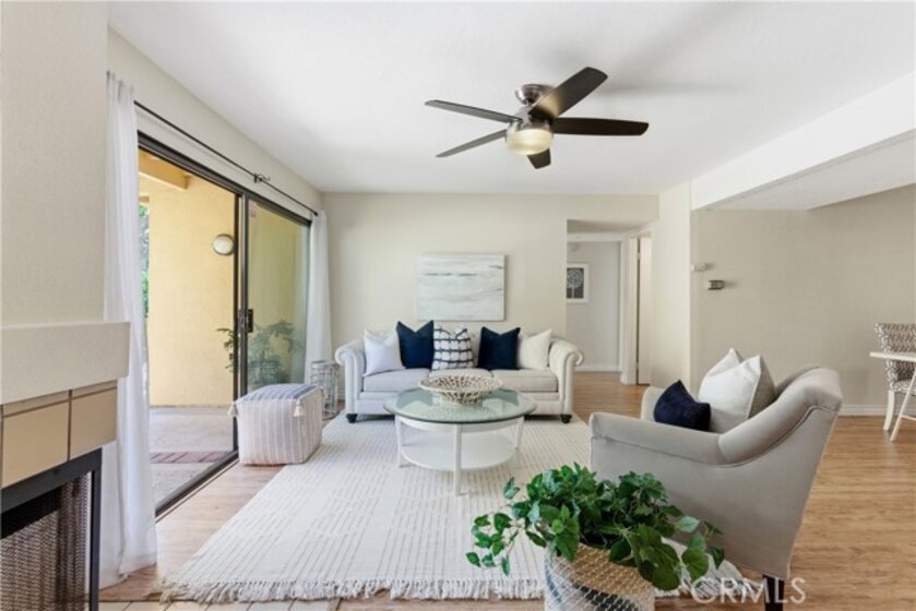 Welcome to your new beautiful ground level 2 bdrm, 2 bath end unit in Le Parc with an extra large sunny wraparound patio and yard - perfect for entertaining, dining alfresco, giving your pet space or having a garden!. Having two bedrooms with attached baths offer many options for guests, roommates or investment value. The living and dining rooms plus kitchen create an open concept living area. The living room has a cozy fireplace and direct access to the fenced patio area transitioning indoor / outdoor space. The primary bedroom also has direct access to the private patio area. An indoor laundry with newer stackable washer and dryer is conveniently located at hallway. There is solid surface flooring (wood laminate and tile) throughout. Finally, an oversized two car garage ensures covered parking and offers extra storage space. The resort style grounds include pools, spas, water features and a clubhouse. There is also a public park a short walk away with open space and play equipment. Don’t forget about the large side yard - great for garden, dog run or play area!