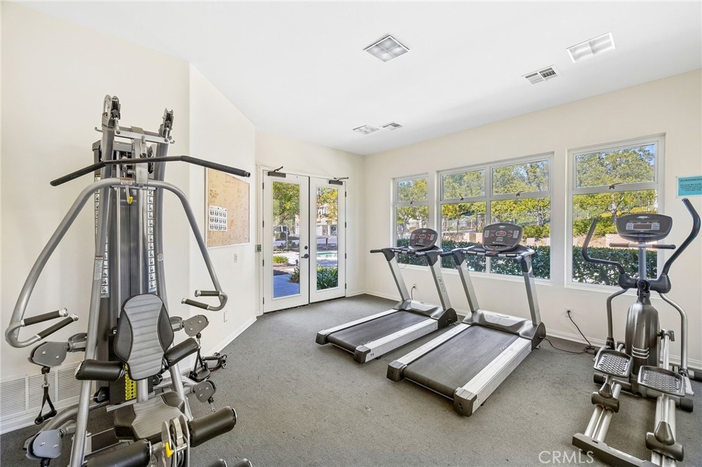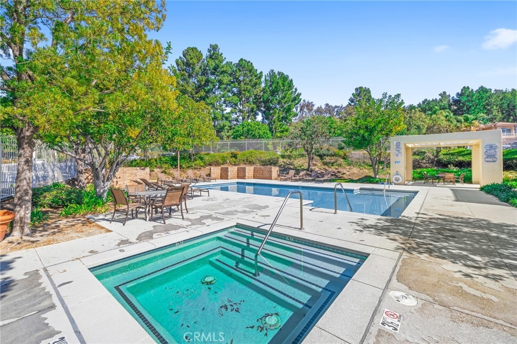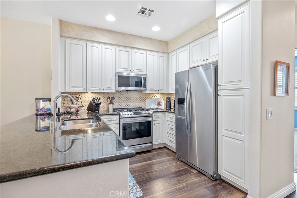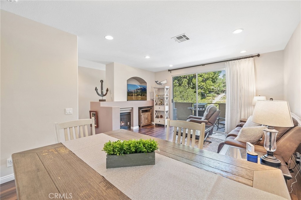 Beautiful remodeled spacious floor plan with large living & dining room, fireplace, recessed lighting and sliding glass door to private deck. Remodeled kitchen opens up to living area and features, LG stainless steel appliances and full backsplash, large granite countertop, premium laminate wood floors, designer carpeting, dining room light fixture, upgraded faucets & more. Large master suite boasts vaulted ceilings with custom crown molding, dual closets, and bathroom with dual sinks & newer faucets, plantation shutters. Spacious second bedroom with ceiling fan light fixture and closet with custom organizers. Large, private deck with extra storage and attached garage with direct access and new automatic garage door opener. This property is located at the front of the community with easy access to the pool, jacuzzi, clubhouse, exercise center and the children's gated playground. Conveniently located within walking distance of Portola Elementary school, near hiking and biking trails. Spectacular community with low HOA.