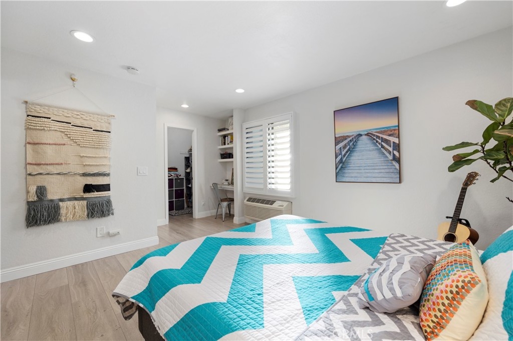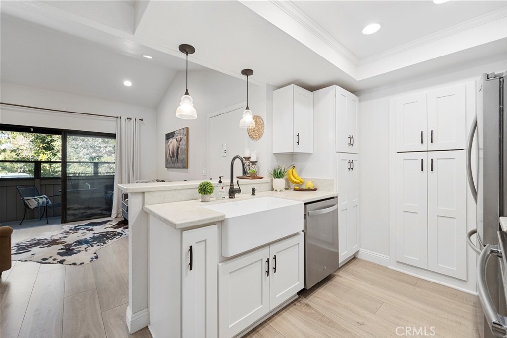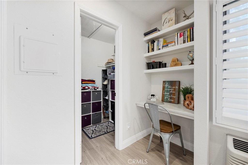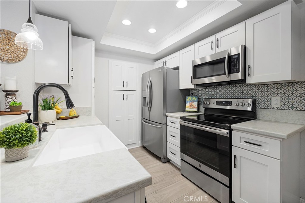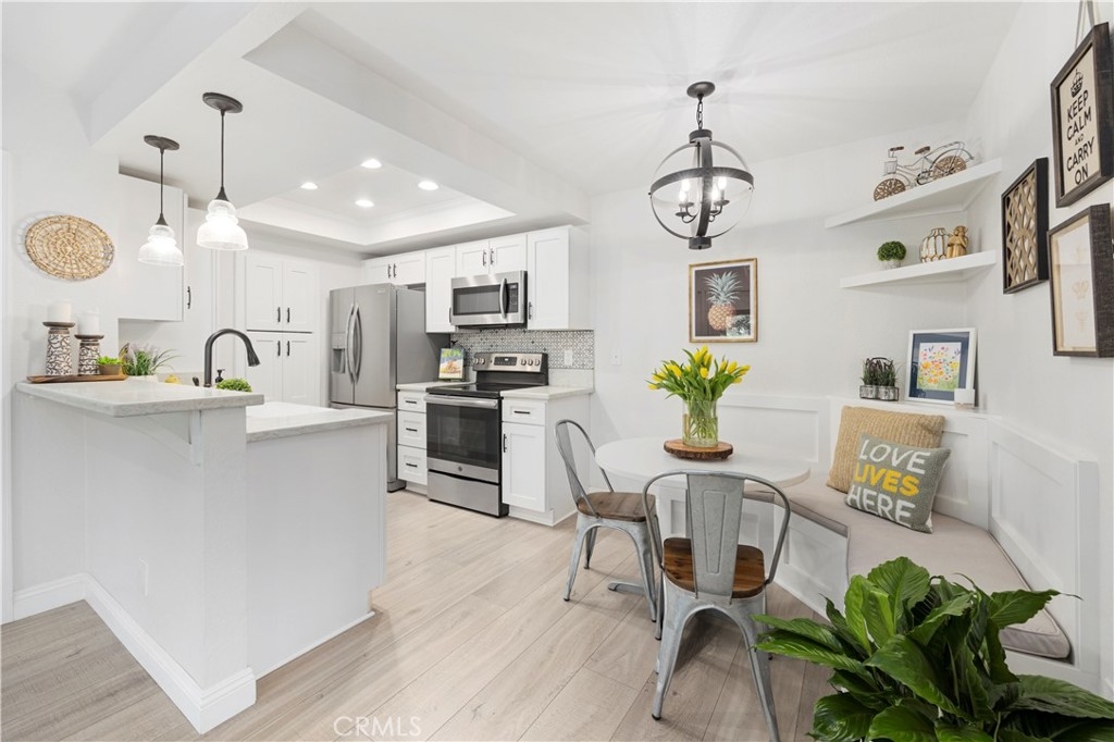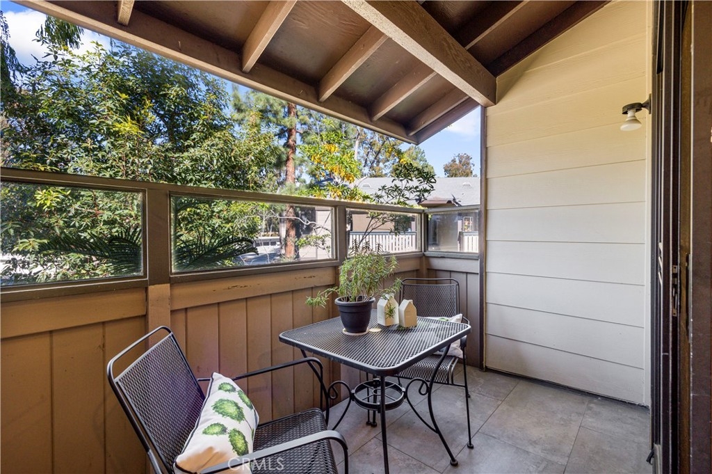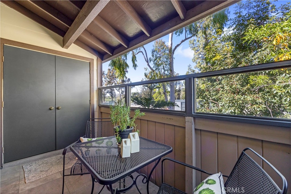 This turnkey condo is ideally located in the community of Pheasant Creek. This upper-level, one bedroom is remodeled and updated. High vaulted ceilings, wide wood laminate flooring, recessed lighting, custom barn door going into the bedroom. Kitchen is bright with white shaker cabinetry, Quartz countertops, farmhouse sink, upgraded hardware and fixtures. Custom tile backsplash and stainless-steel appliances. Built-in banquet dining seating with storage, custom shelves. Bedroom has built-in desk and shelving and walk-in closet. Plantation shutters and high ceilings. Remodeled bathroom with quartz topped vanity, framed vanity mirror. Tub & shower with custom tile surround. Private balcony for relaxing. Outside laundry closet. One car garage. The community has 4 pools, lighted tennis courts. Close to shopping, parks, and toll road. This is a must see.