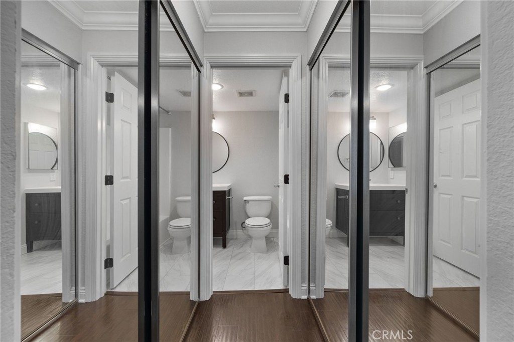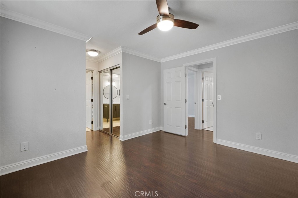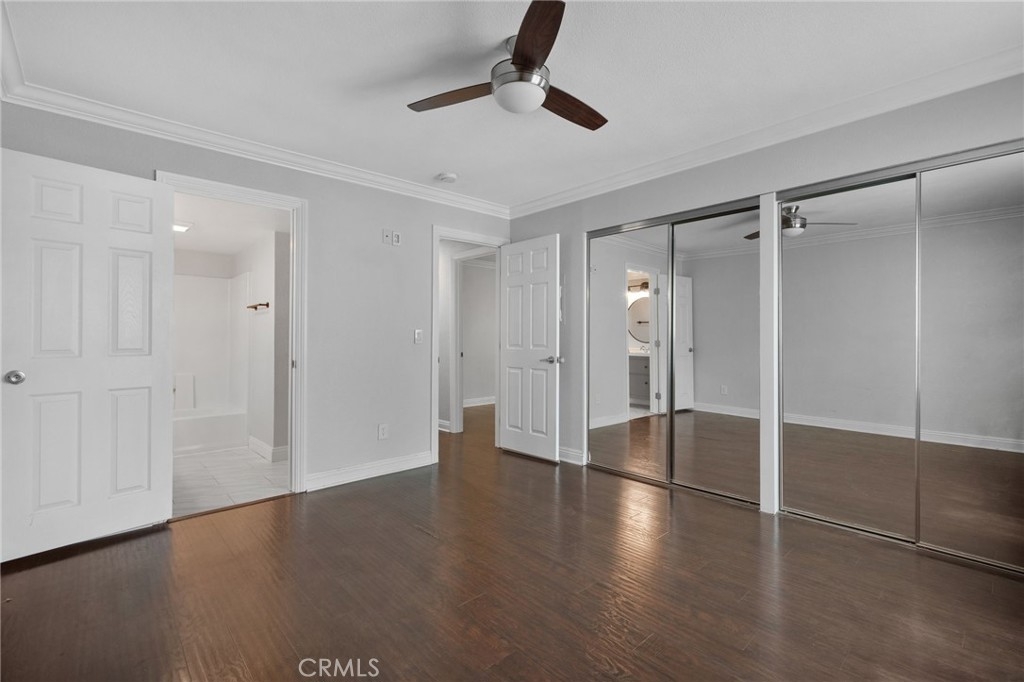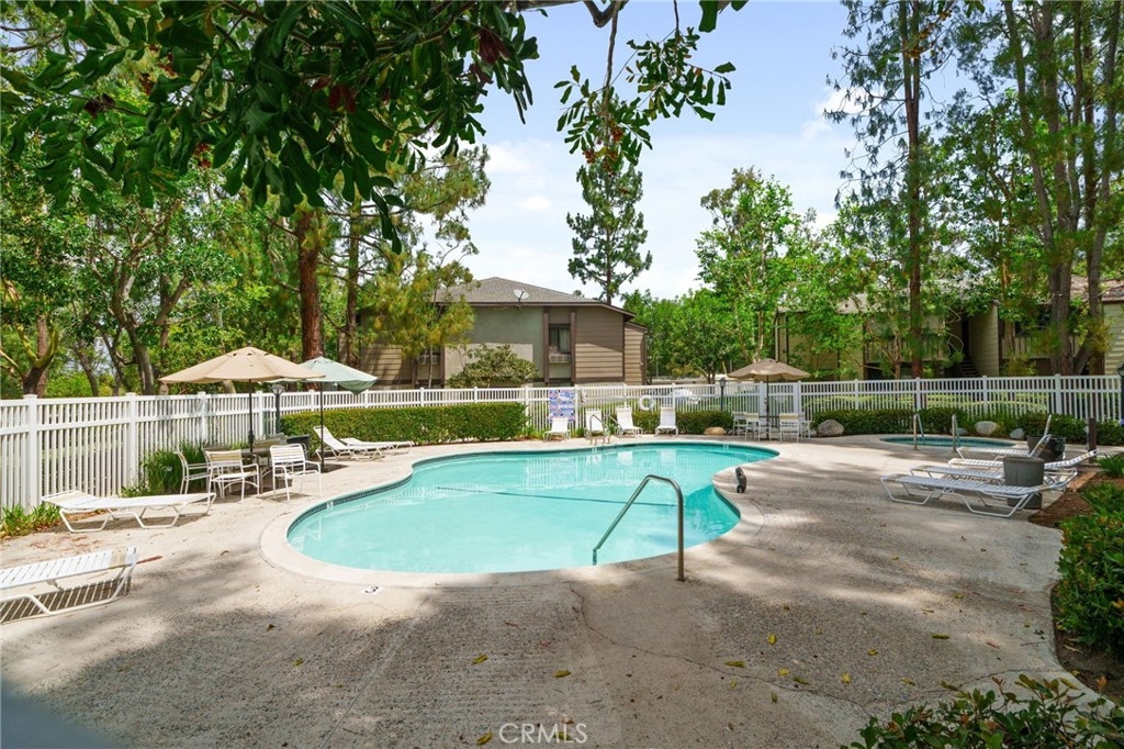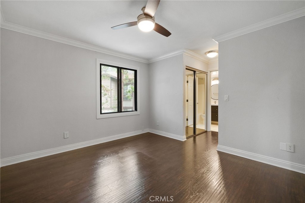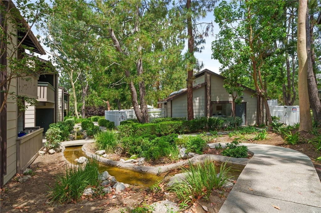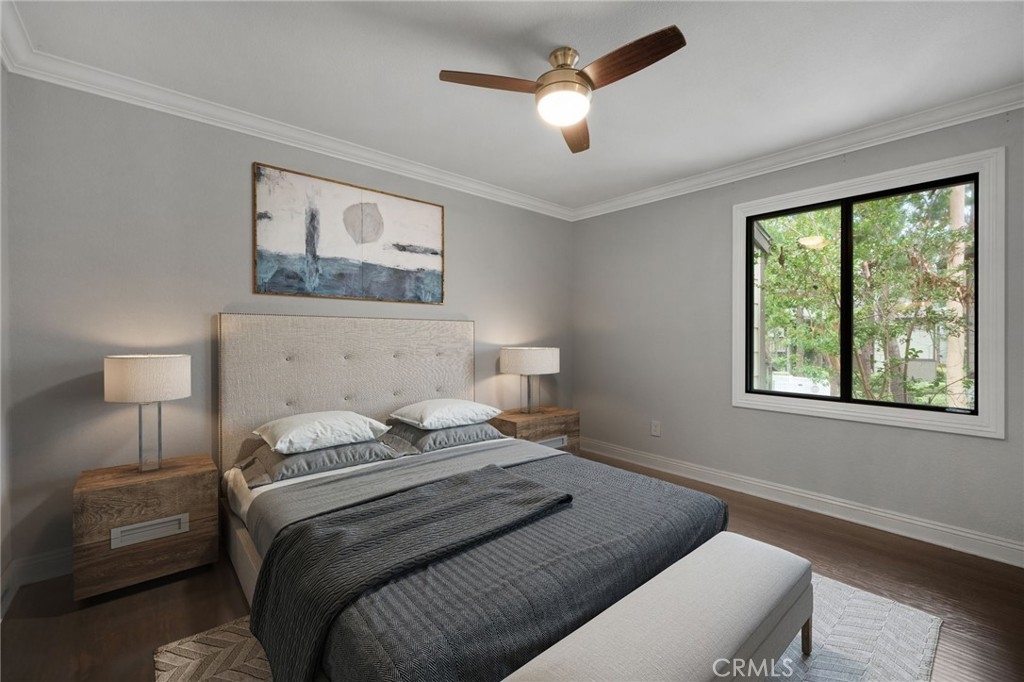 Stunning and Impeccable! This beautiful2 bedroom, 2 bathroom home is nestled in the Pheasant Creek complex, featuring streams, ponds, and mature trees. Positioned as an end unit, it offers 2 master bedrooms, 2 bathrooms, a large balcony with a view, a 1-car garage, and an assigned parking space. The spacious living room boasts recessed lighting and a sliding glass door leading to a tranquil balcony. The open kitchen, adorned with upgraded cabinets, granite countertops, recessed lighting, and stainless steel appliances, seamlessly flows into the living/dining area. The home showcases laminate wood flooring and custom paint throughout. The hallway features a built-in desk and cabinets. The expansive primary suite includes 2 closets with mirrored doors. The generous secondary bedroom, with its own full bath, has ample closet space with mirrored doors. Both bedrooms and the living room have upgraded ceiling fans. A laundry closet on the patio provides extra storage space and convenient designated laundry space. Crown molding is present in the bedrooms and hallway. This prime location is close to ponds, pools, and water streams running through the community. The homeowner association covers water, trash, and exterior maintenance. Resort-like amenities include lush pathways, streams, ponds, pools, tennis, and basketball courts. It's conveniently located near schools, shopping, parks, Saddleback Church, Irvine Spectrum, walking/biking trails, and a sports park. Washer, dryer, and refrigerator are included!