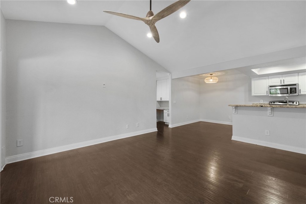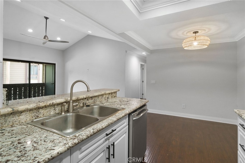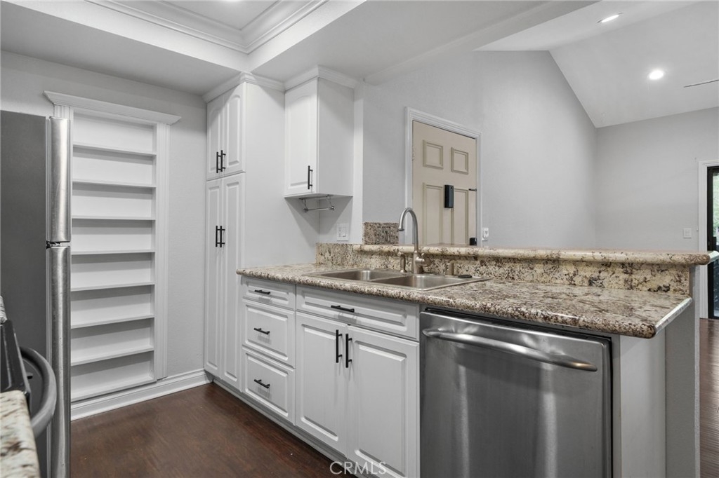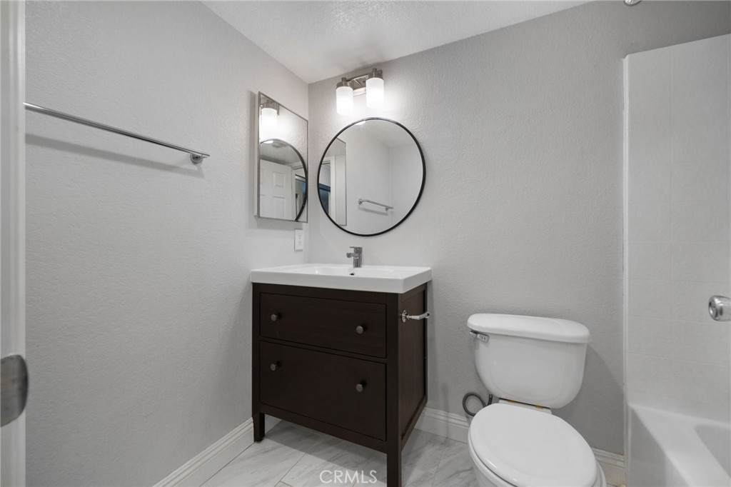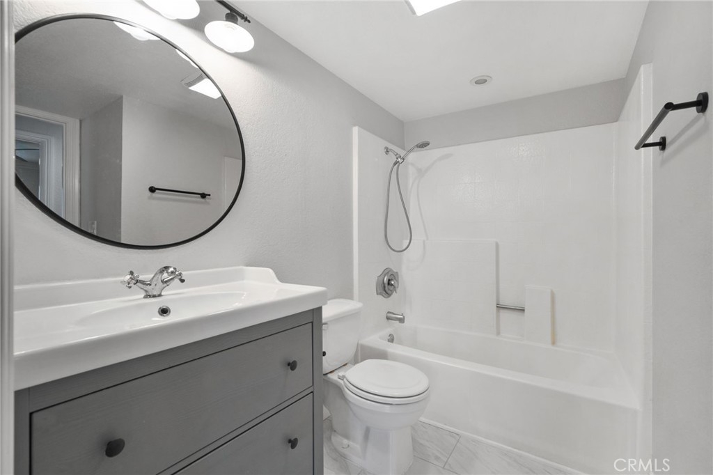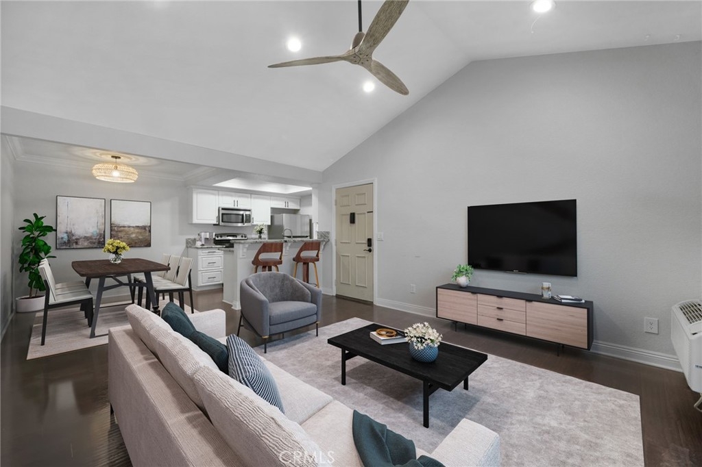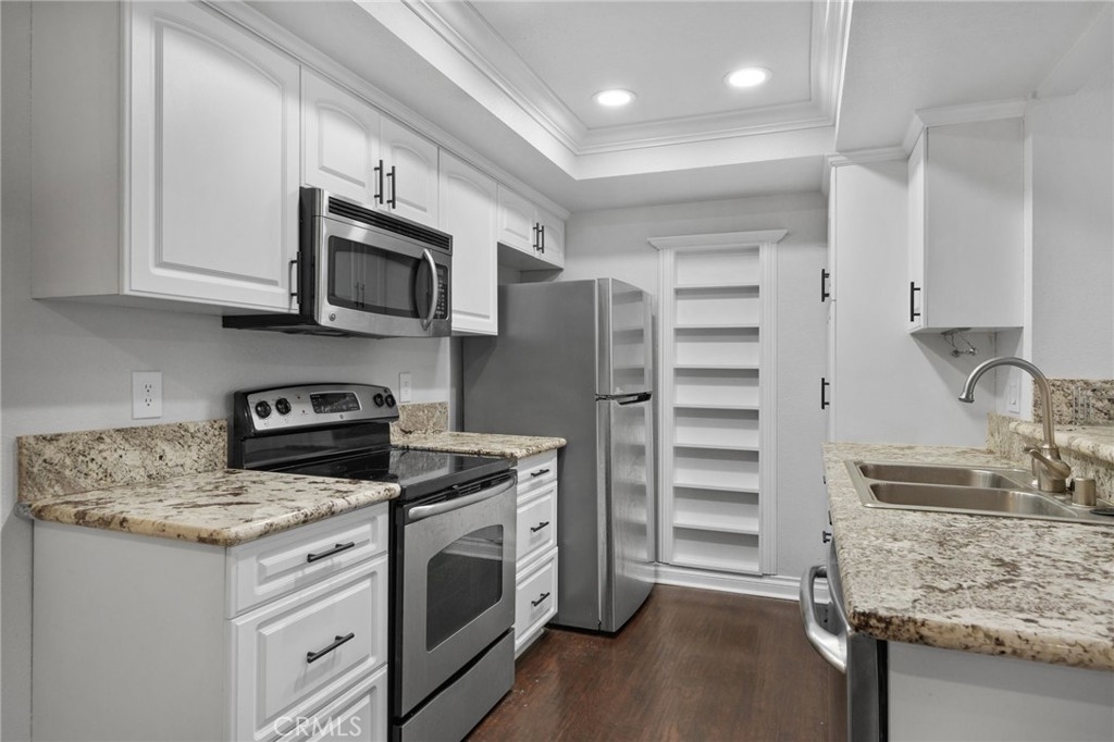 Stunning and Impeccable! This beautiful2 bedroom, 2 bathroom home is nestled in the Pheasant Creek complex, featuring streams, ponds, and mature trees. Positioned as an end unit, it offers 2 master bedrooms, 2 bathrooms, a large balcony with a view, a 1-car garage, and an assigned parking space. The spacious living room boasts recessed lighting and a sliding glass door leading to a tranquil balcony. The open kitchen, adorned with upgraded cabinets, granite countertops, recessed lighting, and stainless steel appliances, seamlessly flows into the living/dining area. The home showcases laminate wood flooring and custom paint throughout. The hallway features a built-in desk and cabinets. The expansive primary suite includes 2 closets with mirrored doors. The generous secondary bedroom, with its own full bath, has ample closet space with mirrored doors. Both bedrooms and the living room have upgraded ceiling fans. A laundry closet on the patio provides extra storage space and convenient designated laundry space. Crown molding is present in the bedrooms and hallway. This prime location is close to ponds, pools, and water streams running through the community. The homeowner association covers water, trash, and exterior maintenance. Resort-like amenities include lush pathways, streams, ponds, pools, tennis, and basketball courts. It's conveniently located near schools, shopping, parks, Saddleback Church, Irvine Spectrum, walking/biking trails, and a sports park. Washer, dryer, and refrigerator are included!