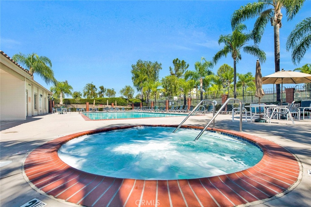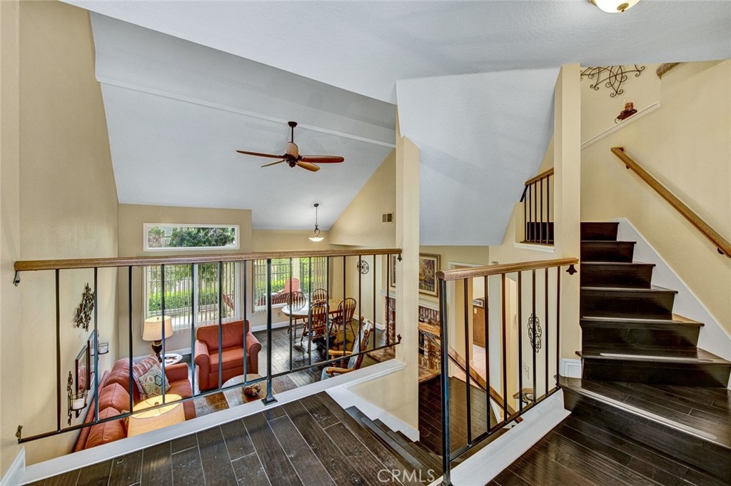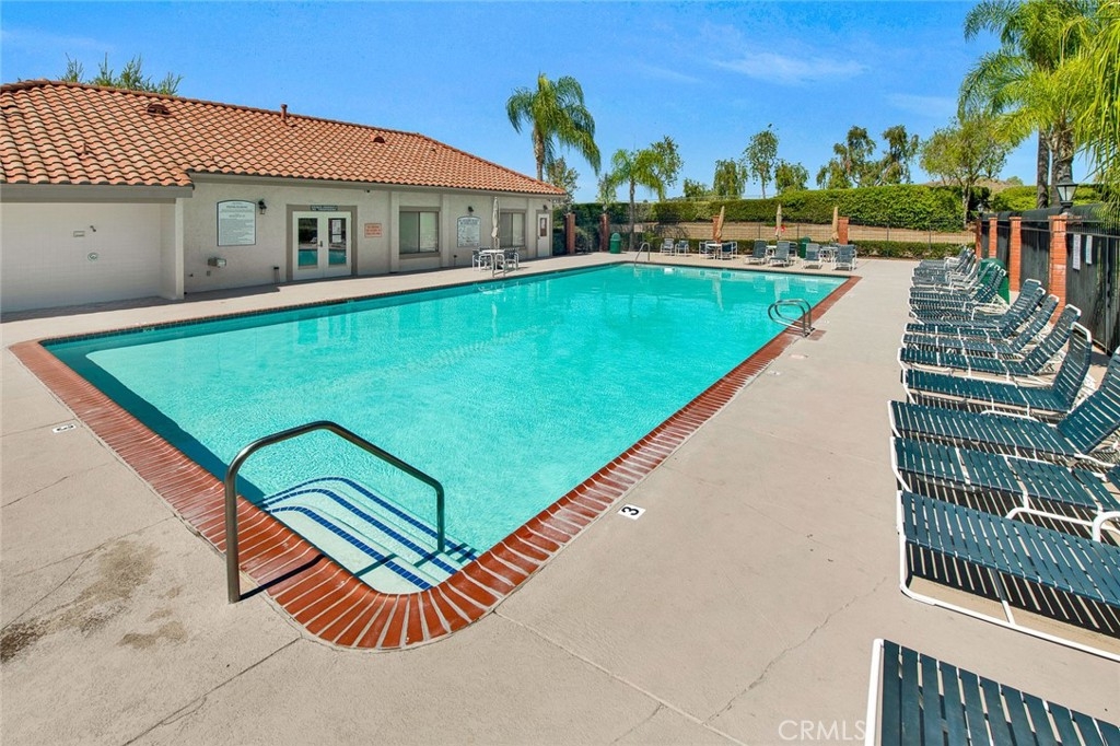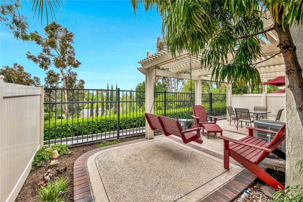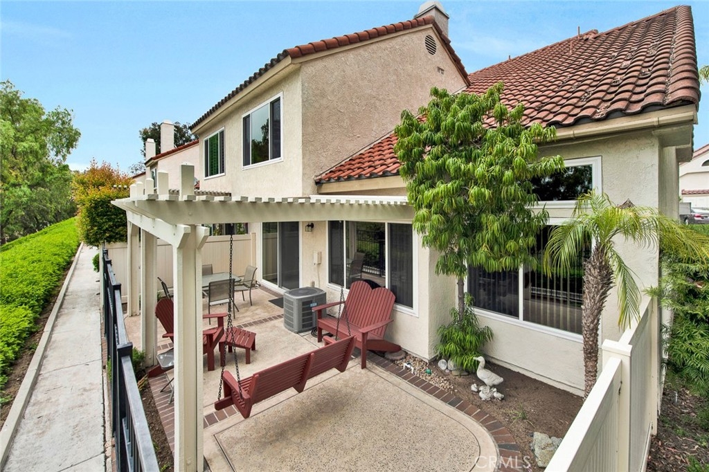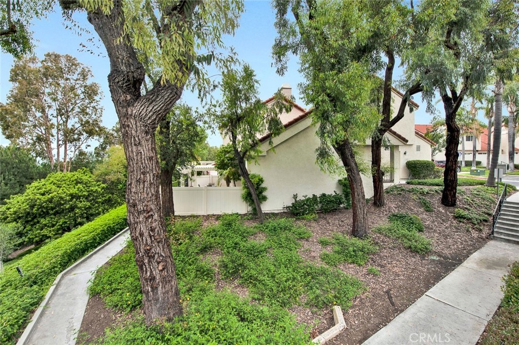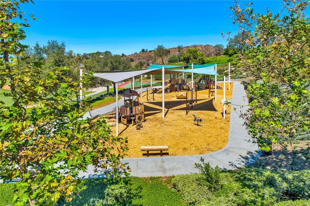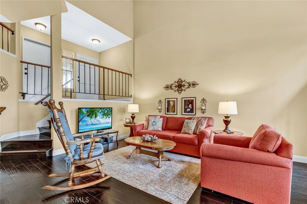 This highly desirable end-unit condo is bordered by a greenbelt buffer and offers panoramic pastoral views by day and spectacular sunsets as your day winds down! Meticulously maintained throughout, it features a large primary bedroom/bath suite a half level up from the entry and two additional bedrooms another half level above the primary. Walk-in closets in the primary and guest bedrooms. The lower level has a living room with two-story ceilings, a used brick fireplace and dining area, both overlooking the patio and views beyond. The kitchen walks out to the patio and features a generously sized breakfast nook, as well as bar seating at the granite counter peninsula. Solid oak cabinetry has been refinished. A half bath is conveniently located off the kitchen/living areas. Handsome dark wood flooring, newer windows, vertical blinds, and opaque glass ceiling fixtures accent the interior. Attached garage offers multiple storage cabinets and loft storage. San Remo Villas residents enjoy their own recreation facilities including pool, spa, pickleball/tennis/sports courts and clubhouse facilities + use of beautiful Tamarisk Park and play areas through the Serrano Highland master association.