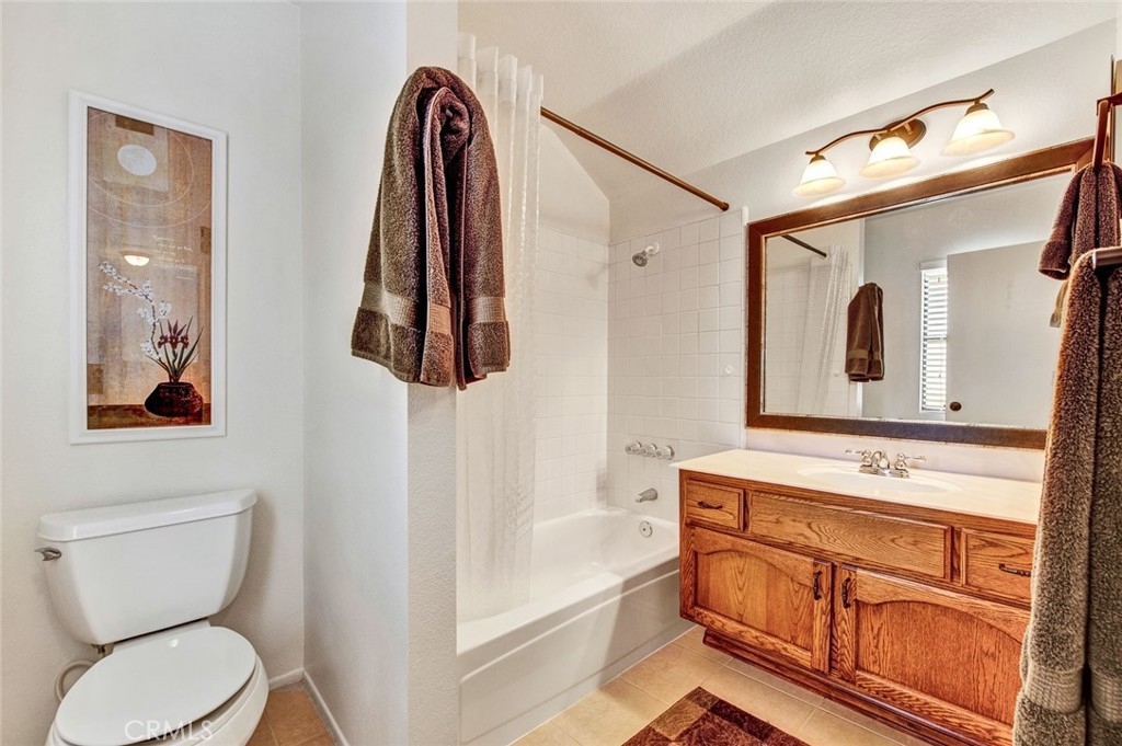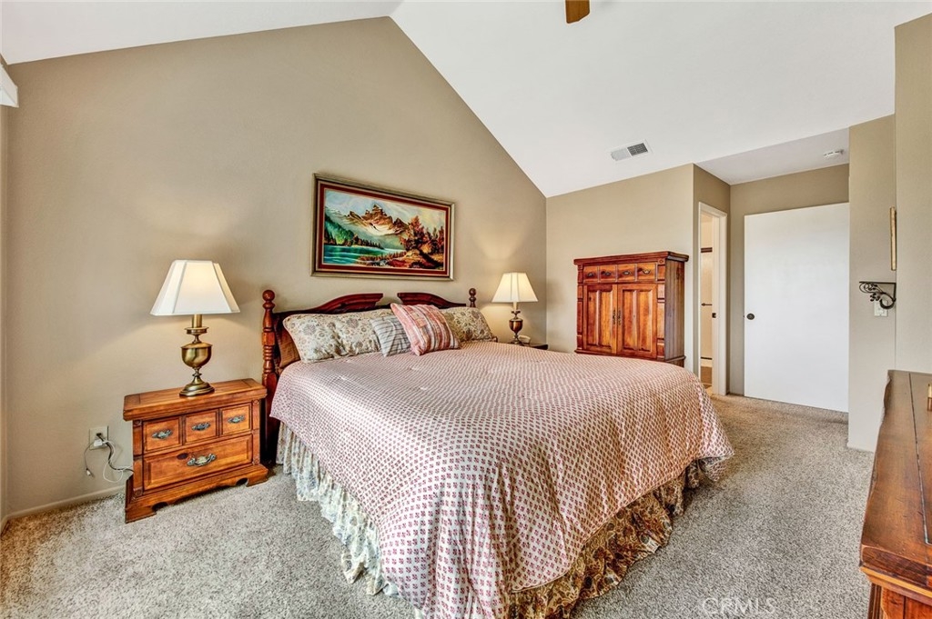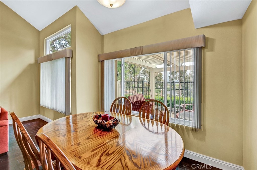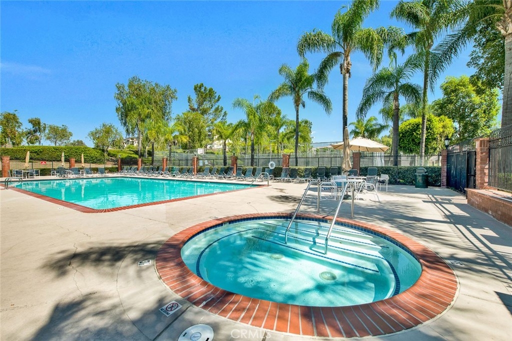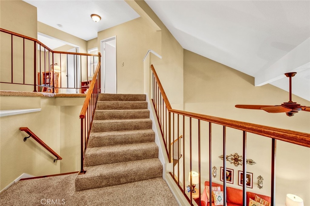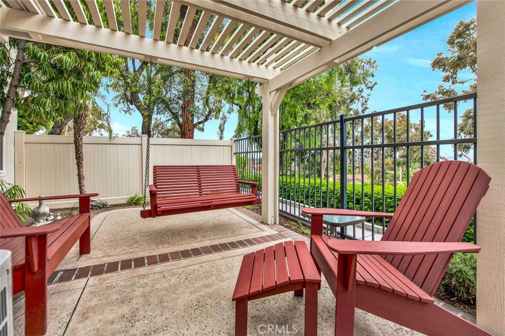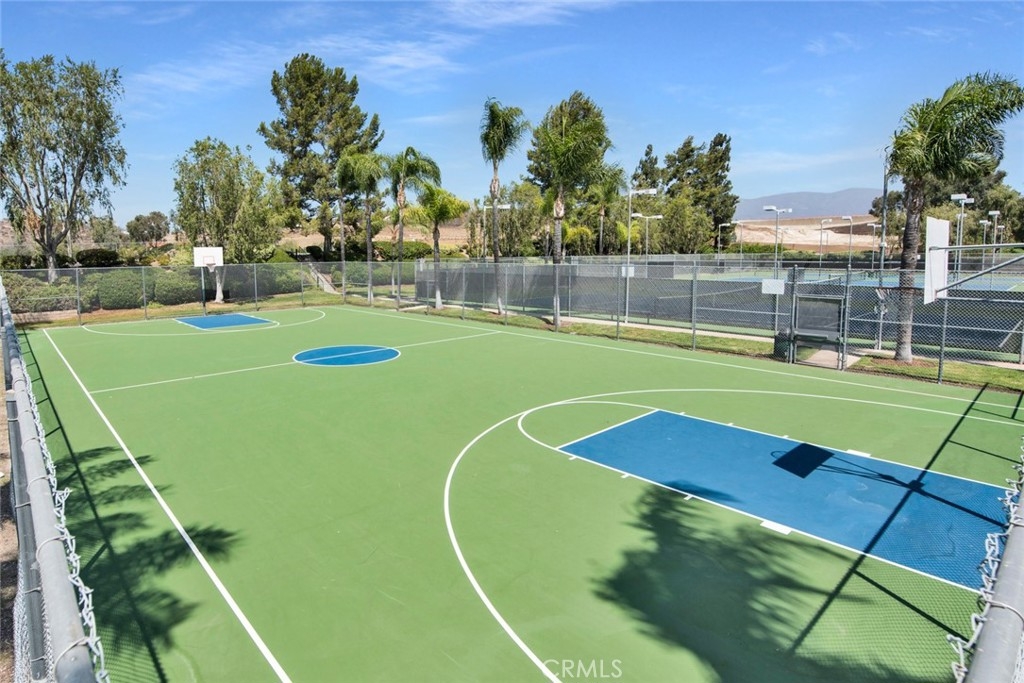This highly desirable end-unit condo is bordered by a greenbelt buffer and offers panoramic pastoral views by day and spectacular sunsets as your day winds down! Meticulously maintained throughout, it features a large primary bedroom/bath suite a half level up from the entry and two additional bedrooms another half level above the primary. Walk-in closets in the primary and guest bedrooms. The lower level has a living room with two-story ceilings, a used brick fireplace and dining area, both overlooking the patio and views beyond. The kitchen walks out to the patio and features a generously sized breakfast nook, as well as bar seating at the granite counter peninsula. Solid oak cabinetry has been refinished. A half bath is conveniently located off the kitchen/living areas. Handsome dark wood flooring, newer windows, vertical blinds, and opaque glass ceiling fixtures accent the interior. Attached garage offers multiple storage cabinets and loft storage. San Remo Villas residents enjoy their own recreation facilities including pool, spa, pickleball/tennis/sports courts and clubhouse facilities + use of beautiful Tamarisk Park and play areas through the Serrano Highland master association.