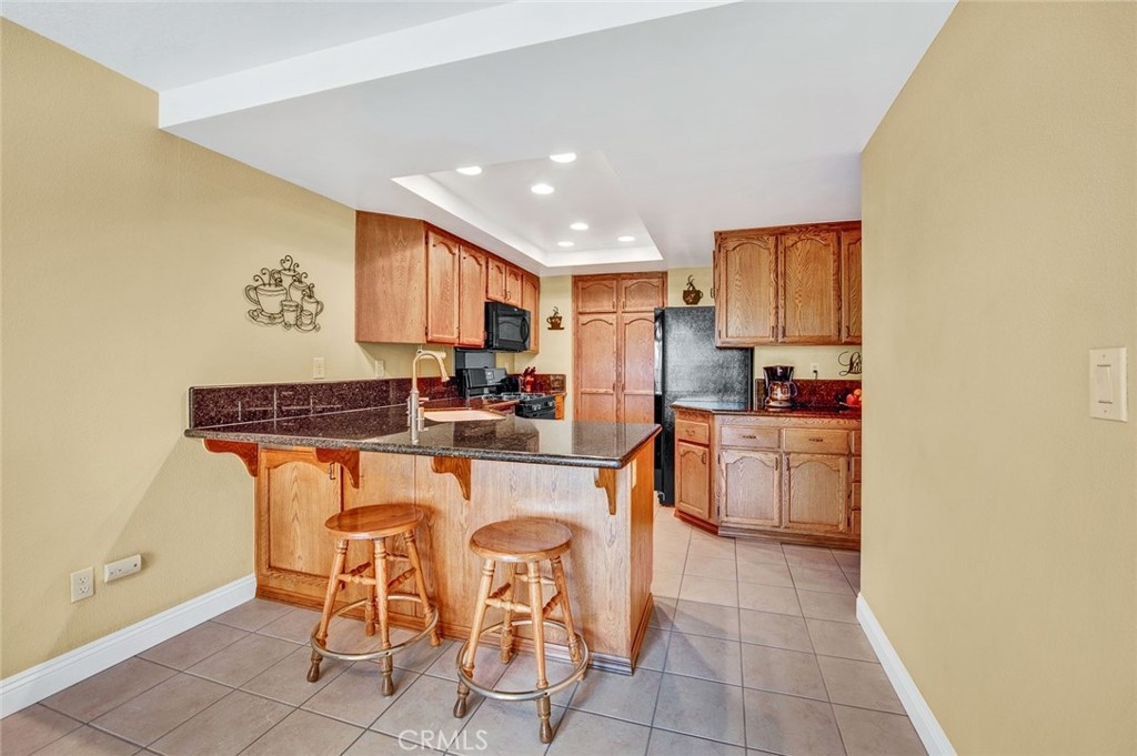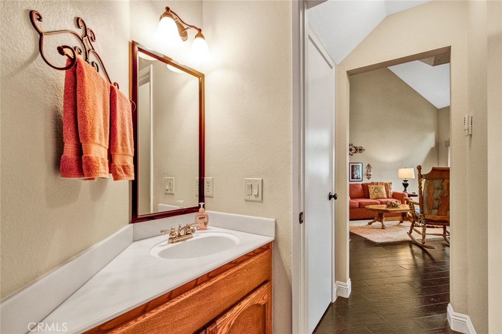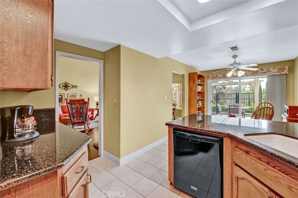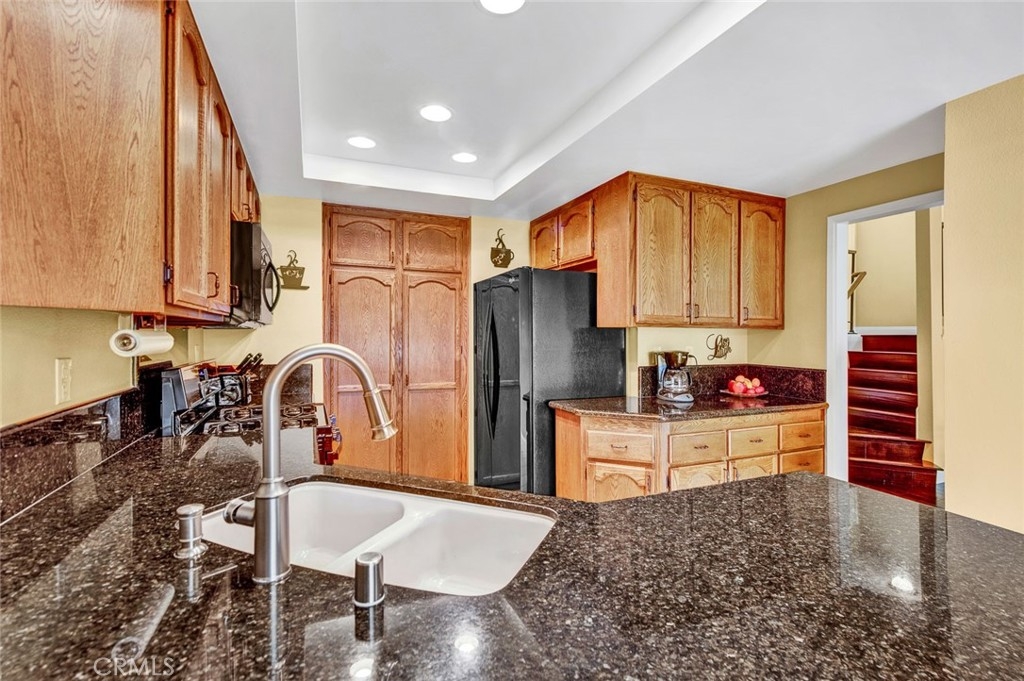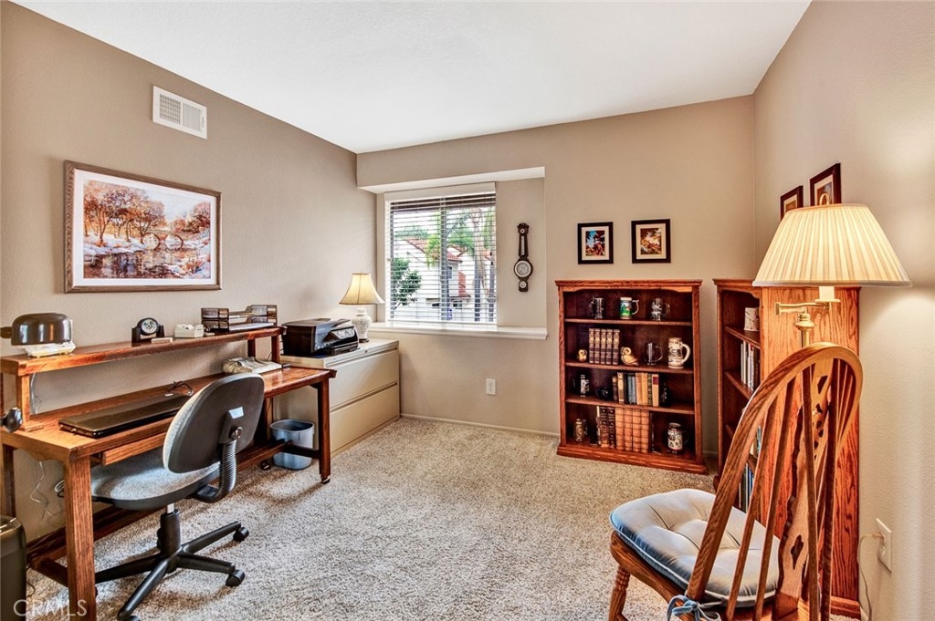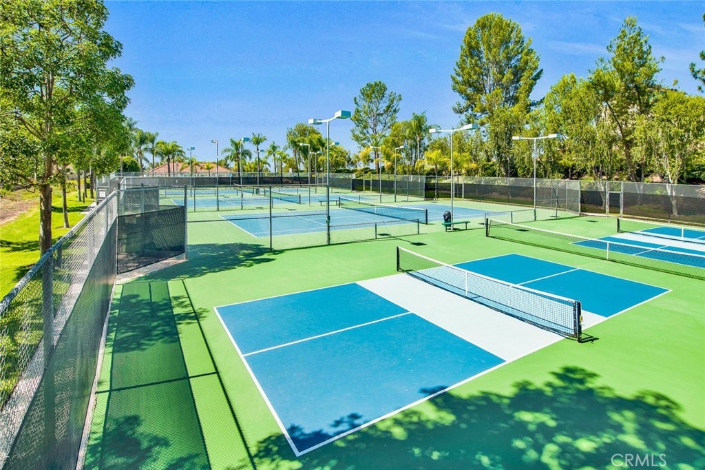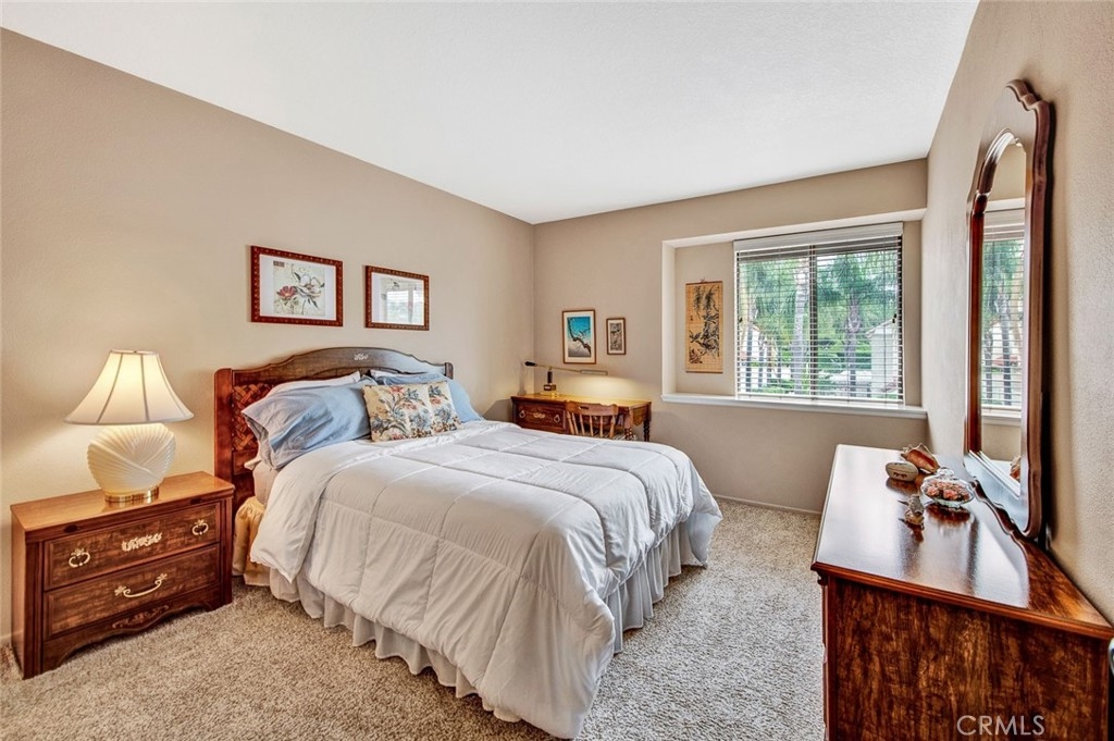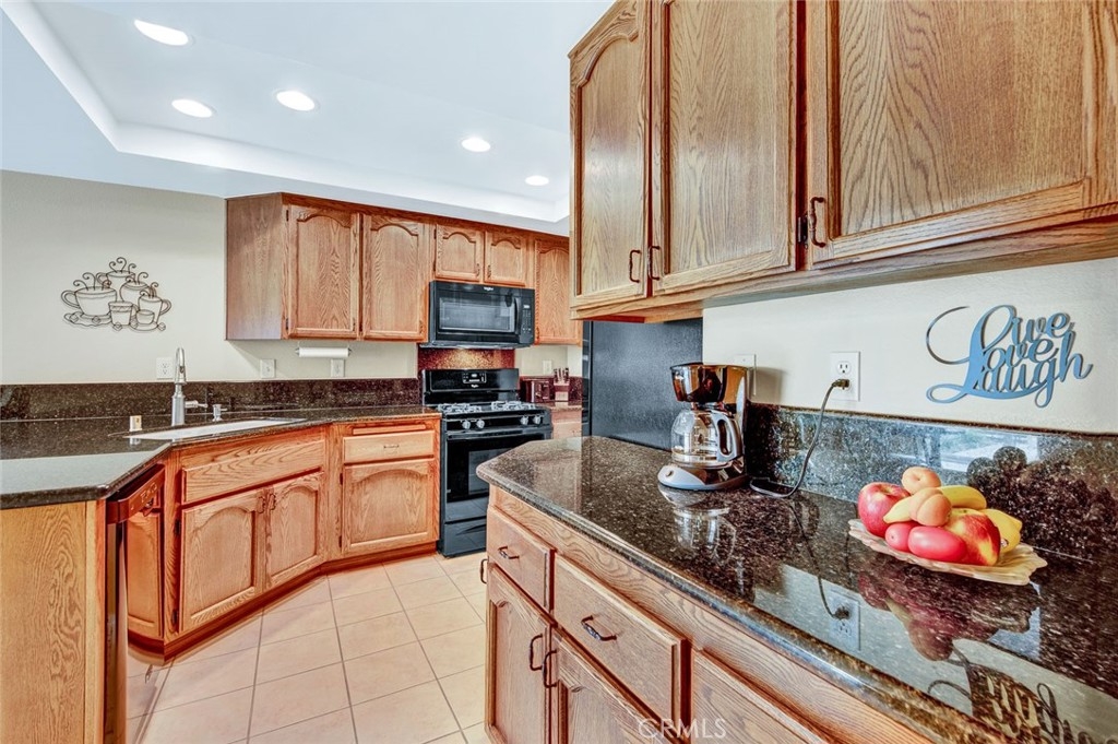 This highly desirable end-unit condo is bordered by a greenbelt buffer and offers panoramic pastoral views by day and spectacular sunsets as your day winds down! Meticulously maintained throughout, it features a large primary bedroom/bath suite a half level up from the entry and two additional bedrooms another half level above the primary. Walk-in closets in the primary and guest bedrooms. The lower level has a living room with two-story ceilings, a used brick fireplace and dining area, both overlooking the patio and views beyond. The kitchen walks out to the patio and features a generously sized breakfast nook, as well as bar seating at the granite counter peninsula. Solid oak cabinetry has been refinished. A half bath is conveniently located off the kitchen/living areas. Handsome dark wood flooring, newer windows, vertical blinds, and opaque glass ceiling fixtures accent the interior. Attached garage offers multiple storage cabinets and loft storage. San Remo Villas residents enjoy their own recreation facilities including pool, spa, pickleball/tennis/sports courts and clubhouse facilities + use of beautiful Tamarisk Park and play areas through the Serrano Highland master association.