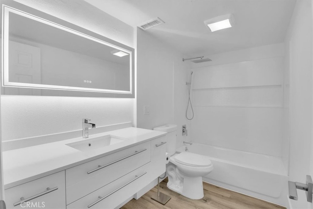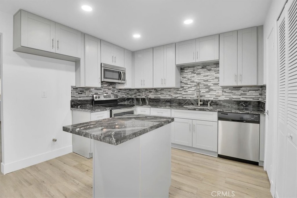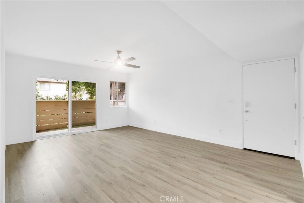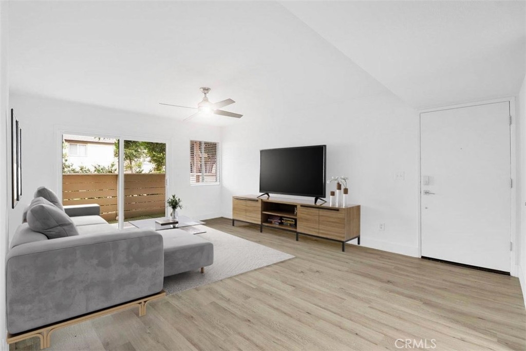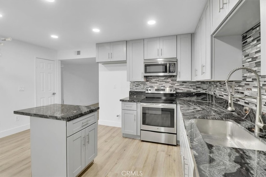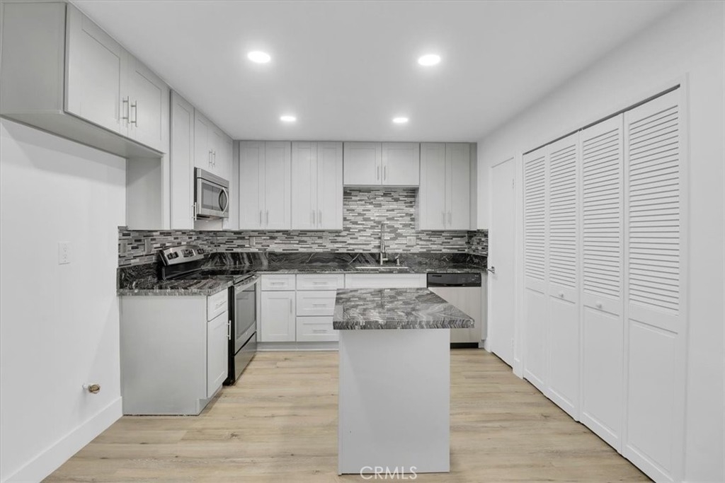 Beautiful recently remodeled 2 bedroom condo. Multiple upgrades throughout! Interior location end-unit. Featuring newly updated kitchen cabinets, countertops, gorgeous backsplash, custom island, custom additional lighting, pantry, inside laundry area which conveniently includes washer and dryer with extra cabinets. Entire home has been freshly painted and has new luxury vinyl flooring throughout. Open floor plan with light and bright living room also includes a beautiful modern ceiling fan which uses little energy and helps to improve air flow, cooling the home during the summer while also circulating the warm air during the winter. Also includes Nest to operate the AC unit. The new sliding glass door leads to the stunning tiled patio that also features a pet friendly artificial turf grass area. The two spacious bedrooms include new spacious mirrored closet doors and new blinds. Enjoy the large and functional bathroom that has been completely upgraded with new shower/tub combo, modern vanity, LED smart mirror and new toilet. The community of Serrano Creek Villas includes a pool, spa, clubhouse and guest parking. The HOA dues cover trash and water. Parking includes 1 assigned covered carport. Short drive to Whiting Ranch Wilderness Park, shopping center, dining and entertainment options and freeway access. Do not miss this opportunity.