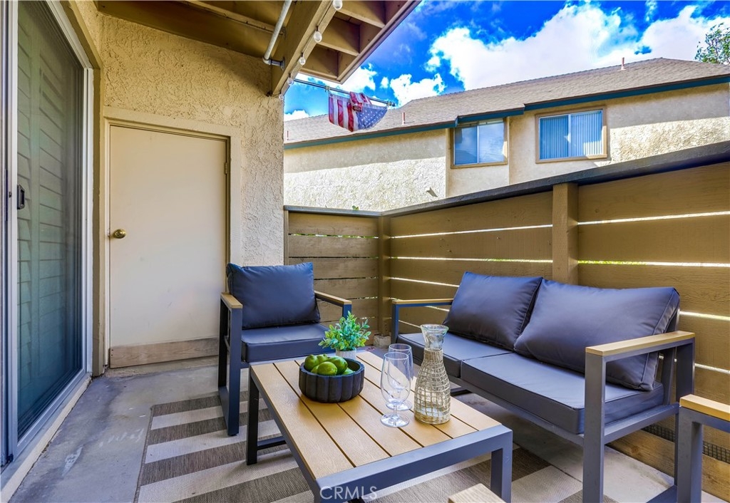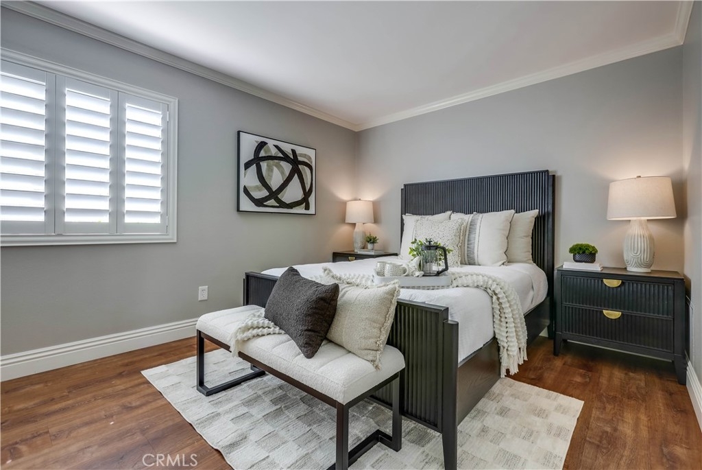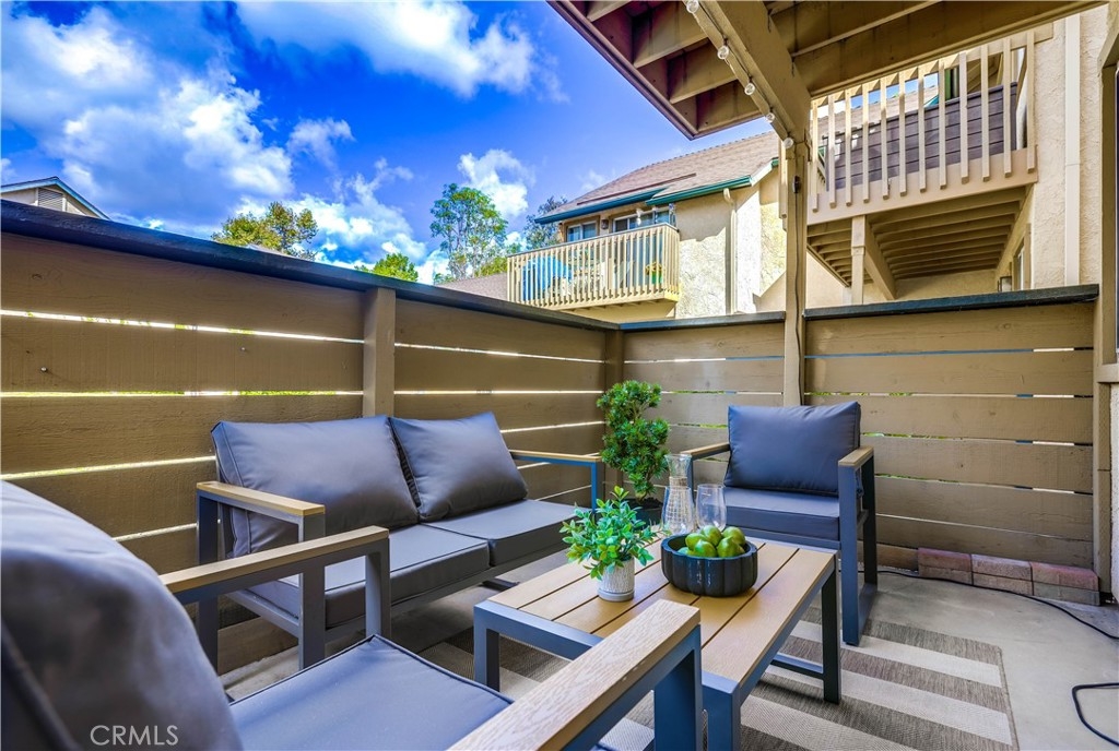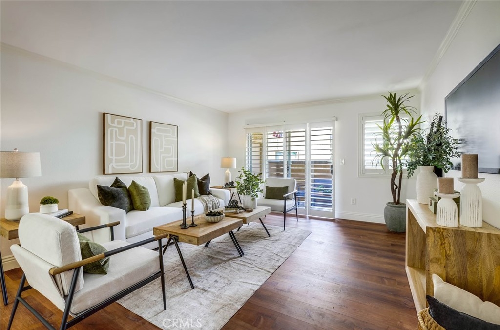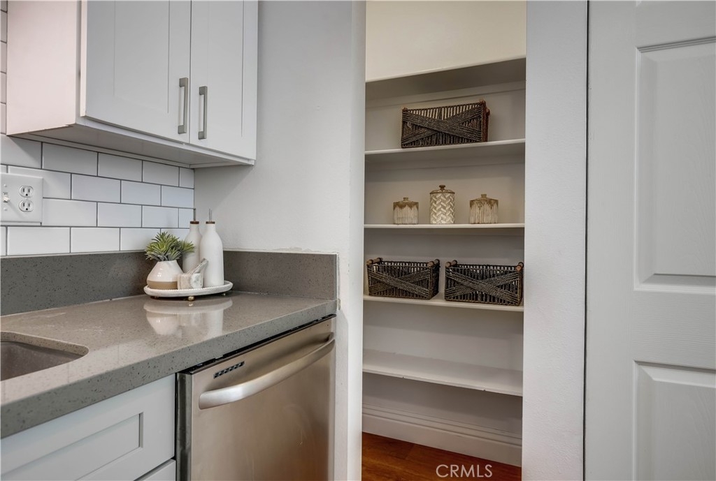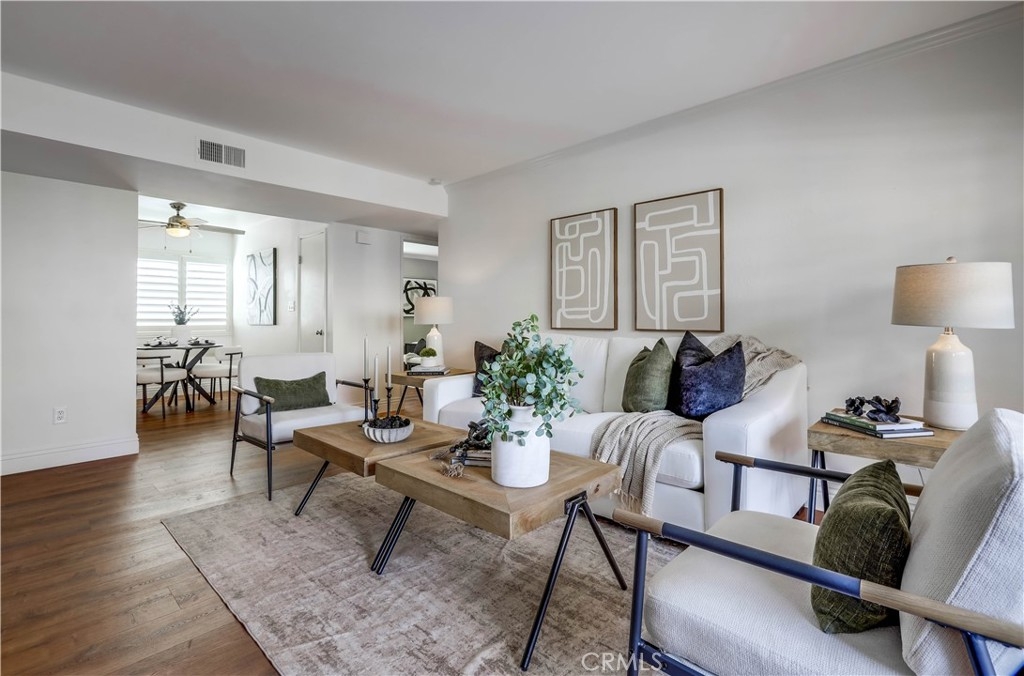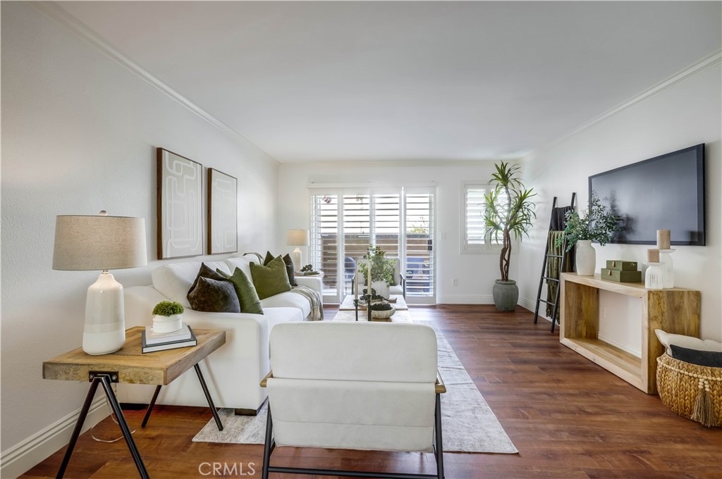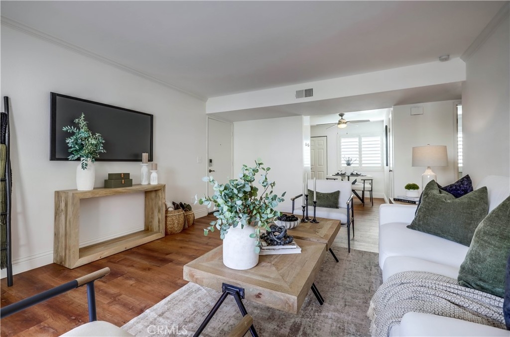 Beautifully updated and improved lower-level end unit in the desirable Serrano Creek Villas community, blessed with a peaceful and private location tucked back in the community surrounded by green spaces providing a peaceful living environment. Step inside and soak in the light and bright, freshly painted interior with new commercial grade scratch resistant Trail Oak Luxury Vinyl Wide Plank flooring throughout, crown molding, and plantation shutters setting the stage for an ideal living space. The spacious living room has direct access through sliders to the covered patio providing an ideal indoor-outdoor living space. The sparkling kitchen has updated soft close cabinetry, Quartz countertops, new hardware and pulls, undermount sink, subway tile full backsplash, stainless-steel appliances, a large walk-in pantry with plenty of storage, a laundry closet with full size washer and dryer, and a sunny dining area open to the living room, perfect for entertaining friends and family. Two spacious bedrooms with closet organizers, crown molding, plantation shutters, and a handsome upgraded bathroom with granite topped vanity, framed vanity mirror, updated lighting, and tiled shower surround with glass tile details. The covered, enclosed, private patio is a welcoming space for enjoying a morning cup of coffee with a loved one, al fresco dining, or relaxing and gatherings. Additional improvements include a New AC unit installed in 2023. Just a short stroll to the community clubhouse, pool, and spa. 1 covered carport space #253 included. Serrano Creek Villas is a quiet and friendly community with serene walking paths, an abundance of parking, surrounded by lush mature landscapes. HOA covers Water & Trash. Ideally located within walking distance of hiking, biking, and running trails, close to dining and shopping, easy Toll Road and 5 Freeway access, and just minutes from local beaches.