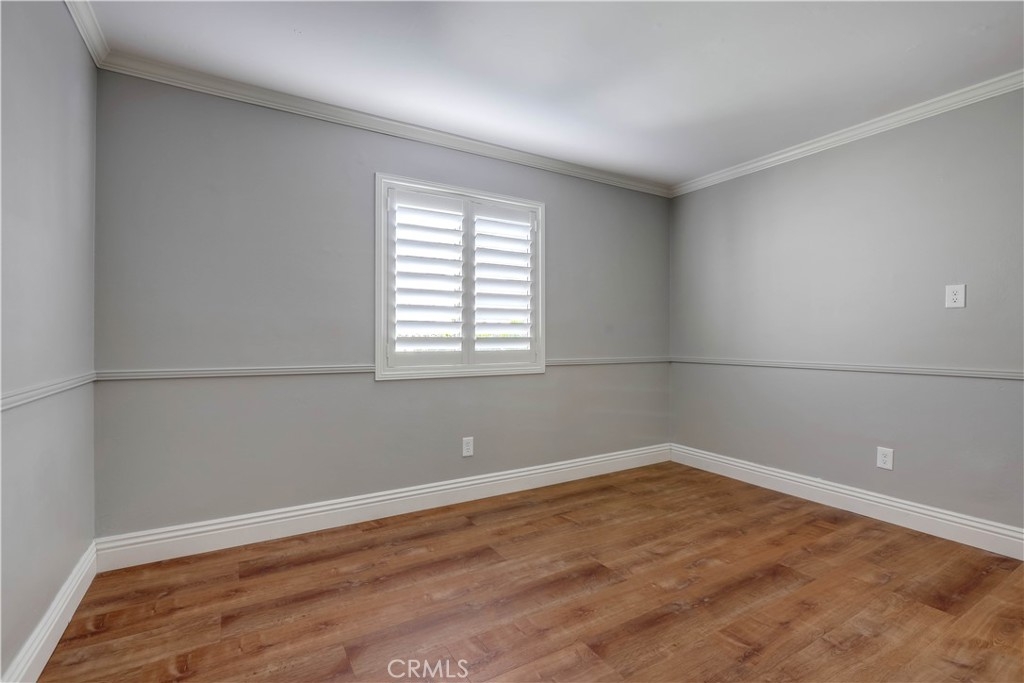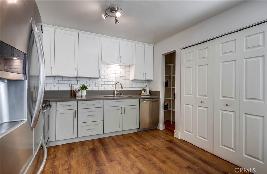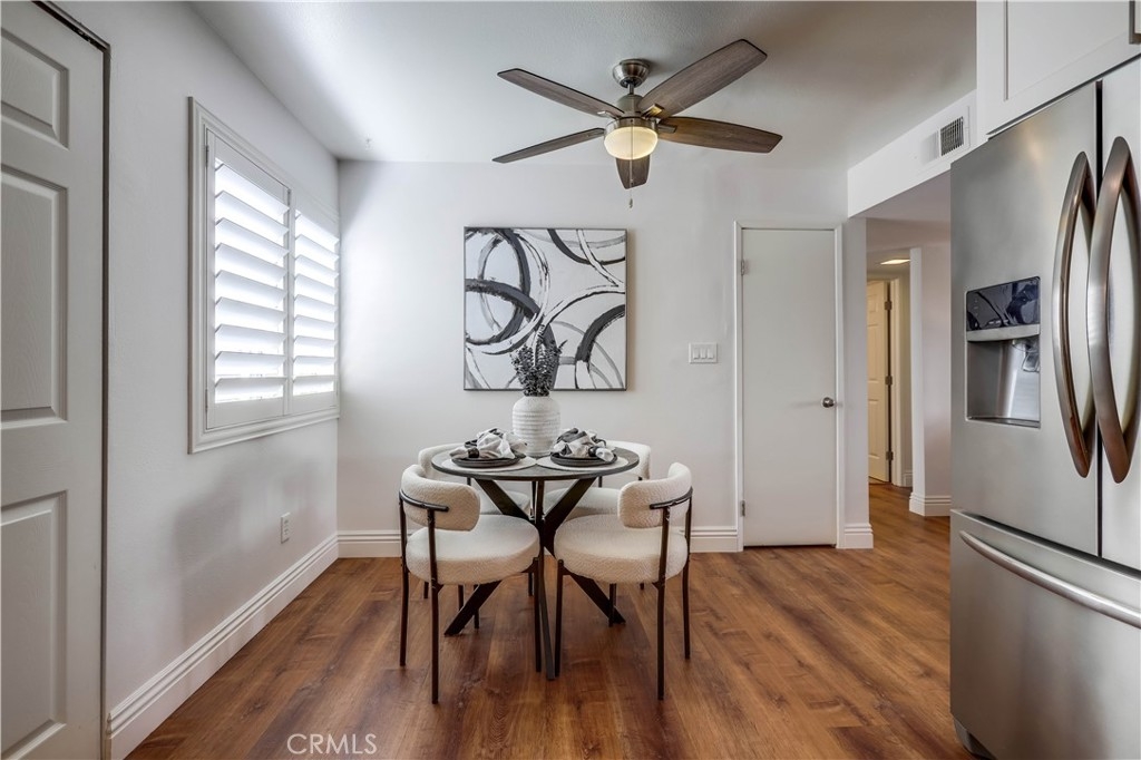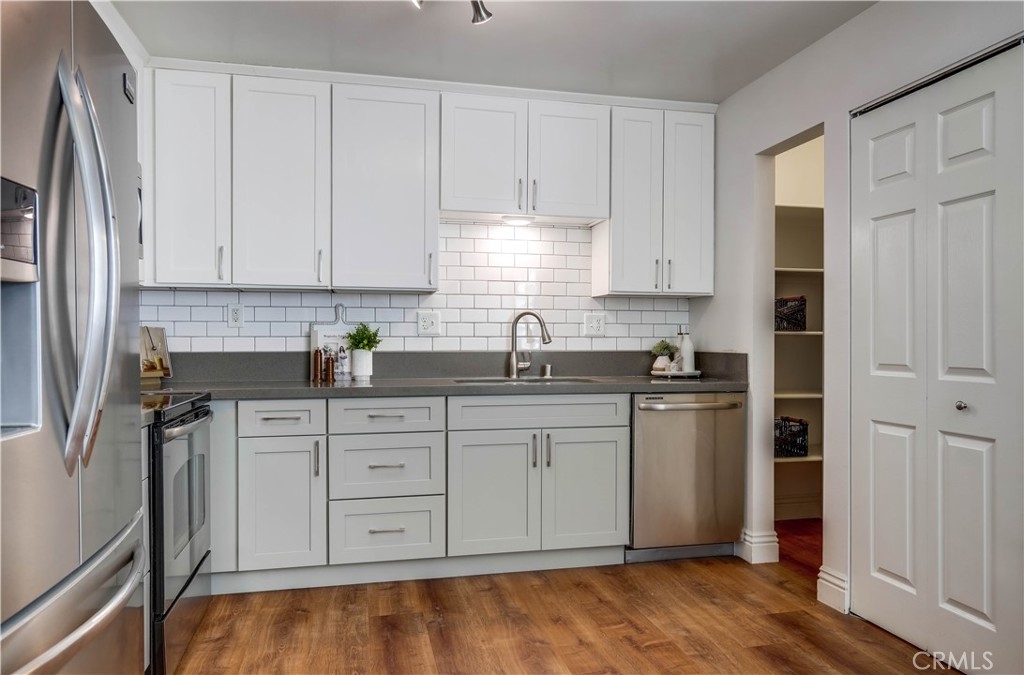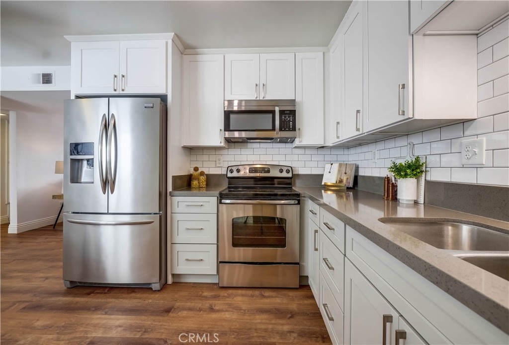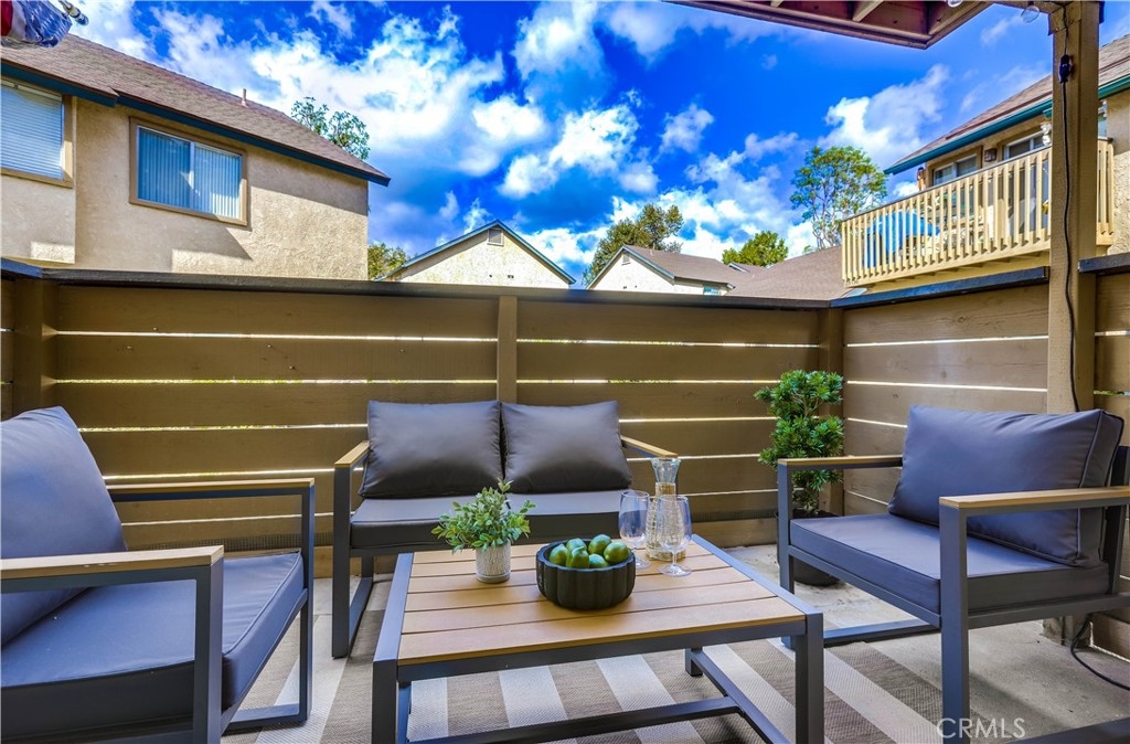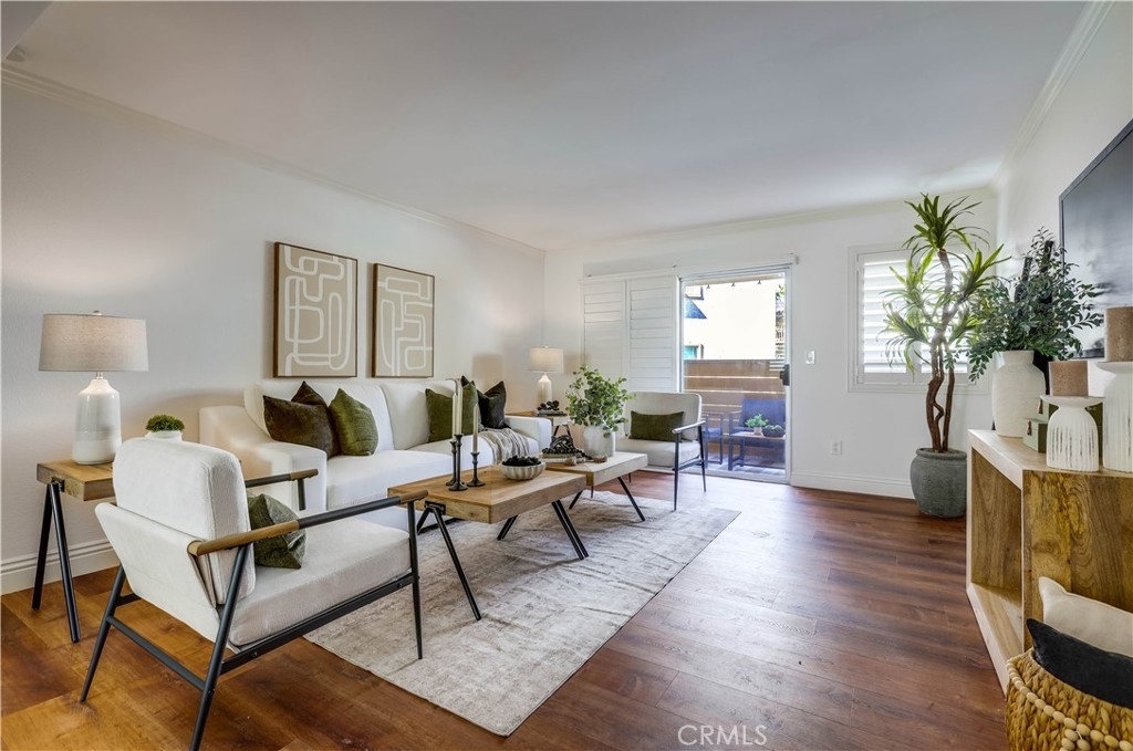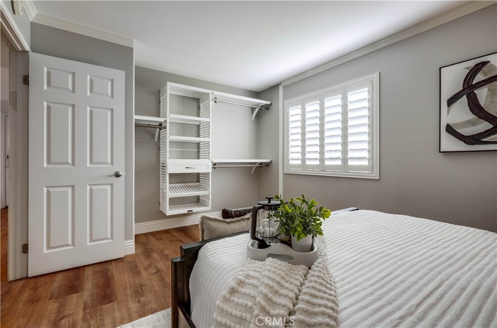 Beautifully updated and improved lower-level end unit in the desirable Serrano Creek Villas community, blessed with a peaceful and private location tucked back in the community surrounded by green spaces providing a peaceful living environment. Step inside and soak in the light and bright, freshly painted interior with new commercial grade scratch resistant Trail Oak Luxury Vinyl Wide Plank flooring throughout, crown molding, and plantation shutters setting the stage for an ideal living space. The spacious living room has direct access through sliders to the covered patio providing an ideal indoor-outdoor living space. The sparkling kitchen has updated soft close cabinetry, Quartz countertops, new hardware and pulls, undermount sink, subway tile full backsplash, stainless-steel appliances, a large walk-in pantry with plenty of storage, a laundry closet with full size washer and dryer, and a sunny dining area open to the living room, perfect for entertaining friends and family. Two spacious bedrooms with closet organizers, crown molding, plantation shutters, and a handsome upgraded bathroom with granite topped vanity, framed vanity mirror, updated lighting, and tiled shower surround with glass tile details. The covered, enclosed, private patio is a welcoming space for enjoying a morning cup of coffee with a loved one, al fresco dining, or relaxing and gatherings. Additional improvements include a New AC unit installed in 2023. Just a short stroll to the community clubhouse, pool, and spa. 1 covered carport space #253 included. Serrano Creek Villas is a quiet and friendly community with serene walking paths, an abundance of parking, surrounded by lush mature landscapes. HOA covers Water & Trash. Ideally located within walking distance of hiking, biking, and running trails, close to dining and shopping, easy Toll Road and 5 Freeway access, and just minutes from local beaches.