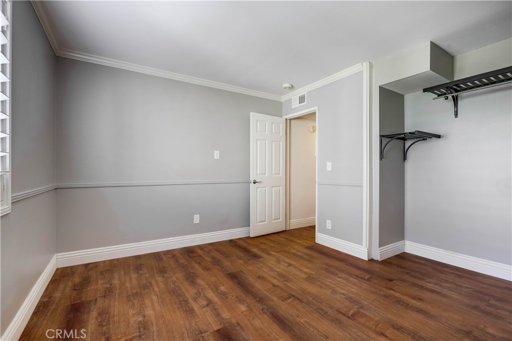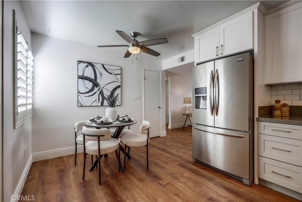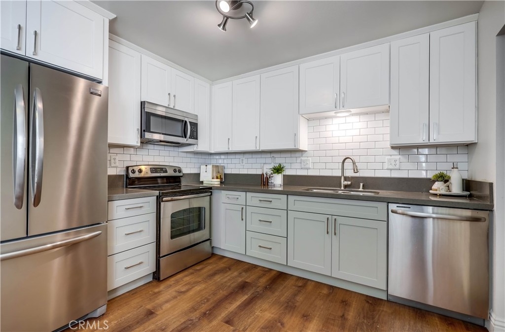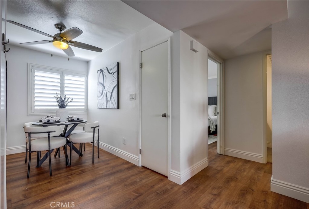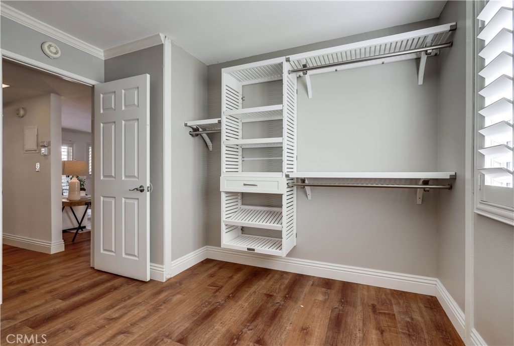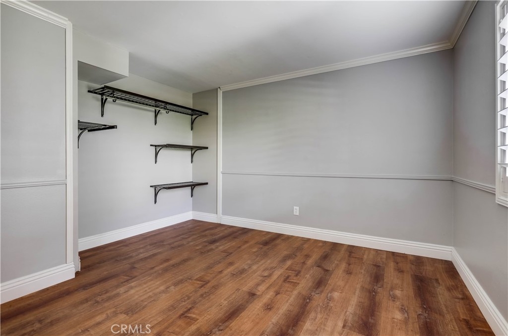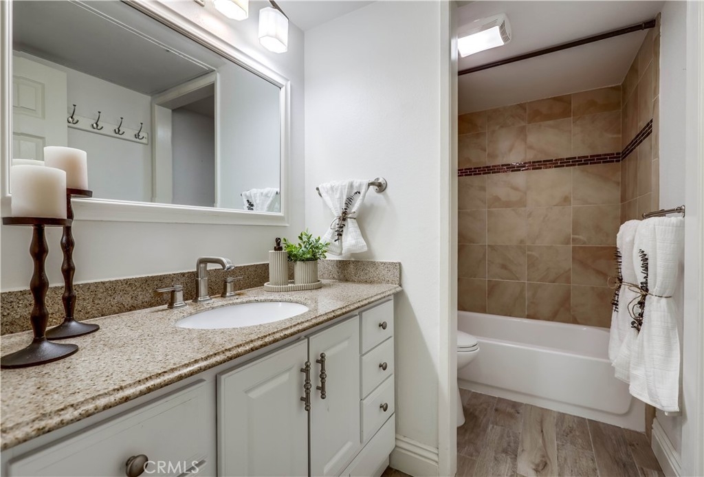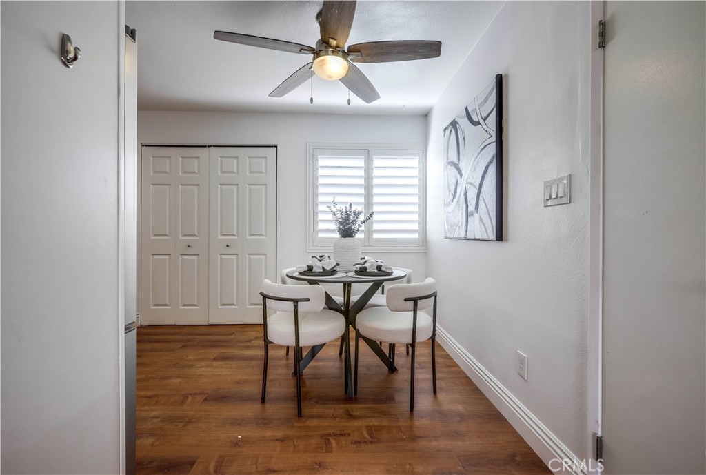 Beautifully updated and improved lower-level end unit in the desirable Serrano Creek Villas community, blessed with a peaceful and private location tucked back in the community surrounded by green spaces providing a peaceful living environment. Step inside and soak in the light and bright, freshly painted interior with new commercial grade scratch resistant Trail Oak Luxury Vinyl Wide Plank flooring throughout, crown molding, and plantation shutters setting the stage for an ideal living space. The spacious living room has direct access through sliders to the covered patio providing an ideal indoor-outdoor living space. The sparkling kitchen has updated soft close cabinetry, Quartz countertops, new hardware and pulls, undermount sink, subway tile full backsplash, stainless-steel appliances, a large walk-in pantry with plenty of storage, a laundry closet with full size washer and dryer, and a sunny dining area open to the living room, perfect for entertaining friends and family. Two spacious bedrooms with closet organizers, crown molding, plantation shutters, and a handsome upgraded bathroom with granite topped vanity, framed vanity mirror, updated lighting, and tiled shower surround with glass tile details. The covered, enclosed, private patio is a welcoming space for enjoying a morning cup of coffee with a loved one, al fresco dining, or relaxing and gatherings. Additional improvements include a New AC unit installed in 2023. Just a short stroll to the community clubhouse, pool, and spa. 1 covered carport space #253 included. Serrano Creek Villas is a quiet and friendly community with serene walking paths, an abundance of parking, surrounded by lush mature landscapes. HOA covers Water & Trash. Ideally located within walking distance of hiking, biking, and running trails, close to dining and shopping, easy Toll Road and 5 Freeway access, and just minutes from local beaches.