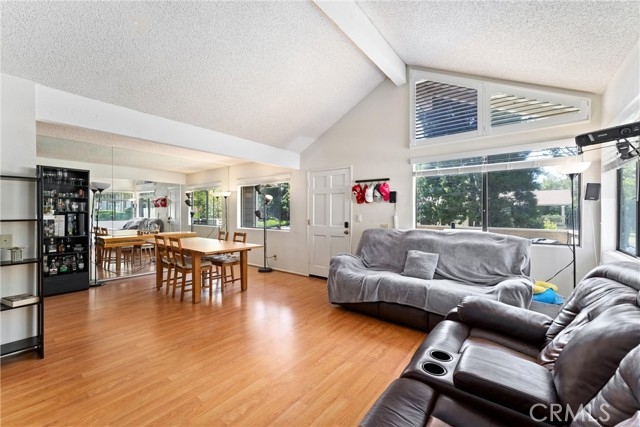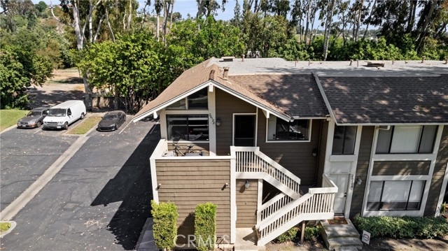 LOCATION, LOCATION, LOCATION. Discover an amazing opportunity to own this charming 2 bed, 1 bath upper-level condo, accessible via exterior stairs. This private end unit offers the perfect blend of comfort, convenience, and style. Enjoy cooking in a spacious kitchen equipped with Corian countertops, a stove, and a microwave and plenty of cabinet space. Vaulted ceilings, and elegant laminate flooring in the accessible dining and living room area Convenience at its best with a large laundry room featuring ample cabinets for storage. Experience peace and privacy with no one living above or below your unit. Relax, BBQ, or simply enjoy the outdoors on your private entry deck. Your own one-car garage is just steps away, making parking a breeze. Plenty of guest parking. Take a dip in the pool or unwind in the spa and enjoy a game of tennis with friends on the two available courts – no more waiting to book a match. Offering easy access to freeways, the Irvine Spectrum, toll roads, and more, this condo is perfectly situated for both convenience and leisure. Don’t miss out on this lovely home. Come and make it yours today!