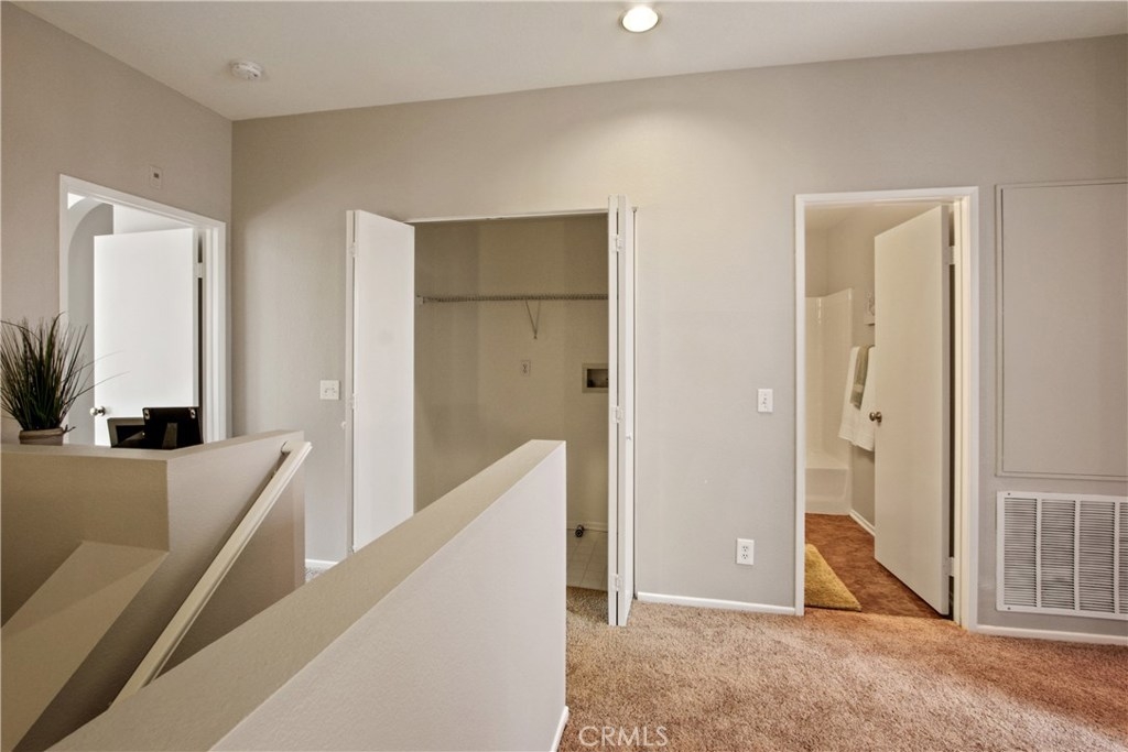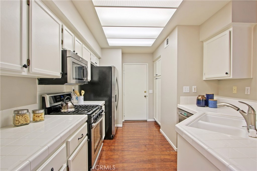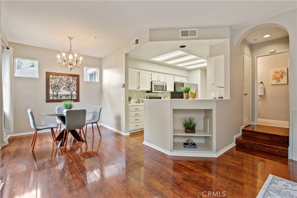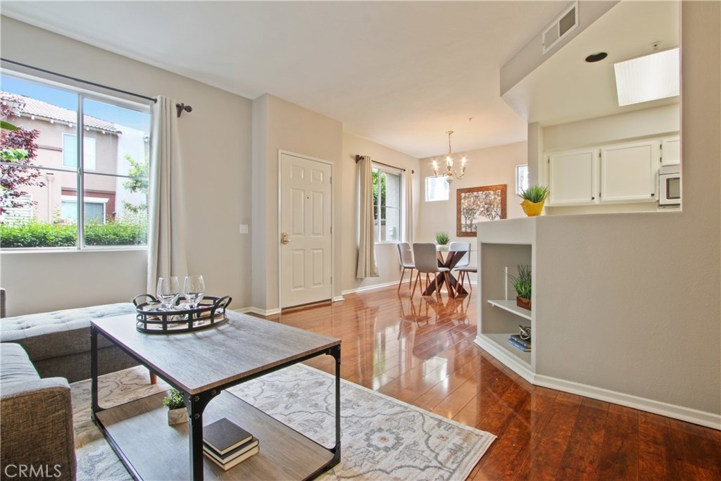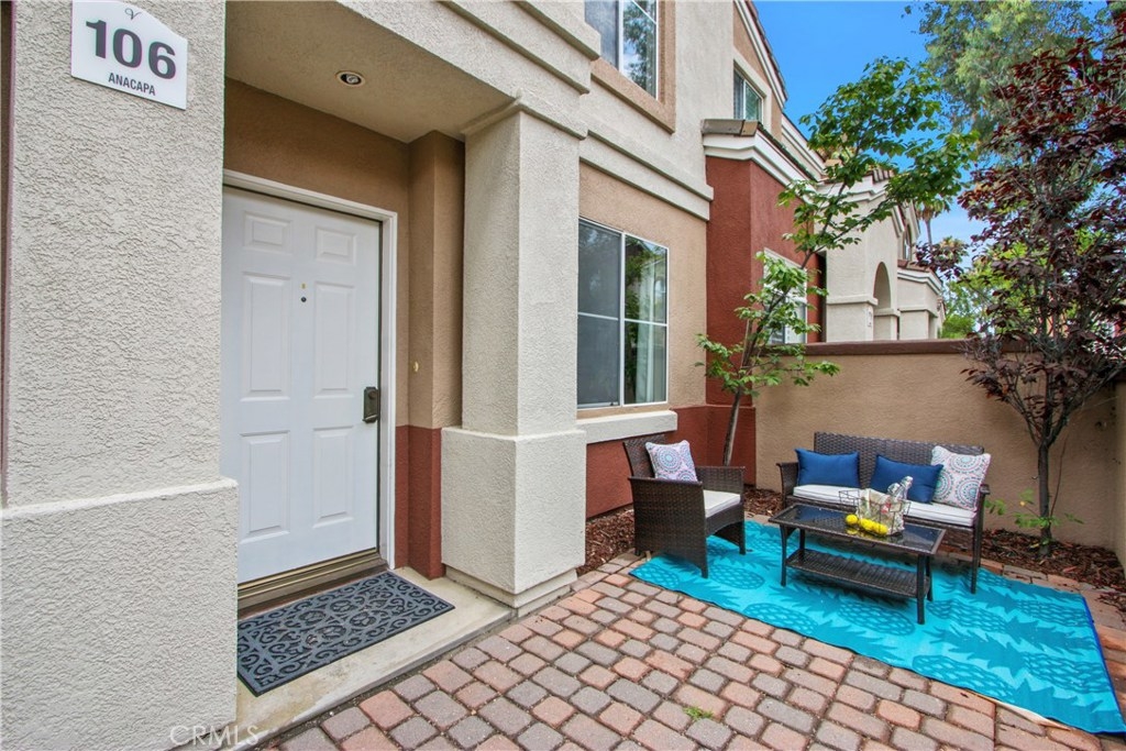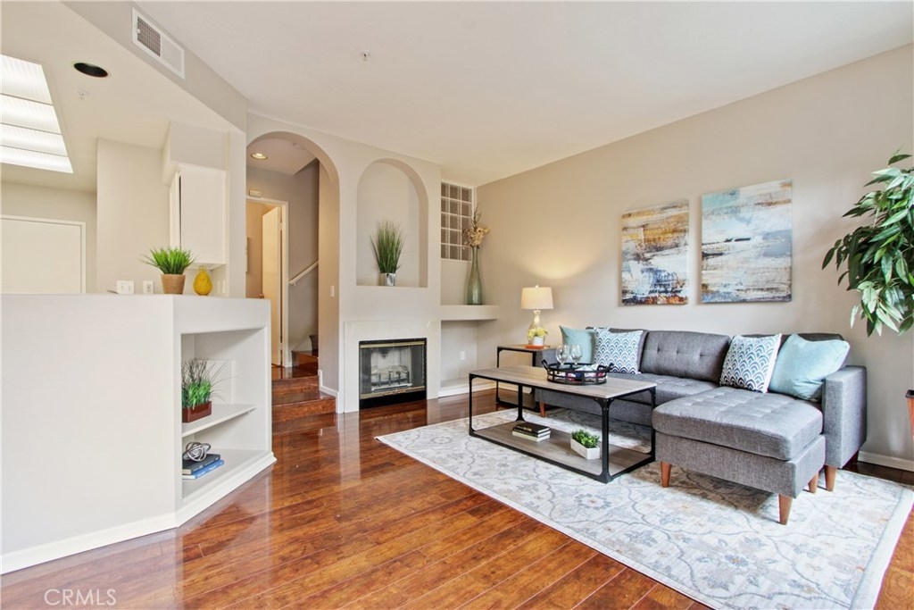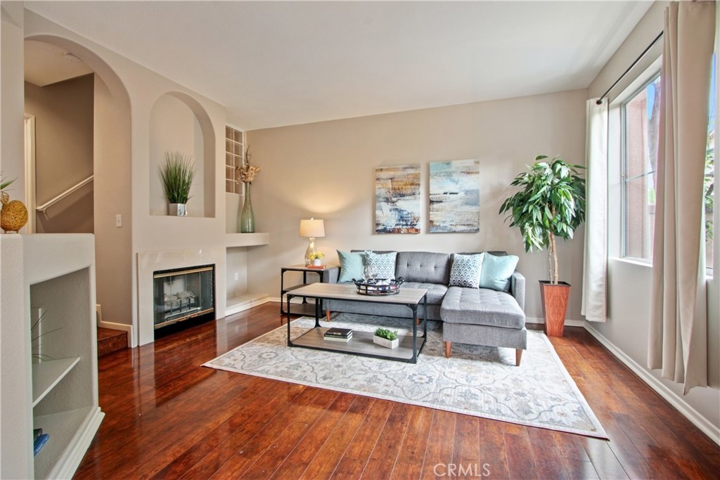 Light, bright, warm and inviting...Stylish 2-Bedroom, 2.5-Bath townhome plus loft and balcony, with no neighbor above or below. Spacious living room with media niche and gas fireplace overlooking dining area. Custom appointments include gorgeous hardwood floors, upgraded light fixtures, and window coverings, new carpet, fresh paint. Open kitchen with tile counter tops, and newer stainless steel appliances. Convenient upstairs laundry. Master Suite with high ceilings, dual sinks, large oval tub and balcony. Large front brick patio. Two-car, direct access, attached garage. Adjacent to the community pool and spa. Close to the 241 Toll Road and just minutes from the Irvine Spectrum. Fantastic schools. Near local shopping, restaurants, theaters, parks and Whiting Ranch Wilderness Park for biking and hiking.