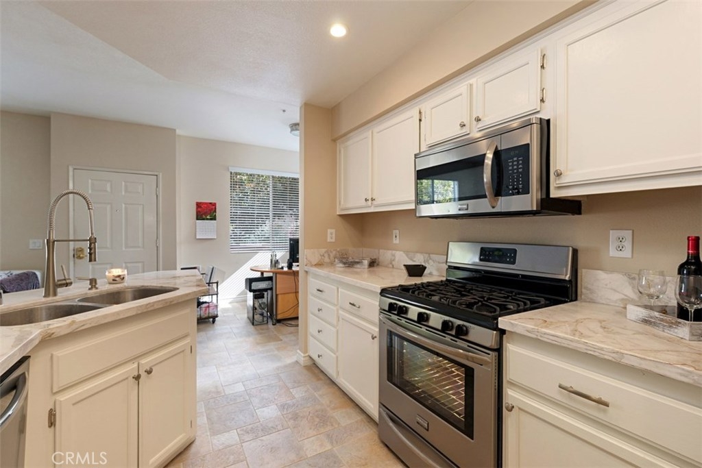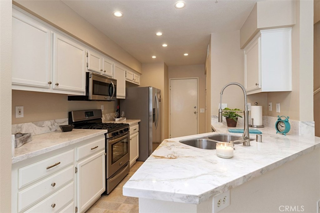 This home with no one above or below has it all! Let’s start with privacy as the unit sits facing perimeter landscaping and no other units. The gated patio is spacious with stone accents. As you enter you will find a large bright living room with fireplace and adjacent dining area. There is also a convenient first floor half bath. The spectacular kitchen was updated with marble countertops, stainless steel appliances and Giagni Fresco© faucet. You won’t believe the exquisite tile flooring on the main level and beautiful new wood flooring on the 2nd floor. Speaking of the upstairs, there are 2 bedrooms, two baths, a laundry area with linen cabinets and a loft. The master has vaulted ceilings, a French door walk-out balcony facing a lush greenbelt and a master bath with double sinks and large walk-in closet. Other features include: upgraded baseboards, raised interior panel doors, brushed nickel hardware, and a two-car attached garage with direct access to the kitchen. The association has a wonderful pool/spa and a separate tot-lot. Foothill Ranch living has everything at your fingertips-shopping, restaurants, parks and theatre. Close access to the 241 tollway and Whiting Ranch hiking/biking trails. Come take a look!