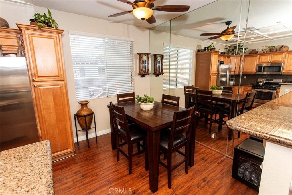 Premium location next to green-belt and highly upgraded 2 bed, 2 bath with direct-access 1 car garage in the Vineyards Townhomes. Private and tranquil! What a remarkable opportunity for first time buyers or the savvy investor looking for a great rental unit. Open floor plan with living room, dining room, and kitchen configured to maximize square footage and create a spacious airy feel. Retire to the private outdoor terrace through sliding glass doors at the living room. Master bedroom is en suite and the 2nd bathroom is conveniently located near the 2nd bedroom and the living room. Entry and direct access garage located on the main floor with most of the living space on 2nd floor. Shops, restaurants, and movie theaters are all within easy walking distance. You will also enjoy close proximity to acclaimed Foothill Ranch Elementary, hiking/biking (Whiting Ranch Wilderness Park), and access to the 241 toll road. A beautiful residence with a floor plan that is both aesthetically pleasing and yet highly functional. Great price point, highly updated, excellent potential rental value, acclaimed schools, and fantastic community amenities. What more could you ask for?