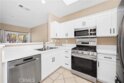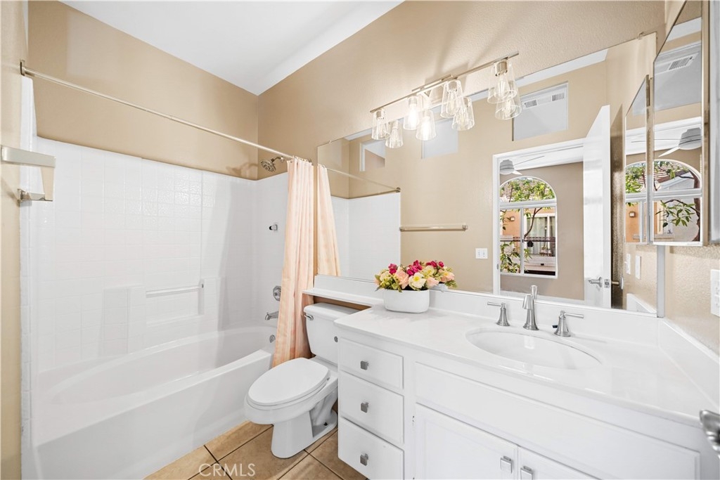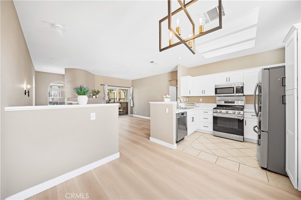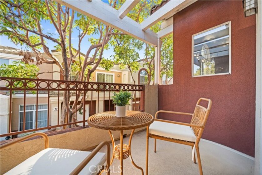 This beautifully maintained upper-level unit offers exceptional privacy with no neighbors above or below and is situated in the highly desirable Vineyard community. Thoughtfully designed for comfort and functionality, the open-concept layout is filled with natural light and enhanced by brand-new luxury vinyl flooring, fresh interior paint, neutral designer tones, custom lighting, and a newer water heater. The spacious living room features a cozy fireplace and opens to a private terrace—perfect for indoor/outdoor living, whether you’re relaxing with a book or entertaining guests. The bright and inviting kitchen has been tastefully updated with new shaker cabinets, quartz countertops, upgraded stainless steel appliances, and rich cabinetry detailing. With generous counter space and seamless flow into the dining and living areas, it is ideal for gatherings and everyday living. The primary suite offers a peaceful retreat, complete with a bathroom featuring modern fixtures, custom lighting, and a tub. A secondary bedroom and full guest bath provide comfort and flexibility for guests, family, or a home office. Additional highlights include a one-car attached garage with direct access, an assigned parking space, and community amenities such as a pool and spa. Enjoy convenient access to shopping, dining, and entertainment at Foothill Ranch Towne Center, as well as close proximity to the Irvine Spectrum, Great Park, and scenic outdoor adventures in Whiting Ranch and Limestone Canyon. With low HOA dues and no Mello-Roos, this home is truly a must-see.
