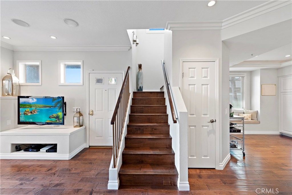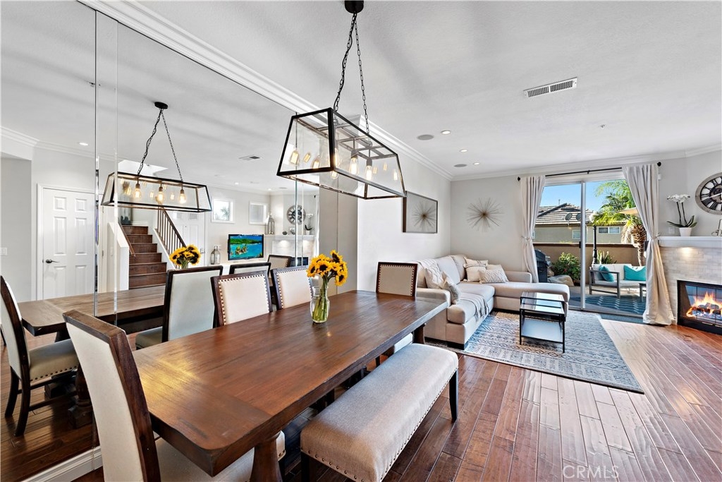 Enjoy the comforts of home in this delightfully quiet corner lot condo in the highly sought after Vineyard Community of Foothill Ranch that symbolizes South Orange County living unparalleled. This bright condo embodies the largest floor plan in the community. Boasting Custom Mohawk Hardwood Floors, Open Living Space accented with crown molding, built-in LED lighting, surround sound speakers, gas fireplace, and dual pane windows throughout. The Gourmet Kitchen boasts a large pantry with new shelving, quartz countertops, updated sink, faucet, and backsplash. The open living space leads to a large outdoor patio perfect for entertaining guests with a sunset ambiance. The attached 2 car garage features Epoxy floors, plenty of storage and workspace. Large upstairs Master Suite transcends elegance with a crafted barn door, walk-in closet with custom shelving, upgraded master bathroom with dual vanity and oversized relaxation bathtub. The guest bedrooms display privacy and plenty of natural light with views of the greenbelt. Vineyard's residents enjoy resort-style amenities including parks, pool/spa, & playground. Enjoy hiking/ biking in nearby Whiting Ranch Wilderness Park. Conveniently located close to award-winning schools, shopping, dining, and Movie Theater. Easy toll road & freeways access makes it a great location.