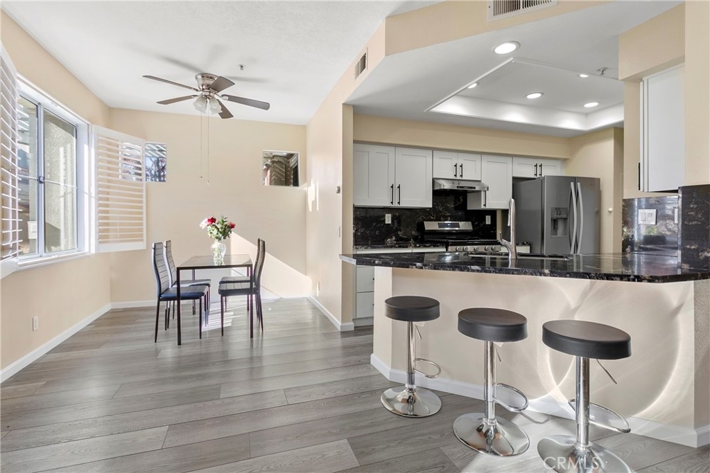 This delightful townhome is nestled in the charming Vineyards community of Foothill Ranch. The inviting gated patio sets the stage for outdoor gatherings and is a perfect place to unwind in a picturesque setting. The floor plan is open and bright, complemented by fresh paint and luxury vinyl plank flooring. Cooking is a pleasure in the modern kitchen, with stainless steel appliances, new white cabinets, granite counters, and an oversized breakfast bar. The contemporary kitchen flows seamlessly into the living room with a cozy fireplace and dining area. The home has direct access to a two-car garage with plenty of storage. Retreat to the 2nd-floor primary suite with a modern bath with a soaking tub and shower combination, dual sinks, a large walk-in closet, and a private terrace, a peaceful spot for morning coffee. There is an additional bedroom, full bath, and stylish barn doors to conceal the laundry. The spacious loft is an ideal spot for a home office with a 2nd private terrace. Enjoy community amenities, including a pool, spa, and playground, while conveniently located near shopping, restaurants, movie theaters, schools, parks, 241 Toll Road, and Whiting Ranch Wilderness Park with hiking and biking trails.
