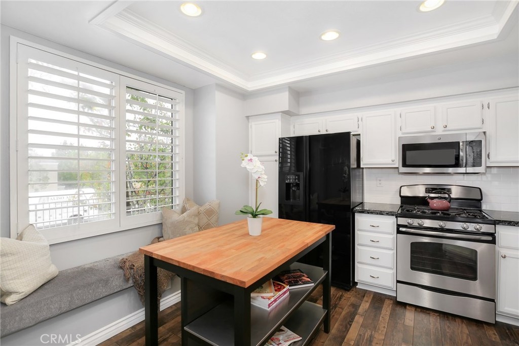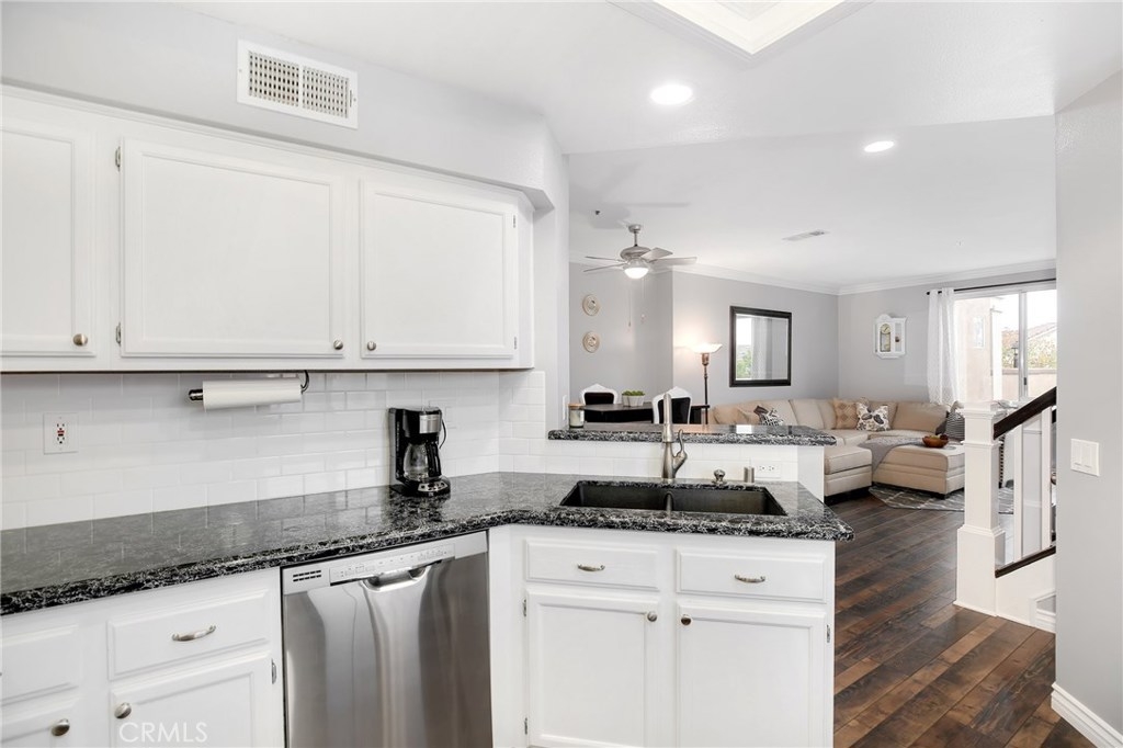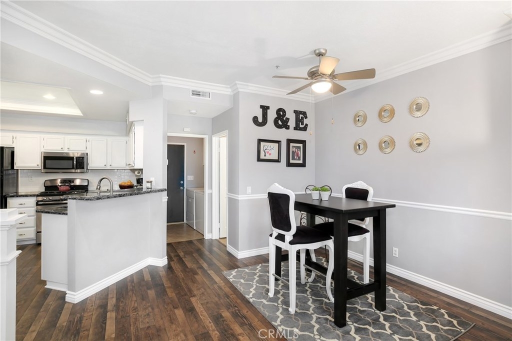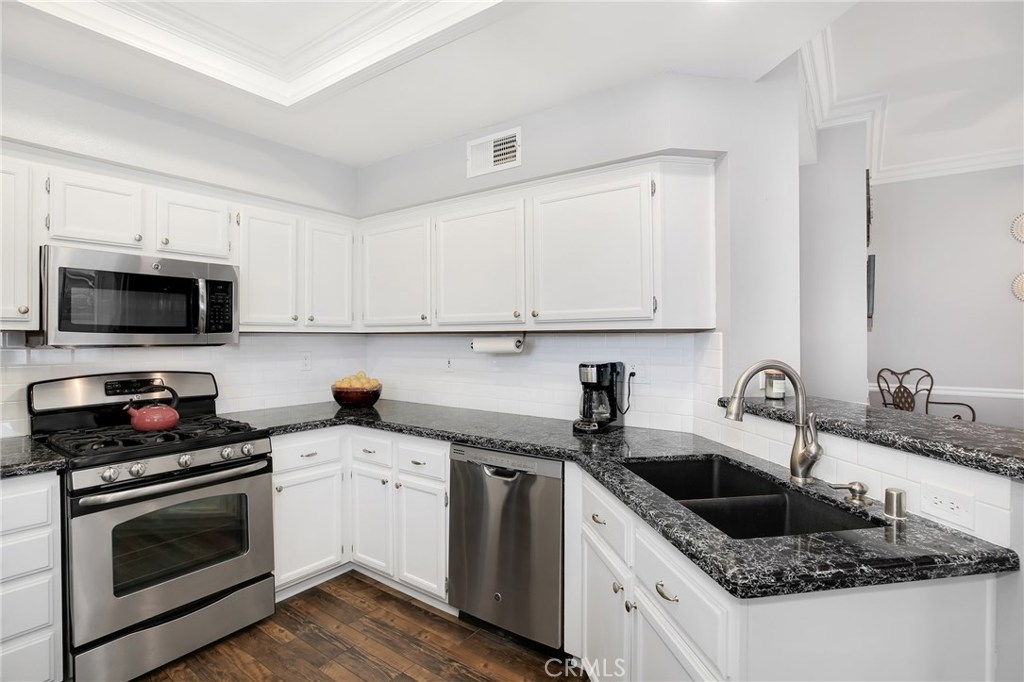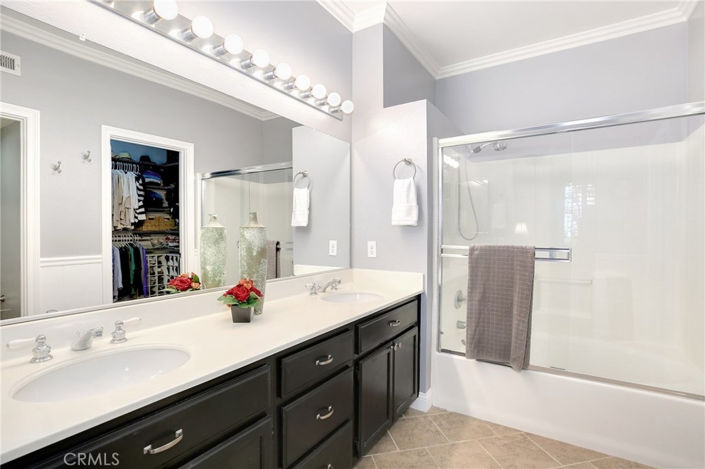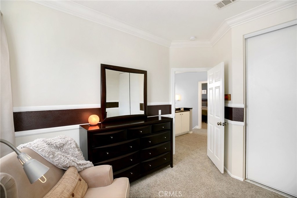 No detail has been spared in this magnificent, private corner lot in the sought after Vineyards tract of Foothill Ranch. Plantation shutters, crown molding, light-catching dual pane windows, newer carpet and rich wood laminate floors add to the elegance of the highly livable floor plan. The sumptuous kitchen is well appointed w/ exquisite quartz counters, subway tile backsplash, stainless steel appliances, breakfast nook and gorgeous views. The sizable living room flows seamlessly from the kitchen and features a cozy fireplace, sliding glass door to patio and a roomy dining space. Up the staircase, the spacious master suite welcomes w/ new plush carpet, vaulted ceilings, plantation shutters, wainscoting and modern paint colors. The spa-like master bathroom features a sizable walk-in closet w/ built-in organizers, dual sinks and soaking tub. The secondary bedrooms have plush carpet, crown molding, plantation shutters, spacious closets and share the full hall bathroom. Enjoy relaxing in the private backyard w/ spacious grass area, wrap around patio and stunning sunsets. Additional features include newer high efficiency A/C, indoor laundry room and convenient 2 car attached garage w/ epoxy flooring and plenty of room for storage. This resort style living also includes fantastic private community pool/spa and tot lot play area. Close proximity to acclaimed Foothill Ranch Elementary, hiking/biking (Whiting Ranch Wilderness Park) and access to 241 toll road. Won’t last long!