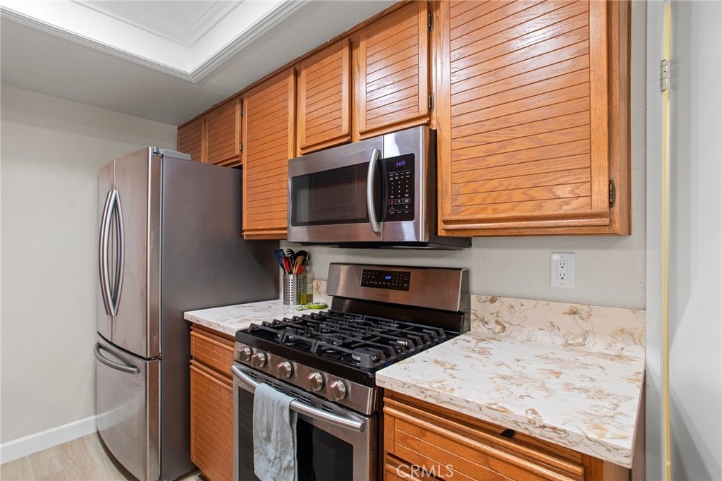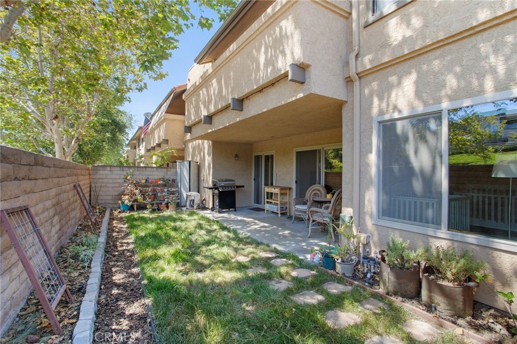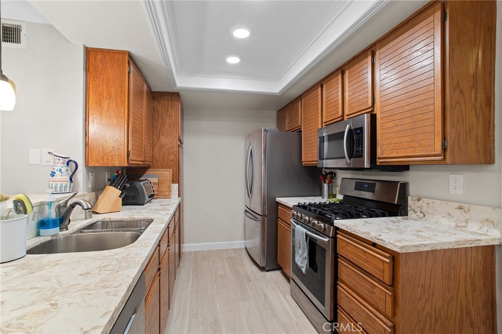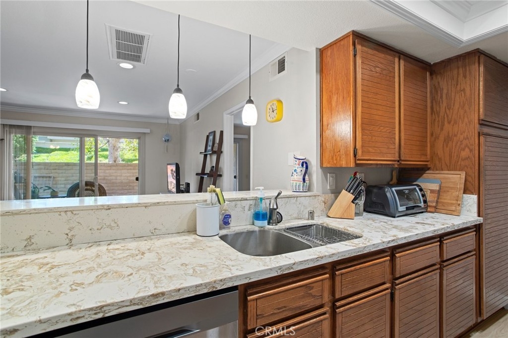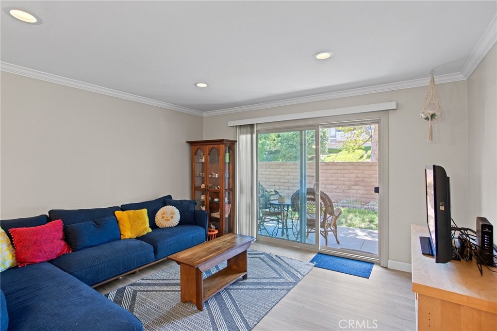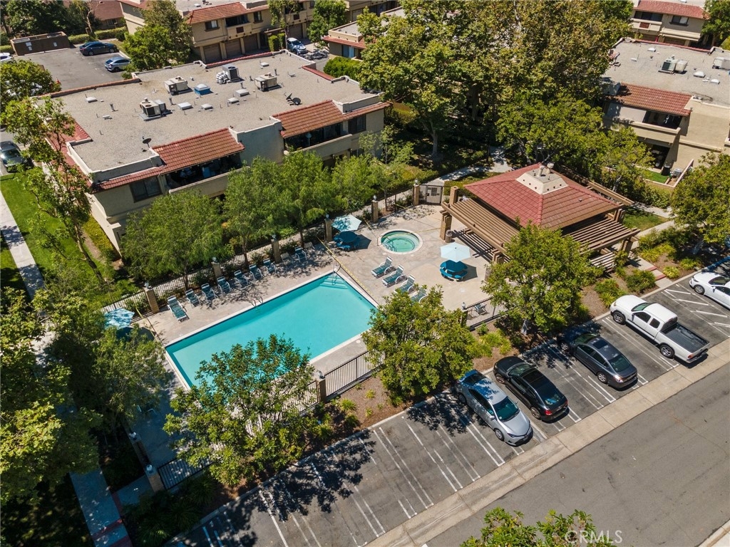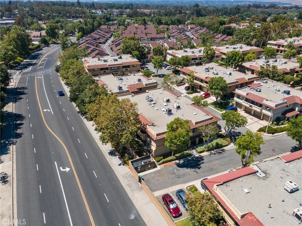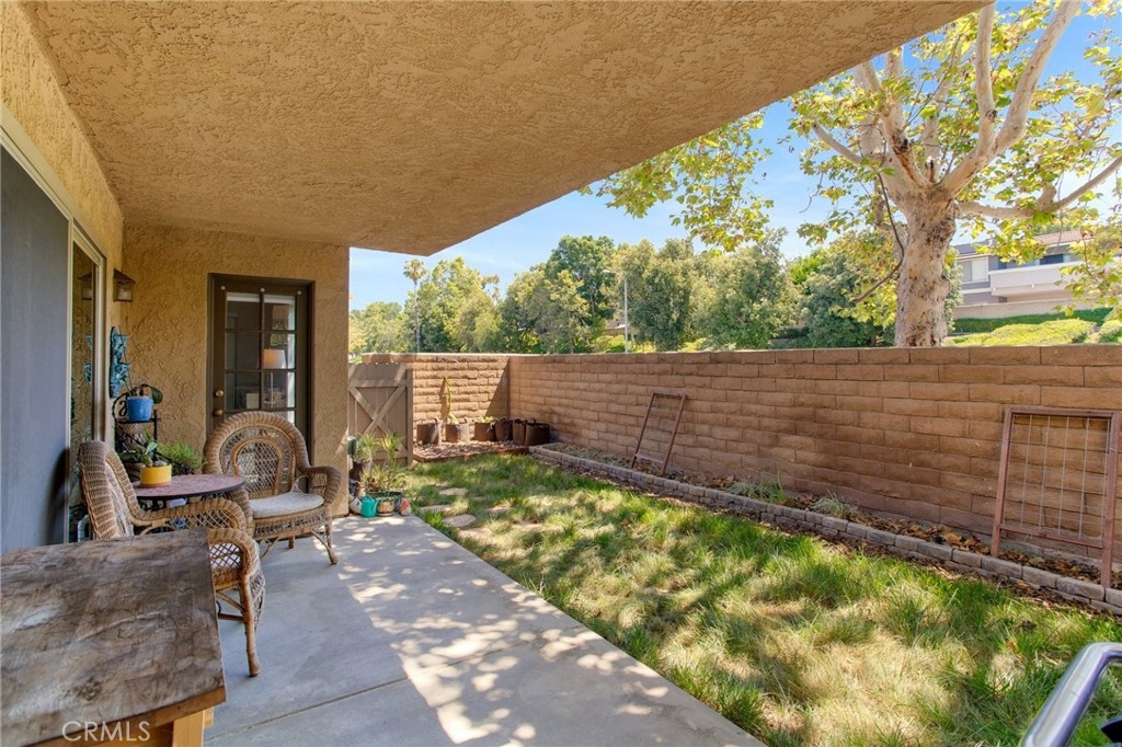 Welcome to beautiful Tierra Vista, one of the most desirable hilltop communities within Lake Forest. This lower level, end unit, with attached direct access single car garage, is privately positioned on the northeast side of the community, minutes away from the lush greenbelts of the neighboring Peachwood Park. A level cement walkway or short stairwell exterior access brings you to the beautiful arched front porch area with room to accentuate using your own personal décor and taste. Enter through the front door and the tasteful designer paint tones, crown moulding, recessed lighting, new LVP flooring, and open kitchen concept give the home a larger than life feel. An upgraded kitchen with rich wood cabinetry and stainless steel appliances are complimented by gorgeous marbled granite countertops and tear drop accent lighting above the kitchen bar seating completing its tasteful design. The dining area, living area, and additional bar seating easily accommodates intimate gatherings and the expansive sliding glass door allows you to bring the private outdoor patio setting inside on those beautiful days and nights Orange County is known for. Guest parking is also just a short walk away from this unit which is extremely nice. The bedrooms are located on opposite sides of the main living area, close enough to each other yet far enough way for privacy. The master bedroom does have its own bath area and walk-in closet. Each bedroom has direct access to the beautiful back courtyard setting with large cement patio area, new planter bed design, exterior shed, and surrounded by block wall for the extra sense of privacy. This back courtyard environment has a lanai feel to it created by the positioning of the upstairs overhead balcony. A separate laundry room area separates the kitchen from the direct access door to the single car garage making it very nice to transport groceries to and from the car or avoiding challenging weather conditions. This home is located within close proximity to major retail and business districts; close to Irvine Spectrum, Lake Forest Sports and Recreation Center, and JFK Airport; and the major arteries of I5, 405, and 241 easily accessible for commuting purposes. What a wonderful opportunity to own this beautiful lower end unit!