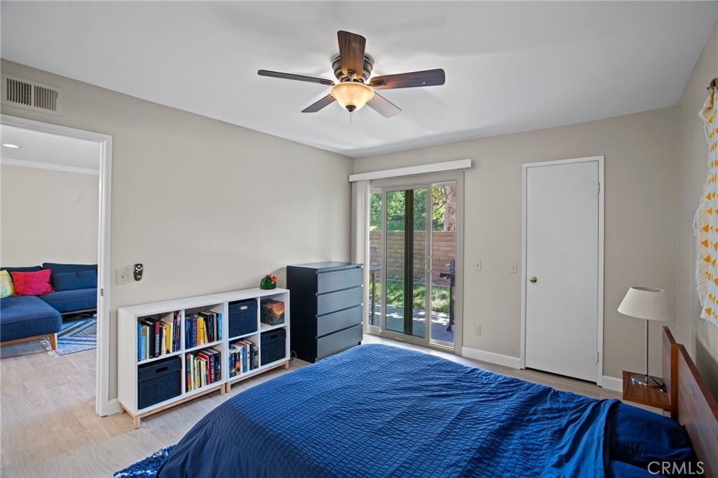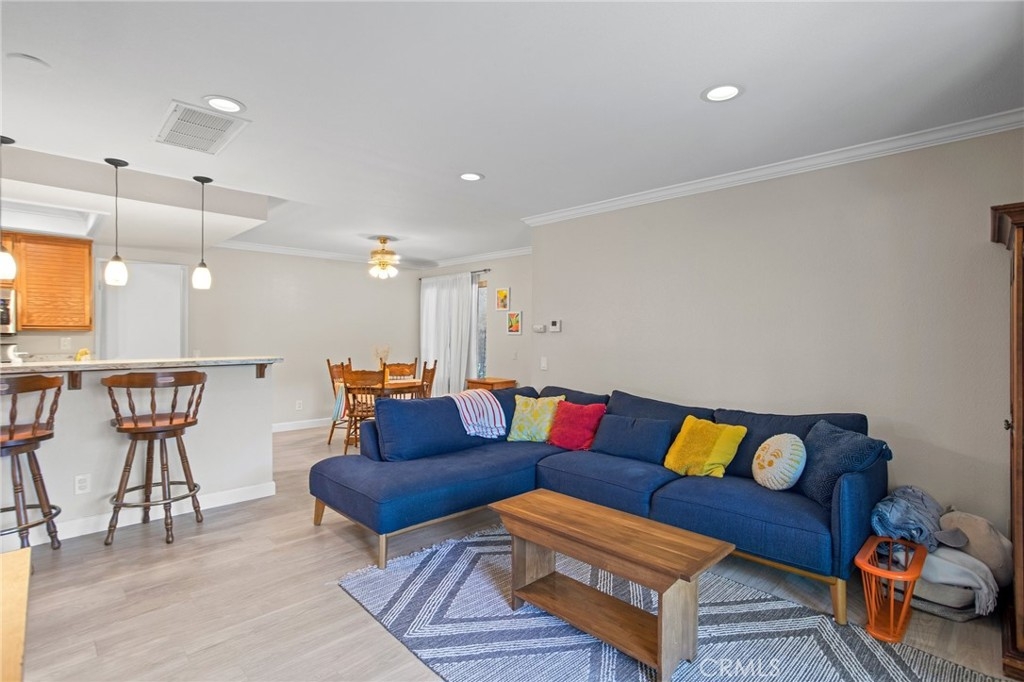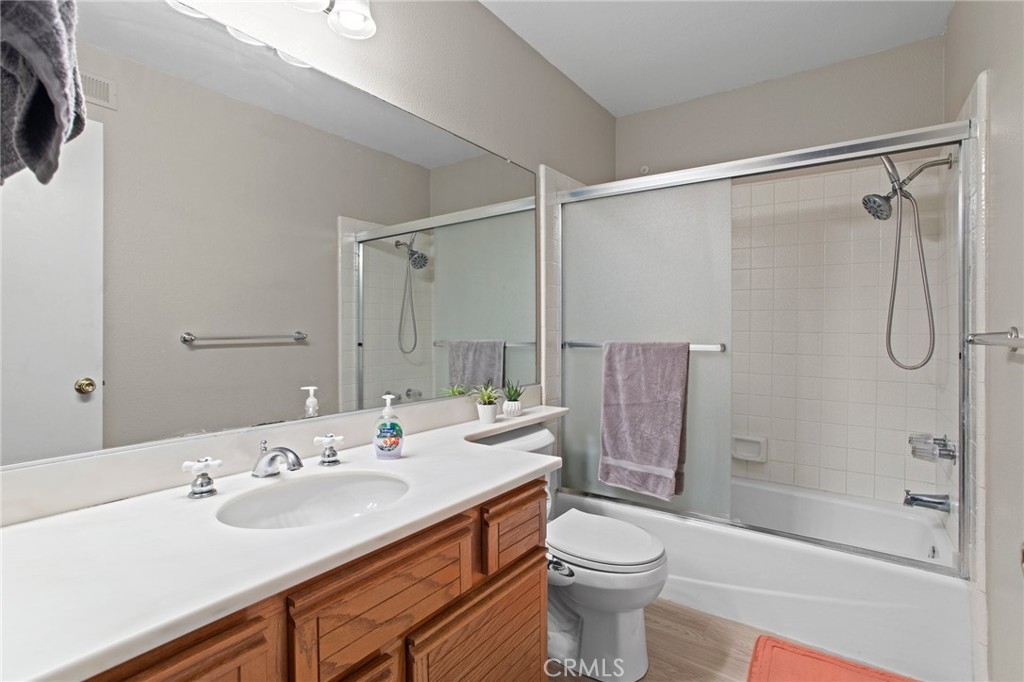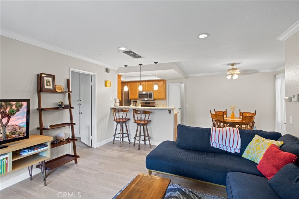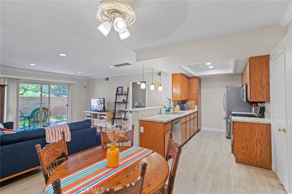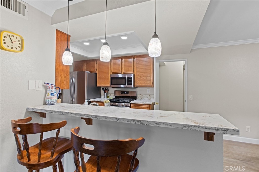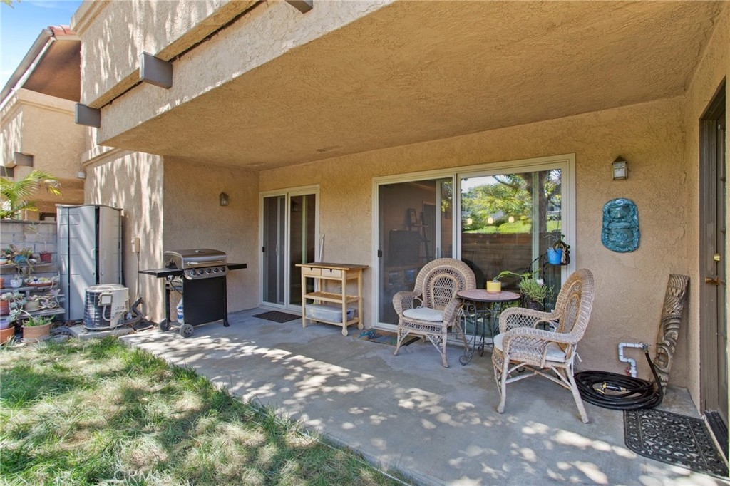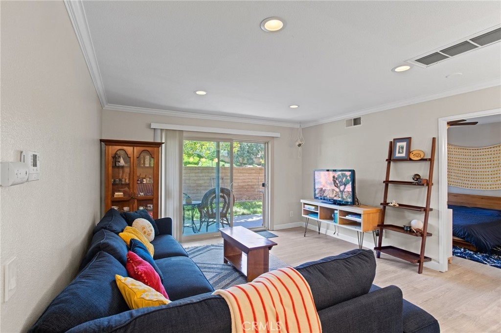 Welcome to beautiful Tierra Vista, one of the most desirable hilltop communities within Lake Forest. This lower level, end unit, with attached direct access single car garage, is privately positioned on the northeast side of the community, minutes away from the lush greenbelts of the neighboring Peachwood Park. A level cement walkway or short stairwell exterior access brings you to the beautiful arched front porch area with room to accentuate using your own personal décor and taste. Enter through the front door and the tasteful designer paint tones, crown moulding, recessed lighting, new LVP flooring, and open kitchen concept give the home a larger than life feel. An upgraded kitchen with rich wood cabinetry and stainless steel appliances are complimented by gorgeous marbled granite countertops and tear drop accent lighting above the kitchen bar seating completing its tasteful design. The dining area, living area, and additional bar seating easily accommodates intimate gatherings and the expansive sliding glass door allows you to bring the private outdoor patio setting inside on those beautiful days and nights Orange County is known for. Guest parking is also just a short walk away from this unit which is extremely nice. The bedrooms are located on opposite sides of the main living area, close enough to each other yet far enough way for privacy. The master bedroom does have its own bath area and walk-in closet. Each bedroom has direct access to the beautiful back courtyard setting with large cement patio area, new planter bed design, exterior shed, and surrounded by block wall for the extra sense of privacy. This back courtyard environment has a lanai feel to it created by the positioning of the upstairs overhead balcony. A separate laundry room area separates the kitchen from the direct access door to the single car garage making it very nice to transport groceries to and from the car or avoiding challenging weather conditions. This home is located within close proximity to major retail and business districts; close to Irvine Spectrum, Lake Forest Sports and Recreation Center, and JFK Airport; and the major arteries of I5, 405, and 241 easily accessible for commuting purposes. What a wonderful opportunity to own this beautiful lower end unit!
