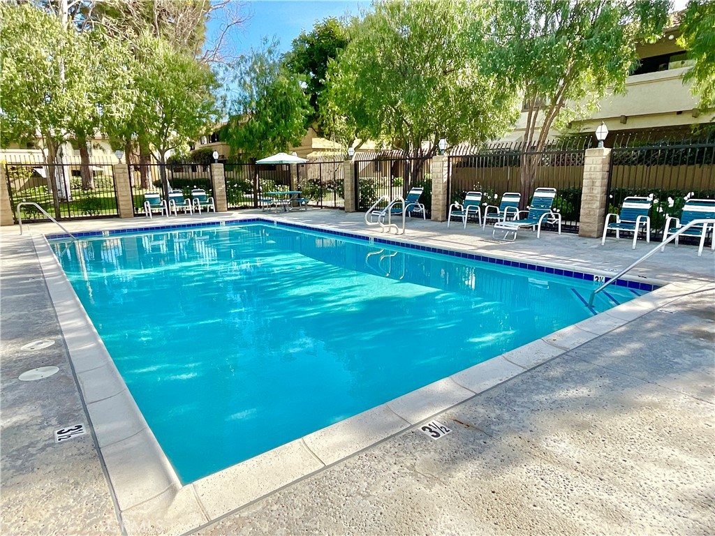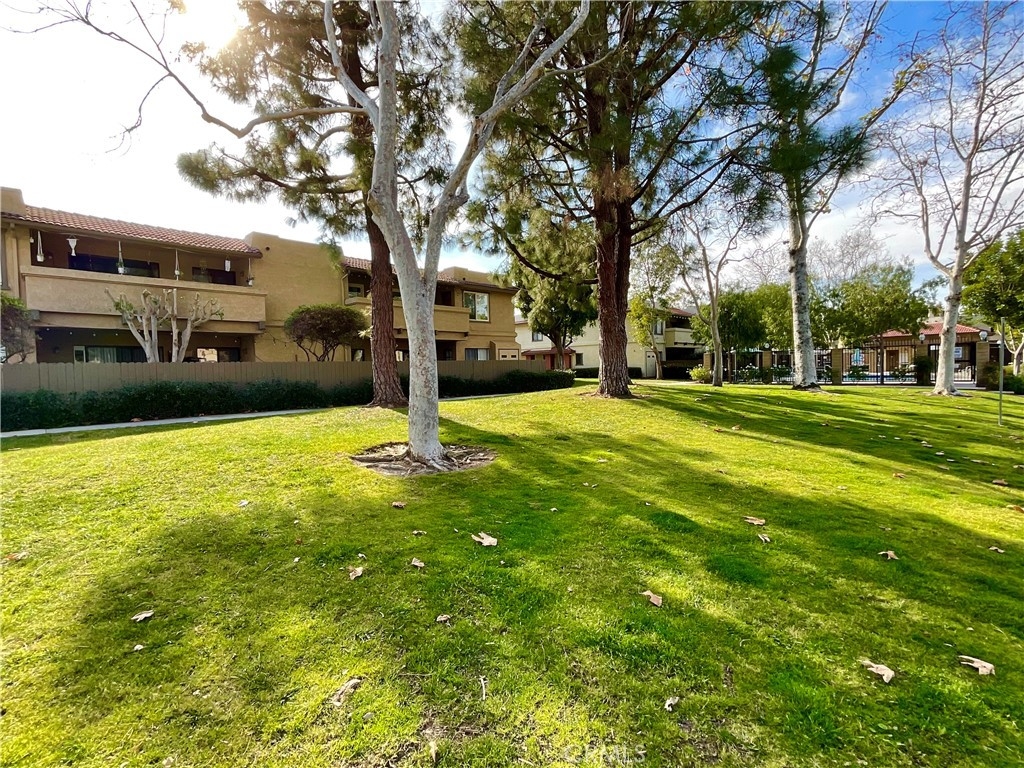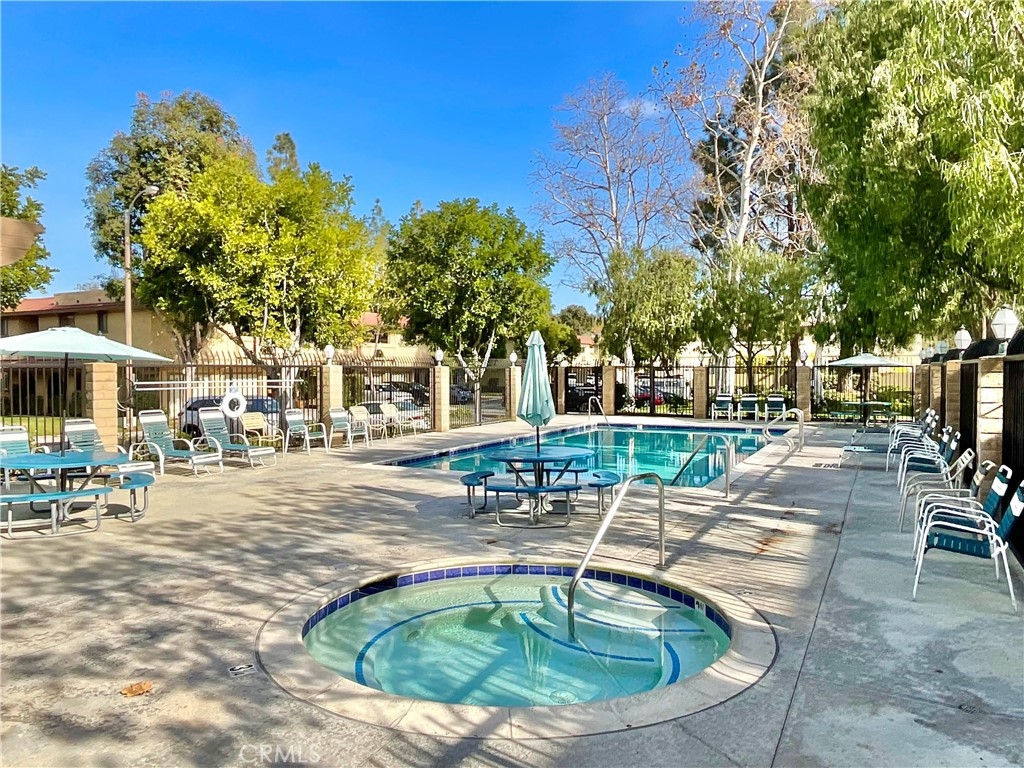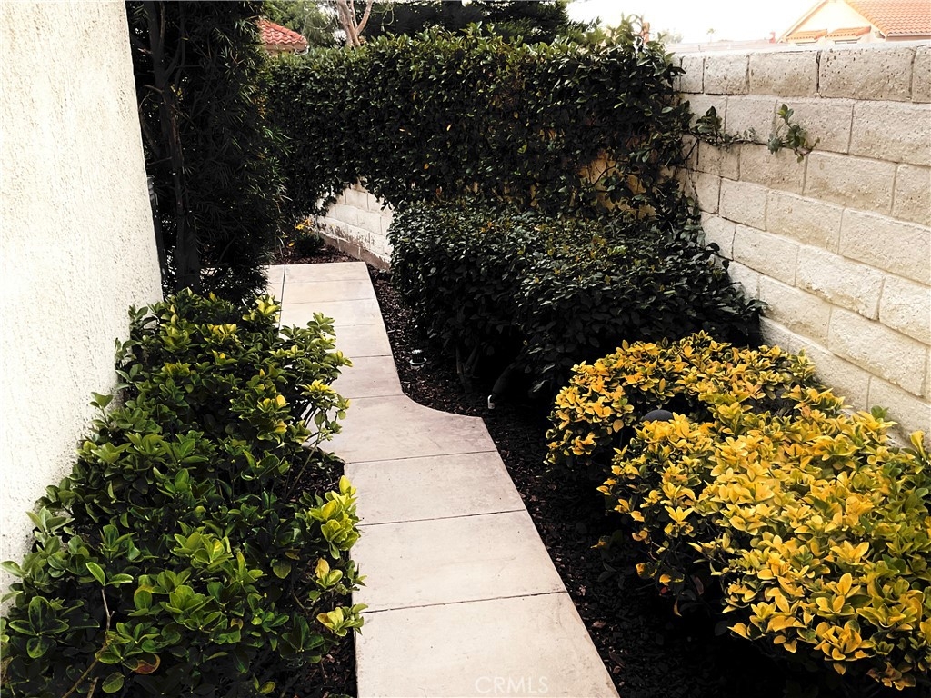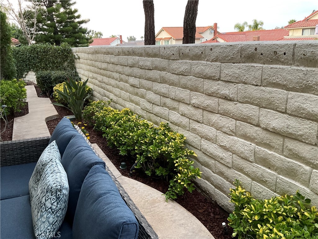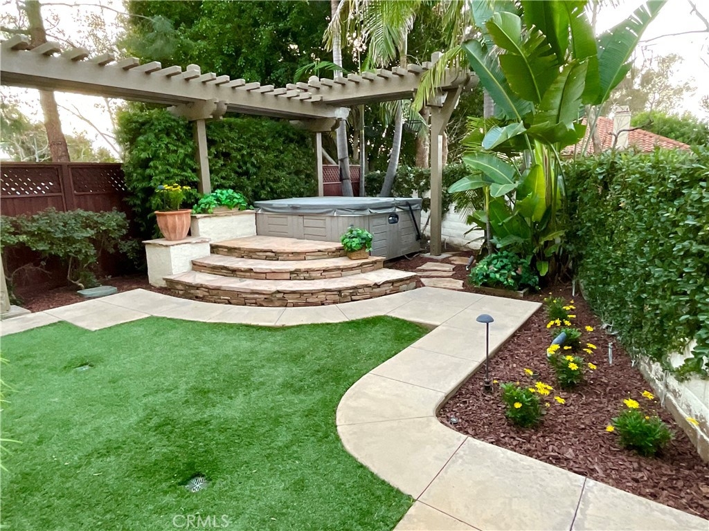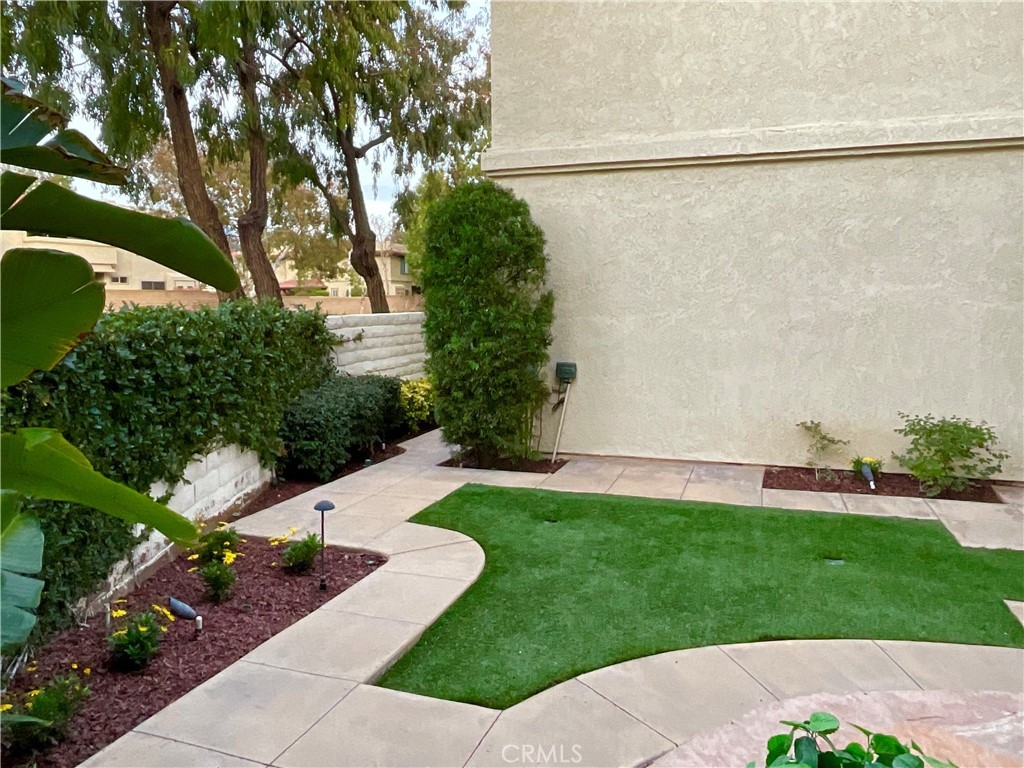 Rare single story end unit on greenbelt! This unit has it’s own, private, fully enclosed yard featuring a relaxing above ground spa. The beautiful landscaping includes artificial turf, palm trees, plants & flowers, plus custom stone hardscape. This is a truly unique & private location. There are 2 bedrooms, 2 full baths, spacious living room and dining area. Both bedrooms and living room open out to a private patio area and yard. Kitchen has newer appliances, including a gas range, stainless steel sink, and breakfast bar. Upgrades include newer dual pane windows and sliders, new custom paint throughout, smooth ceilings, laminate and tile flooring, ceiling fans and recessed lights. There is a convenient inside laundry room and an attached single car garage, plus your own private driveway! The patio and spacious private backyard with bubbling spa offer a tranquil and private setting - just like a single family home. Located in Tierra Vista just steps from the community pool. This tract is located close to shopping, toll road, stables, and the Irvine Spectrum.