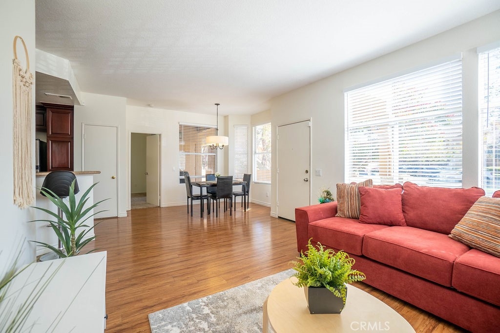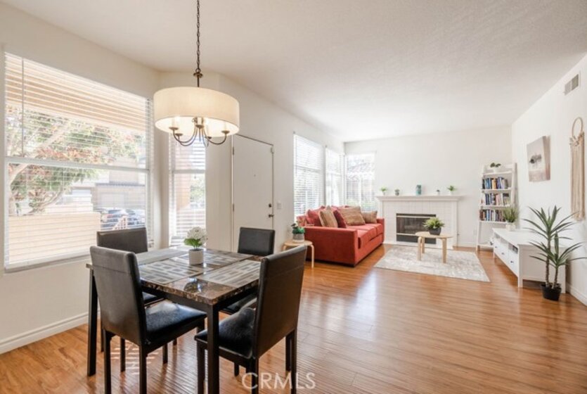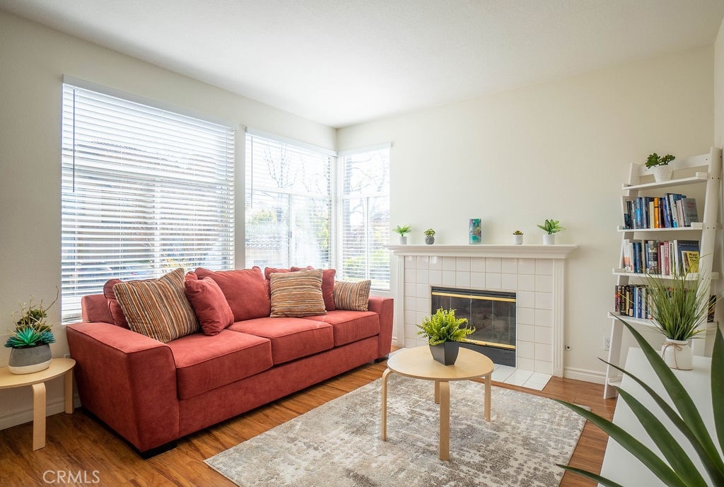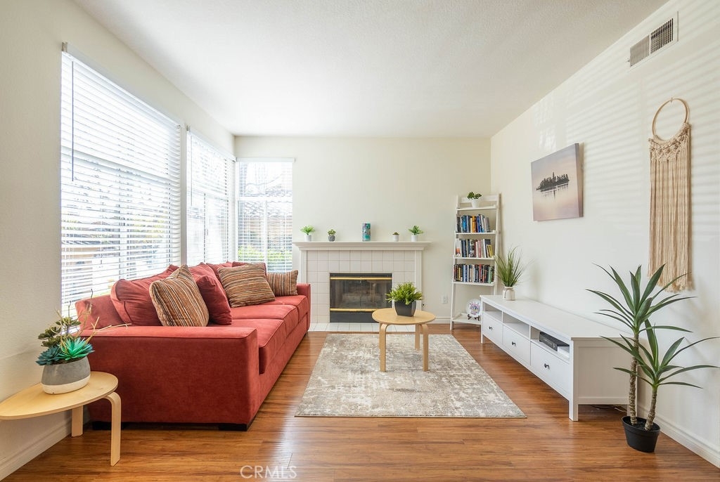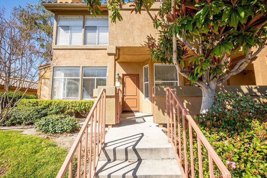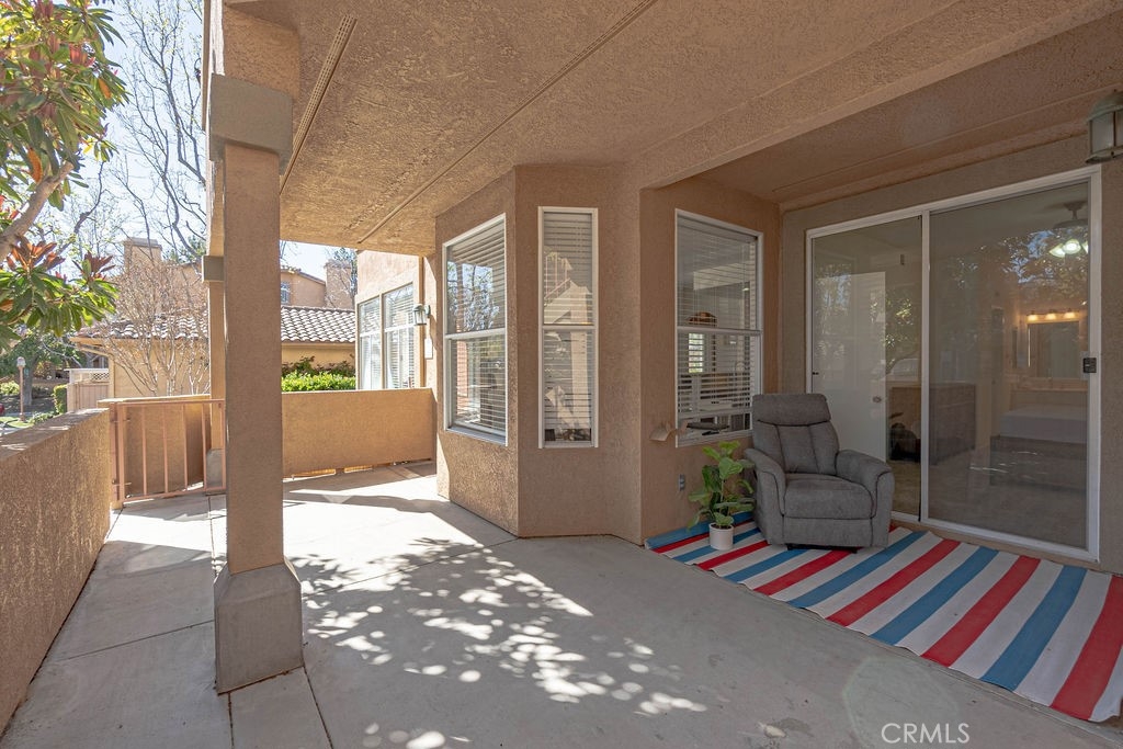 Beautiful ground floor end unit in the gated prestigious Tuscany Community at Foothill Ranch. Very private=in front of empty parking spaces instead of a building. Convenient access to the community pool, mailbox and electronic car charging station. South facing living areas=Sunny and Bright! This condo offers beautiful wood floors throughout, a living room fireplace, open concept living room/dining/kitchen, lots of natural light, and vaulted ceilings. Rfrigerator, washer/dryer (located in separate space on the outdoor deck, just outside of master bedroom slider) included. Central air and heating. Both bedrooms are very generous in size. The master bedroom opens up to the master bath with dual sinks + large covered shaded beautiful patio. The property is located near the main gate entrance with plenty of parking nearby. Home comes with a carport parking space with storage cabinet a few steps away from the unit. This community is fully equipped with luxurious amenities including two resort-style pools, putting green area, tennis court, large aerobic room and a work out gym. There is also a nicely remodeled clubhouse with kitchen, bar area and pool table available for private parties plus newly installed electrical car charging station and car wash area. Close proximity to trail, park, shopping center, restaurants, easy access to freeway & toll road. Live like you are on vacation in this beautiful community!