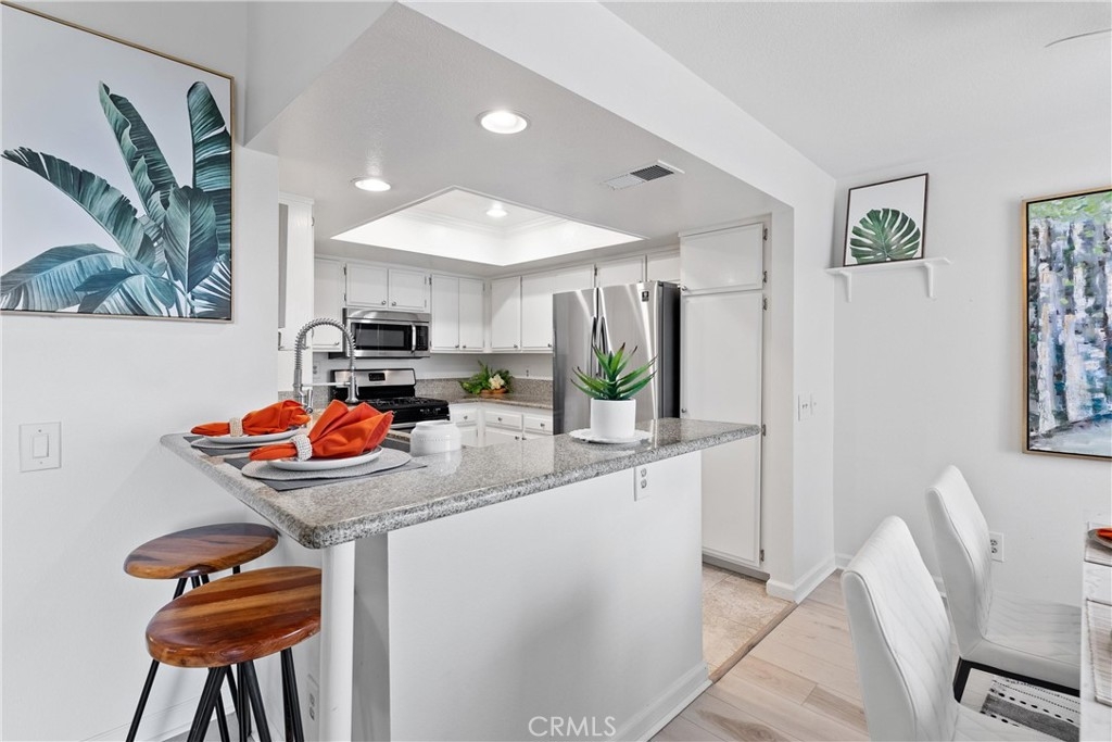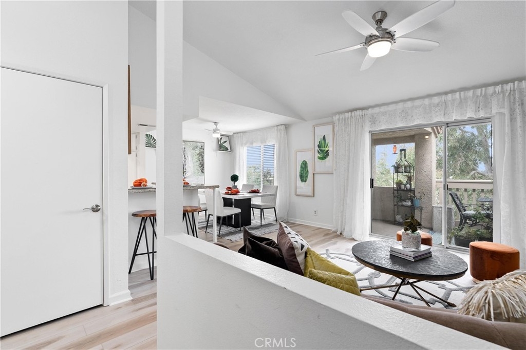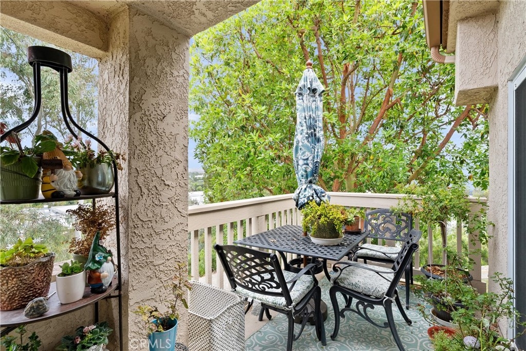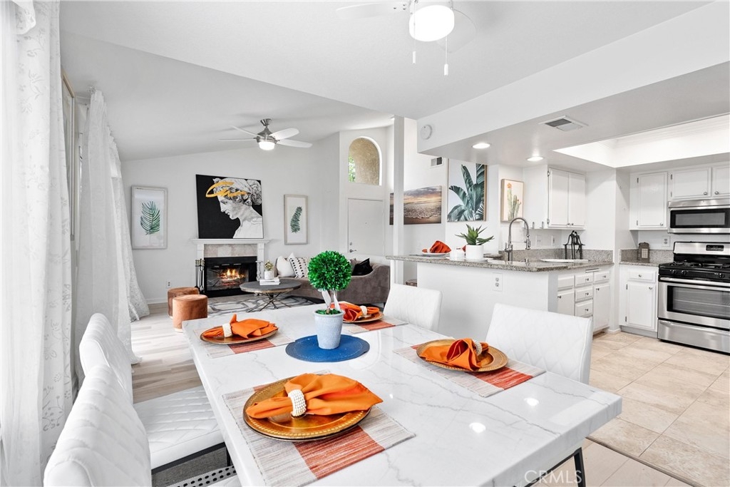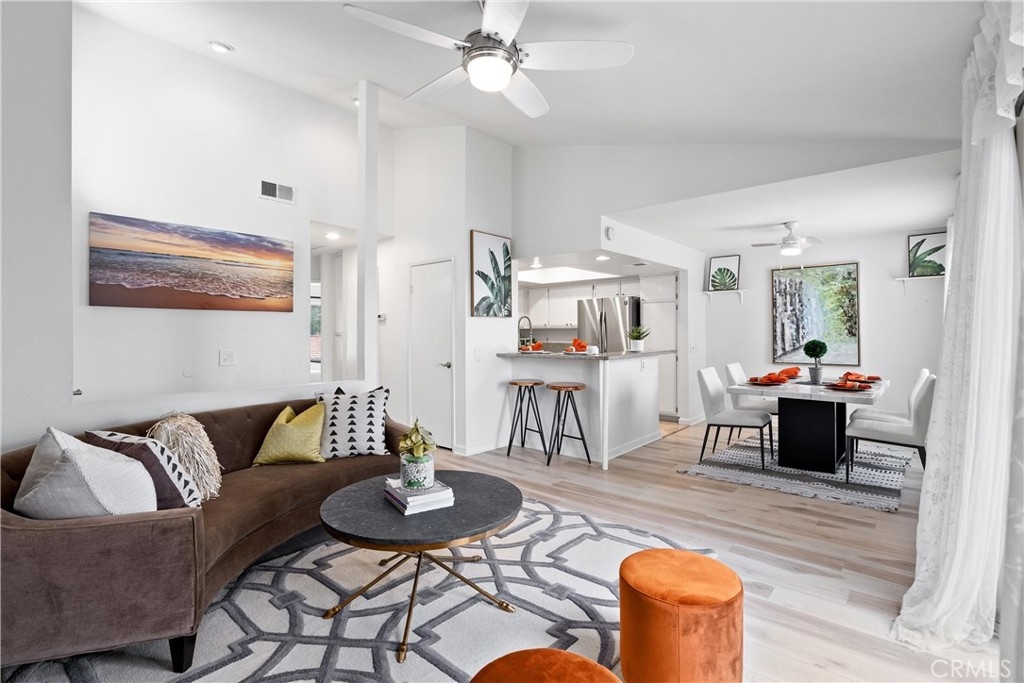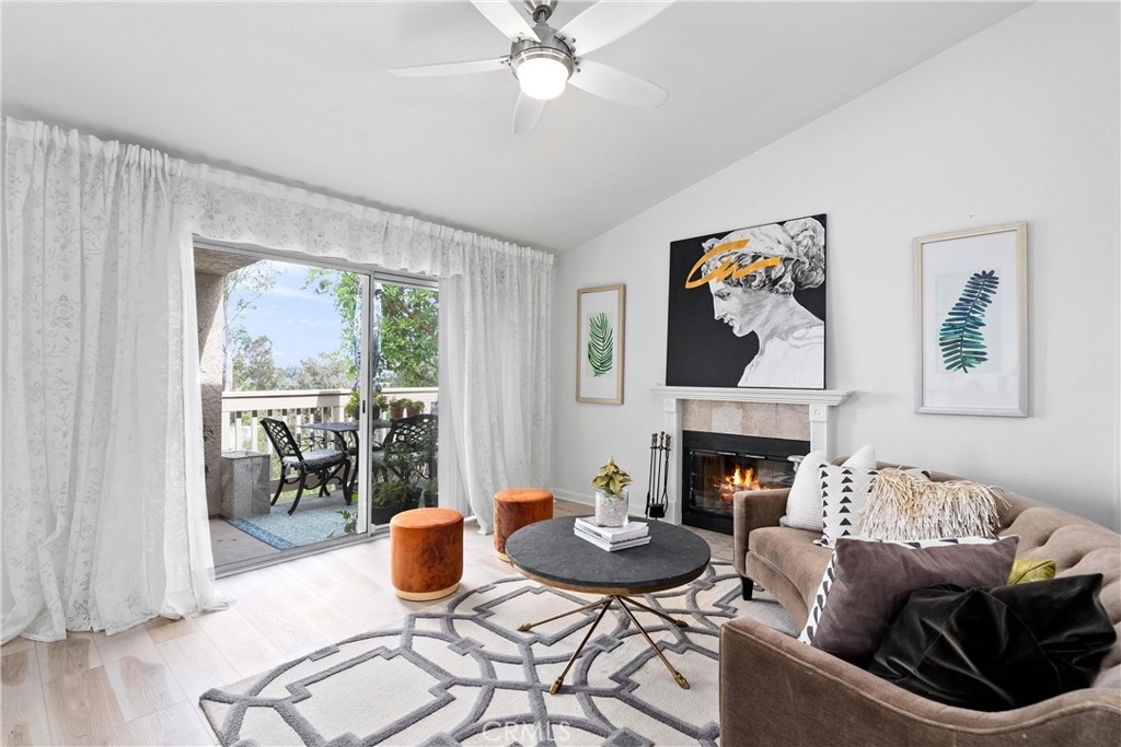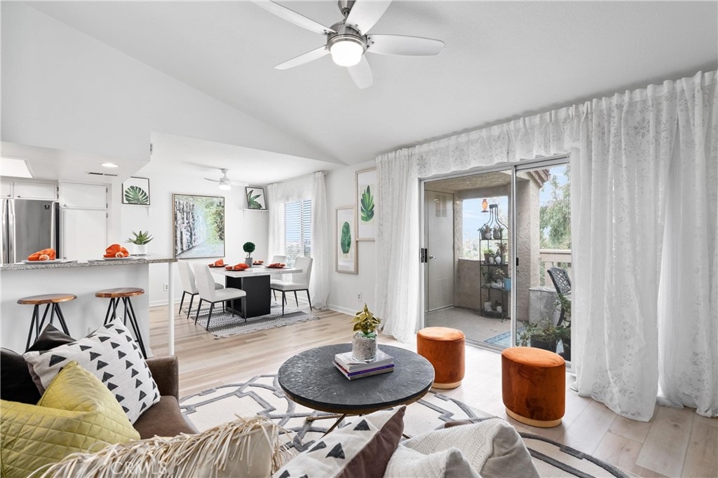 Welcome home to this fresh upper end unit, in the heart of Lake Forest, CA! It offers breathtaking panoramic mountain and city light views and is nestled within a gated community with fantastic amenities. This newly updated 2-bedroom, 2-bathroom home offers a comfortable and elegant living space. Step inside to discover an open floor plan, a spacious living room with fireplace under a vaulted ceiling, and a dining room with a view. Recent updates include whole house paint, flooring, carpet, kitchen cabinet hardware, stainless steel appliances, and a water filtering system for pure convenience. The whole property is repiped this year adding peace of mind. The bathrooms have been tastefully upgraded with new toilets and bidets, adding a touch of luxury to your daily routine. Enjoy the convenience of having a washer and dryer in the unit on the balcony, and air conditioning for those warm California days. The beautiful balcony outside of the living room with amazing views is perfect for relaxing after work or enjoying your morning coffee or weekend brunch. The community features a crisp pool and spa, guest parking, and a barbecue/picnic area perfect for entertaining friends and family. The unit comes with an assigned garage and two additional permitted parking spots. Located close to parks, schools, sports facilities, highways and the Whiting Ranch Wilderness Park, as well as shopping, dining, and entertainment at the Foothill Town Center, this home offers the true blend of comfort and convenience. Don't miss out on this incredible opportunity to live in a beautifully updated home with breathtaking views in a prime location!