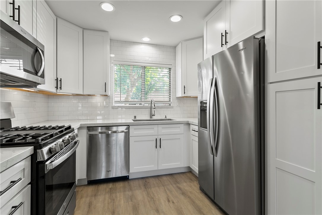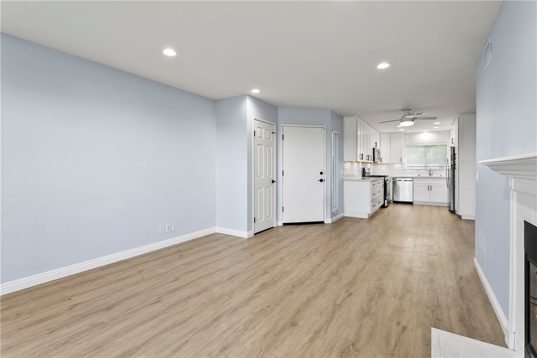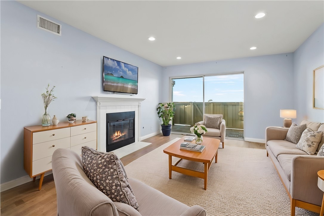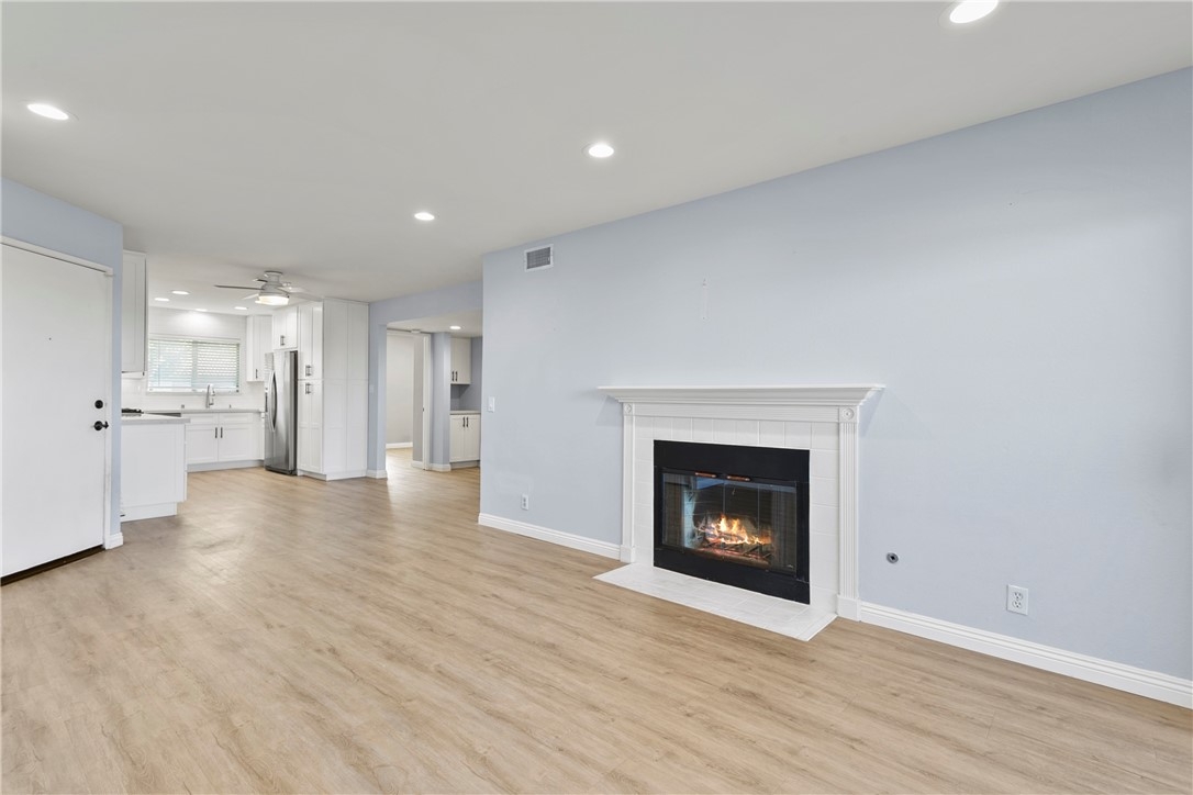 Welcome to the peaceful gated Villorio community! This light and bright single level condo offers an open floor plan with 2 bedrooms and 2 bathrooms. Upon entering, you will be greeted by a tastefully remodeled kitchen, complete with ample cabinet space, soft close cabinet doors and drawers, sleek quartz countertops, under-cabinet lighting, appliances, and a stylish ceramic tile backsplash. This home boasts a cozy fireplace and luxury vinyl flooring throughout. The primary bathroom has been revamped with newer flooring, cabinetry, and a modernized shower. Additionally, PEX plumbing was installed in 2023. Enjoy the private patio, great for entertaining guests, sipping morning coffee, or relaxing and enjoying the view! Plus, a single-car garage with plenty of storage is conveniently located near the unit, with additional open parking. This condo is nestled in a prime location, with close proximity to the 241 Toll Road, shopping, plenty of restaurants, schools, and scenic trails—offering the perfect balance of privacy and convenience.