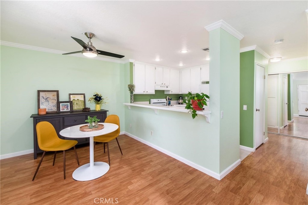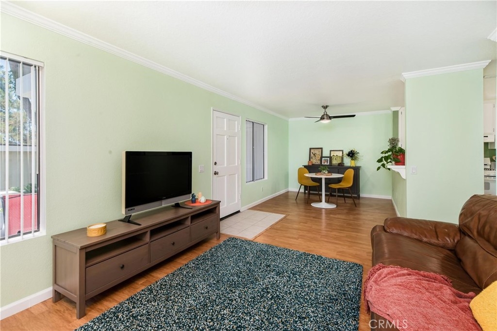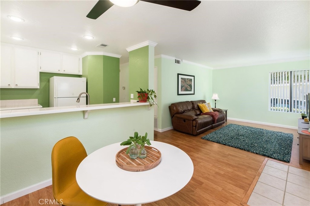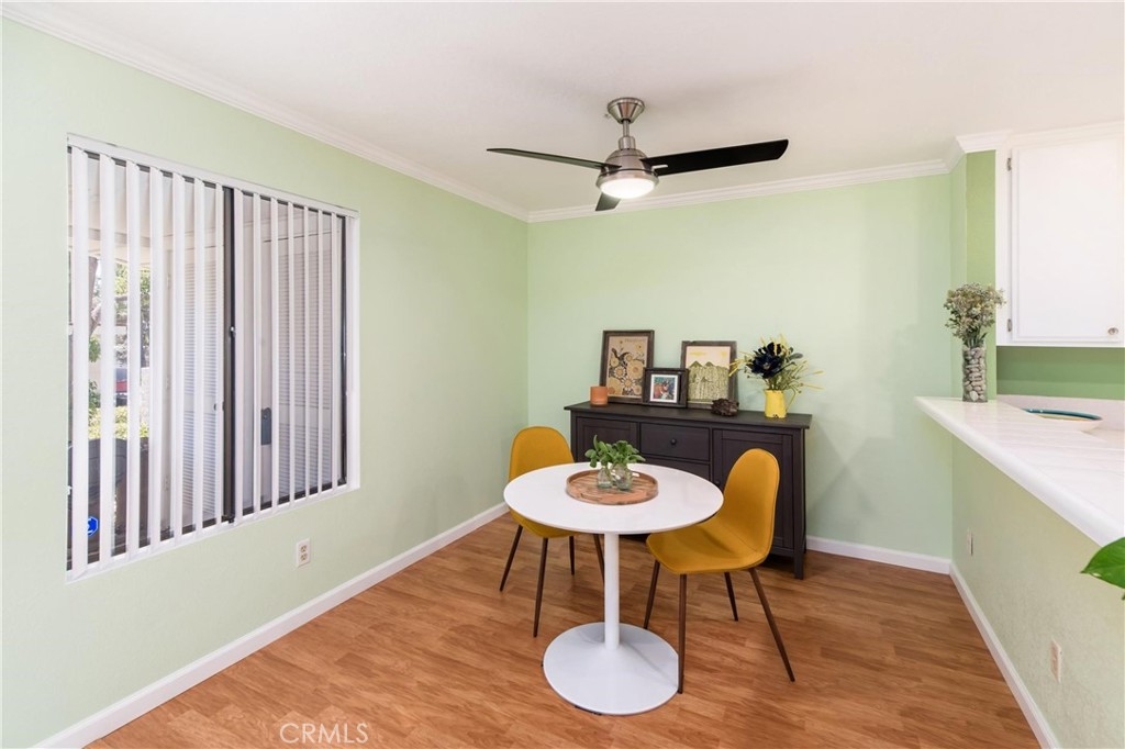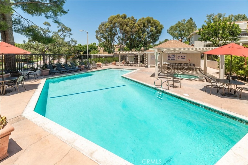 Welcome to the sought after community of White Oaks in the beautiful City of Lake Forest. This adorable ground level end unit with large, private patio is snuggled amongst a semi-secluded greenbelt. A newer water heater, new fans, laminate flooring, crown moulding and inside laundry (which includes full sized washer and dryer) are bonuses. Nicely sized Kitchen connects to the dining and living areas adding a light and airy Open Concept space. Your Carport is close by and an additional parking space available, with a pass. Shopping, dining, banks, freeways, toll roads, beautiful Rimhurst Park and distinguished schools are conveniently located nearby. Low tax rate and no mello roos. This is an amazing opportunity as this floorplan is rarely available for sale.