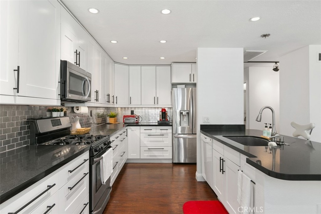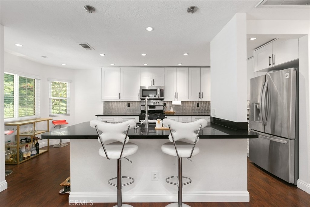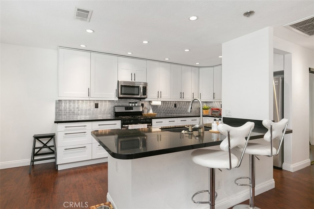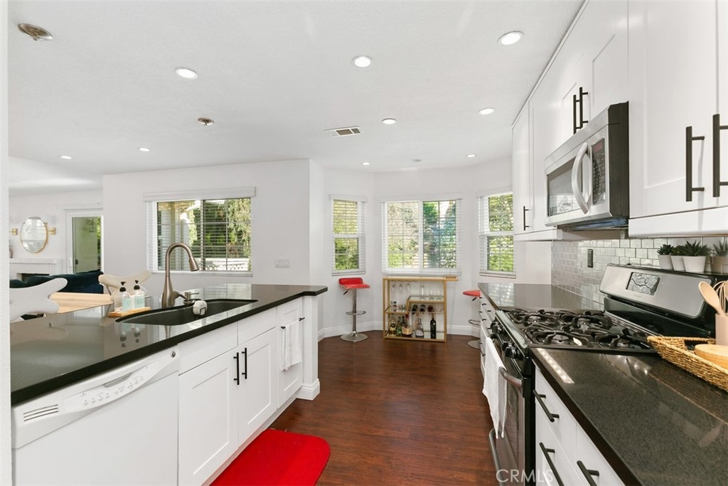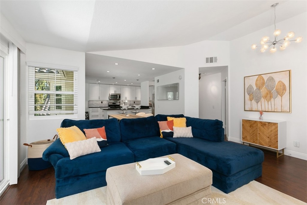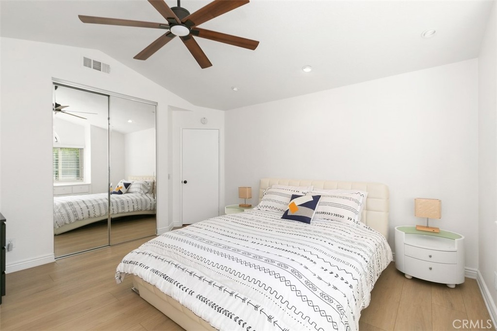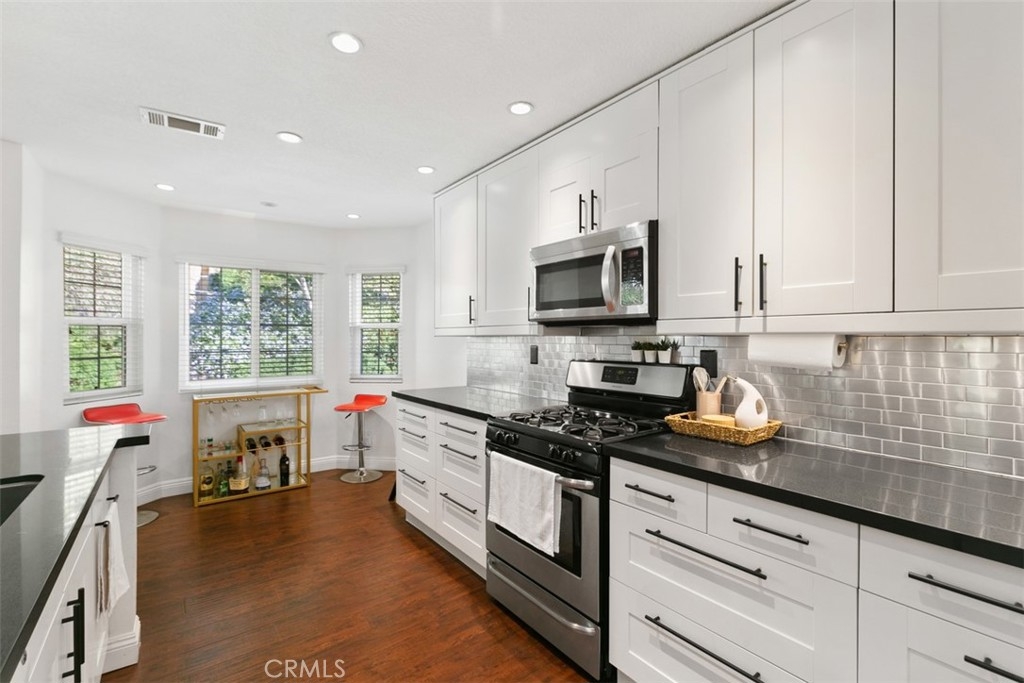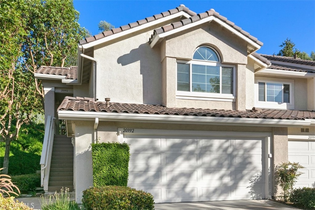 Welcome home to the most upgraded 3 bedroom, 2 bath open floor plan in the serene Willow Glen community. Your home comes fully equipped with newer wood look floors, a large galaxy granite kitchen island, white shaker cabinets, subway tile backsplash, stainless steel appliances, recessed lighting, upgraded bathrooms, dual pane vinyl windows, ceiling fan lights, and vaulted ceilings. This upstairs single story unit provides plenty of natural light and faces the community maintained greenbelt hill. A 2 car detached garage belonging to the unit has ample storage and is located directly below the front of the unit. 2 of the bedrooms have walk in closets, one of which is the primary suite with its own bathroom with a walk in full tile shower. Other features include, HVAC, recessed lighting throughout, dual pane vinyl windows, a rear private patio perfect for entertaining, inside laundry in the hallway hidden by folding doors, and upgraded bathrooms. The HOA recently updated the community in the last couple of years. The community is conveniently located just a short drive to shopping centers, restaurants, parks, and the major transportation corridor here in Orange County.